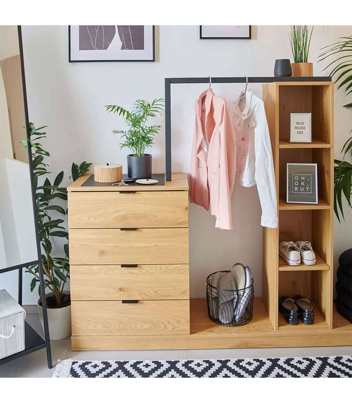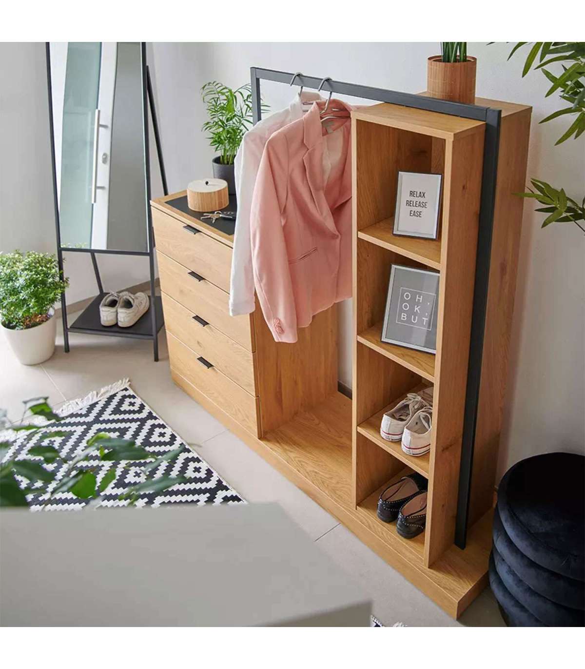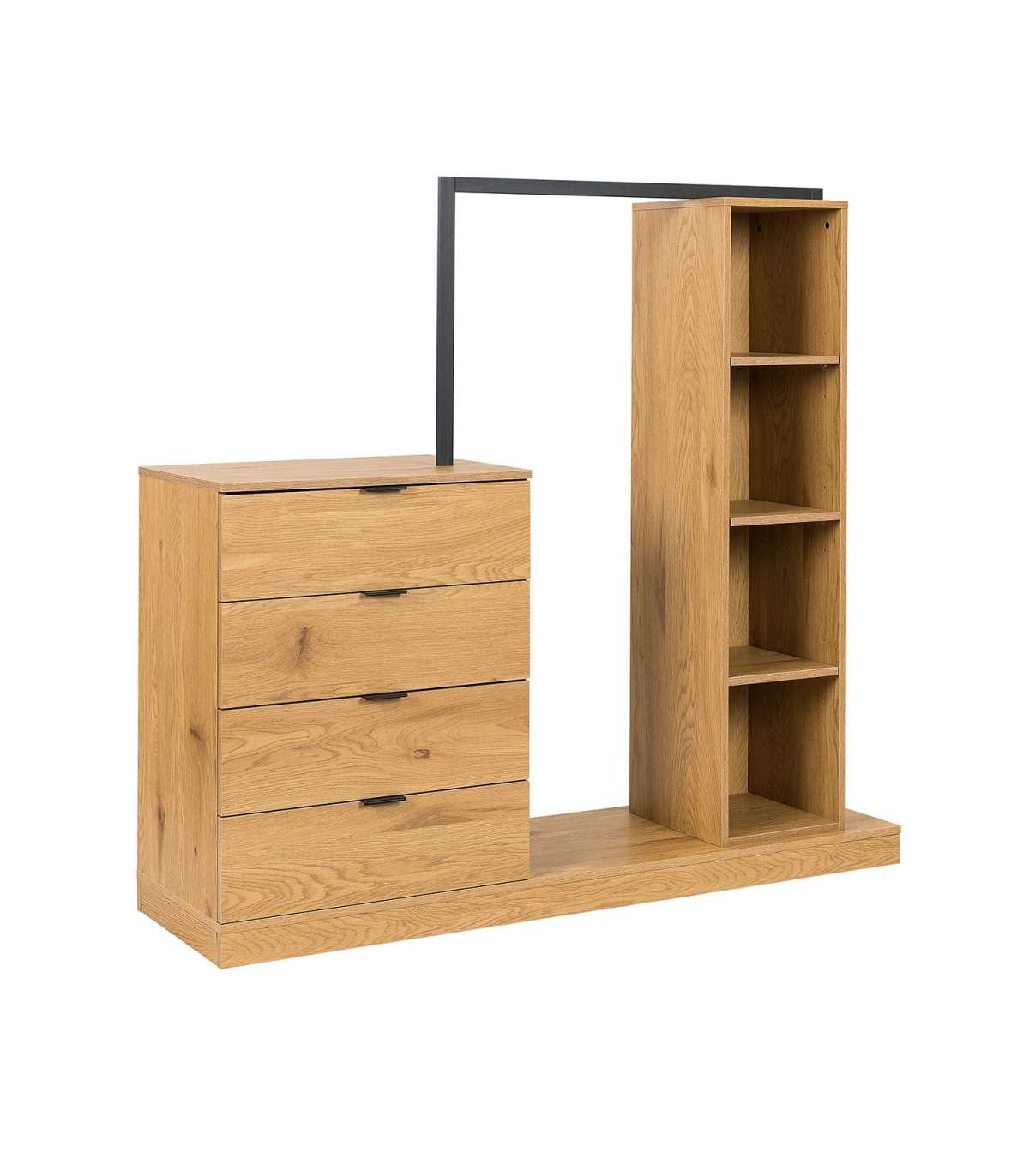 Esikumööbel NOVA 145x40xH137cm, tamm/must. Mööbel on valmistatud tammedekooriga melamiinplaadist. Esikus vajaminevate asjade paigutamiseks on 4 sahtlit, 4 avatud riiulit ja stange riiete riputamiseks. Stange on valmistatud metallist ja viimistletud musta pulbervärviga.