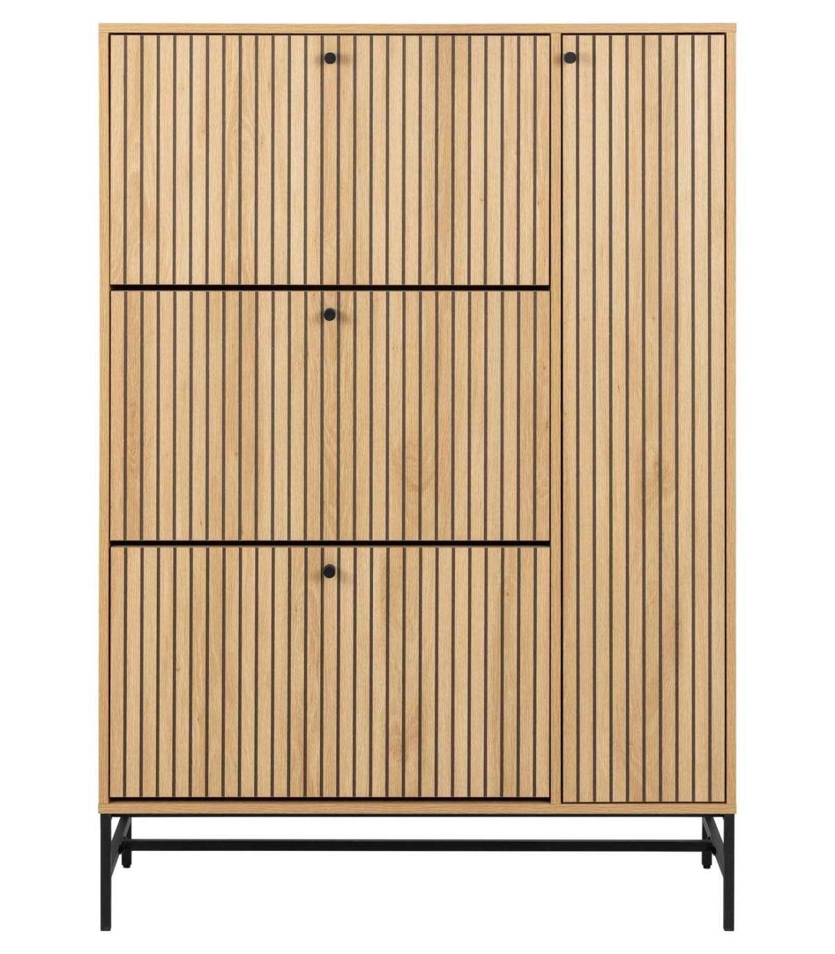 Jalanõudekapp muudab iga esiku stiilsemaks ja lisab praktilisust. Kapp aitab ruumi efektiivselt kasutada ja hoida jalanõud silma alt ära. Kapp on valmistatud tamme melamiinist. Alus on valmistatud mattmustast pulbervärvitud terasest. Mõõdud 98,7x35xH140,4cm.