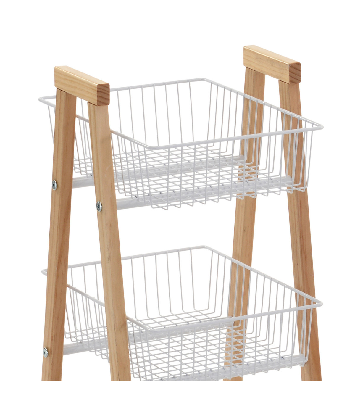 Функциональная трехуровневая полка подходит как для хранения вещей в прихожей, так и для использования в кладовой. Полка на колесиках, что облегчает ее перемещение. Каркас полки изготовлен из массива сосны натурального цвета. Три корзины полки изготовлены из стальной проволоки и покрыты белой порошковой краской. Размеры полки 32x37xH81см.