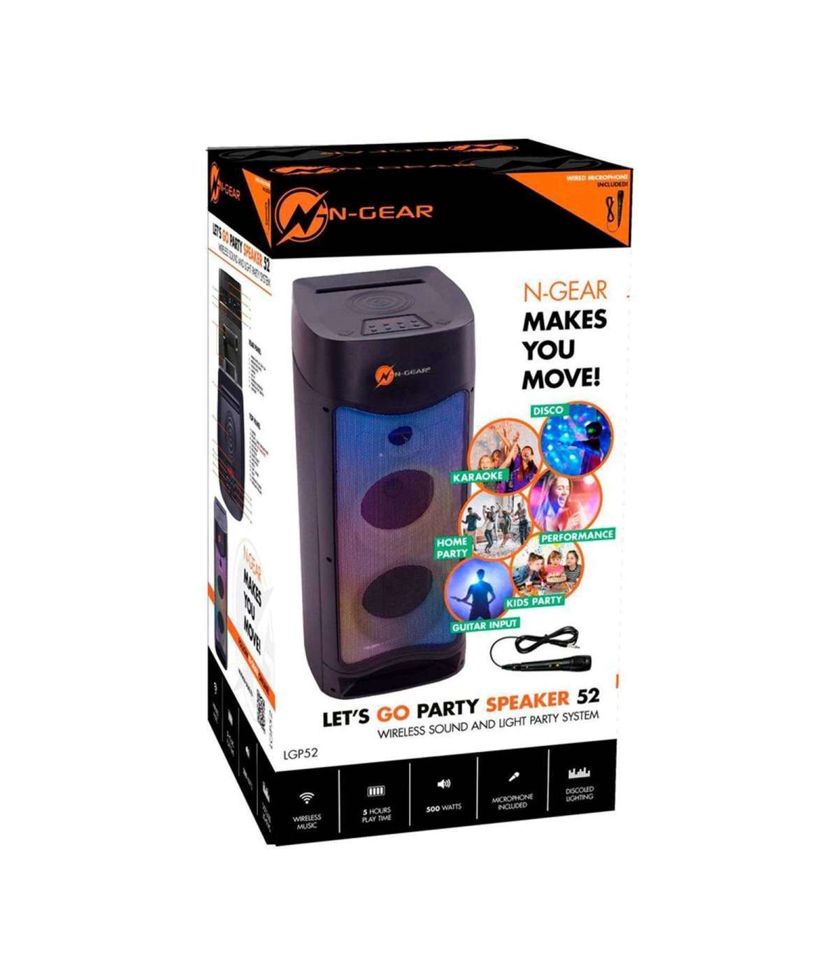 With the Let's Go Party 52 Speaker from N-GEAR you have the party on your hand! Thanks to the handle and wheels, you can take the party with you wherever you go. The Let's Go Party Speaker has two 5 "inch woofers, a power of 500 Watt and a playing time of up to 4 hours on a fully charged battery! Connect your phone or tablet via Bluetooth and sing along with your favorite songs via the included microphone. disco lighting in the woofers, which synchronizes with the music, makes your party complete.