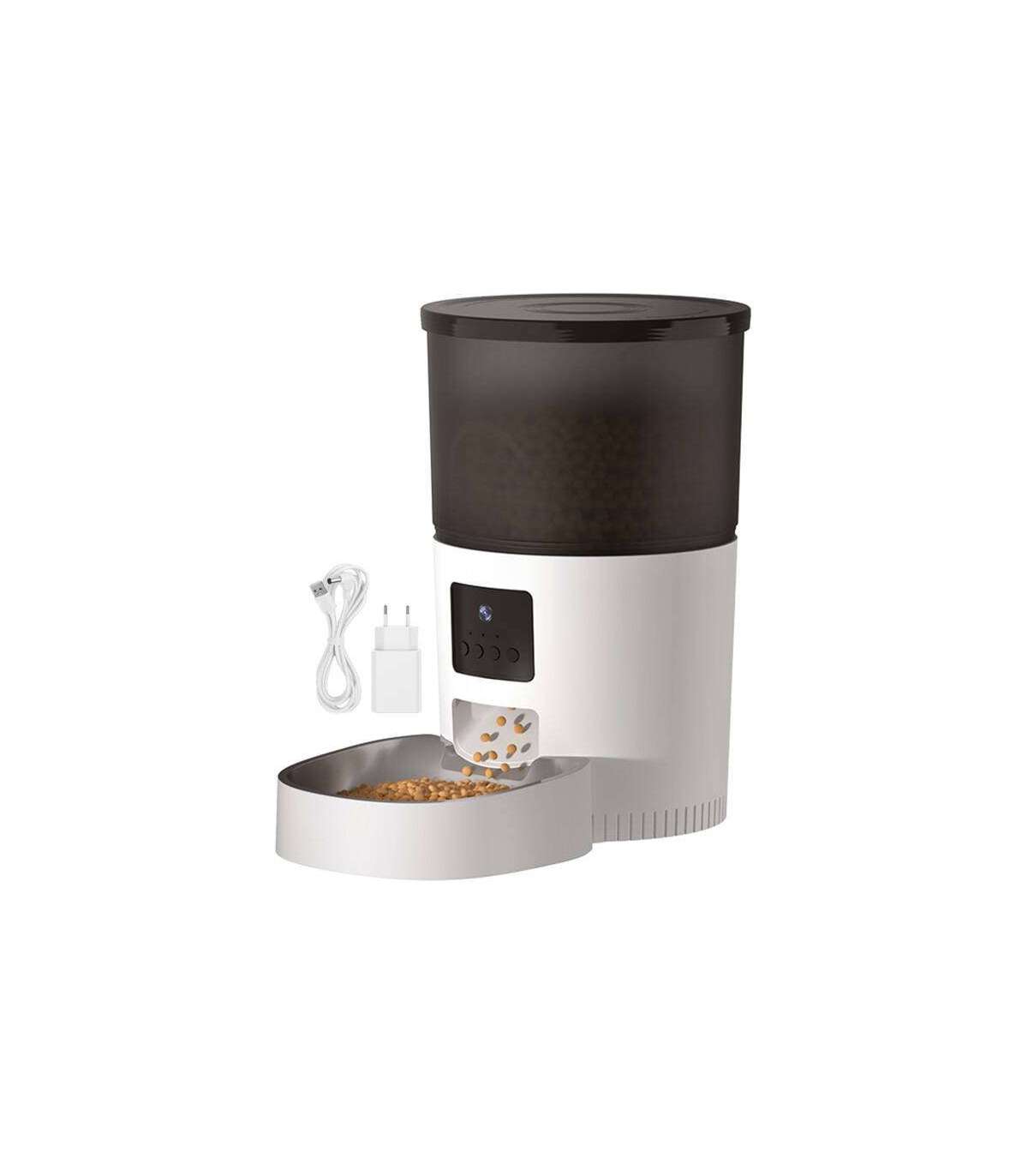 The Rojeco smart pet food dispenser uses Wi-Fi, comes with a 3L reservoir and a 720p camera with a 115° viewing range that allows you to record your pet and take photos. So you can keep an eye on your furry friend and interact with it even when you're away from home. With the built-in speaker and microphone, you can give your pet commands and record a voice message of up to 10 seconds to encourage him to eat at mealtime. From the app, you will create an editable eating plan. You'll power the device in 2 ways, and it's easy to use and maintain.