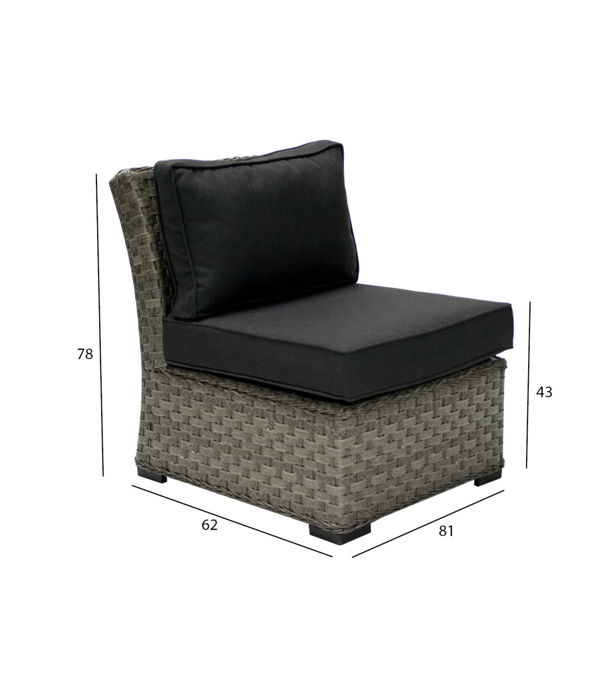 Средняя часть модульного дивана GENEVA с подушками 62x81xH78см, рама: алюминий с плетением из пластика. Продукт долговечен в меняющихся погодных условиях и очень прост в уходе. Чтобы продлить срок службы уличной мебели, мы рекомендуем использовать чехлы для уличной мебели. ХРАНЕНИЕ: в конце летнего сезона рекомендуем хранить садовую мебель в помещении. Очистите и высушите мебель перед хранением. Используйте для хранения прохладное, сухое, хорошо проветриваемое помещение.