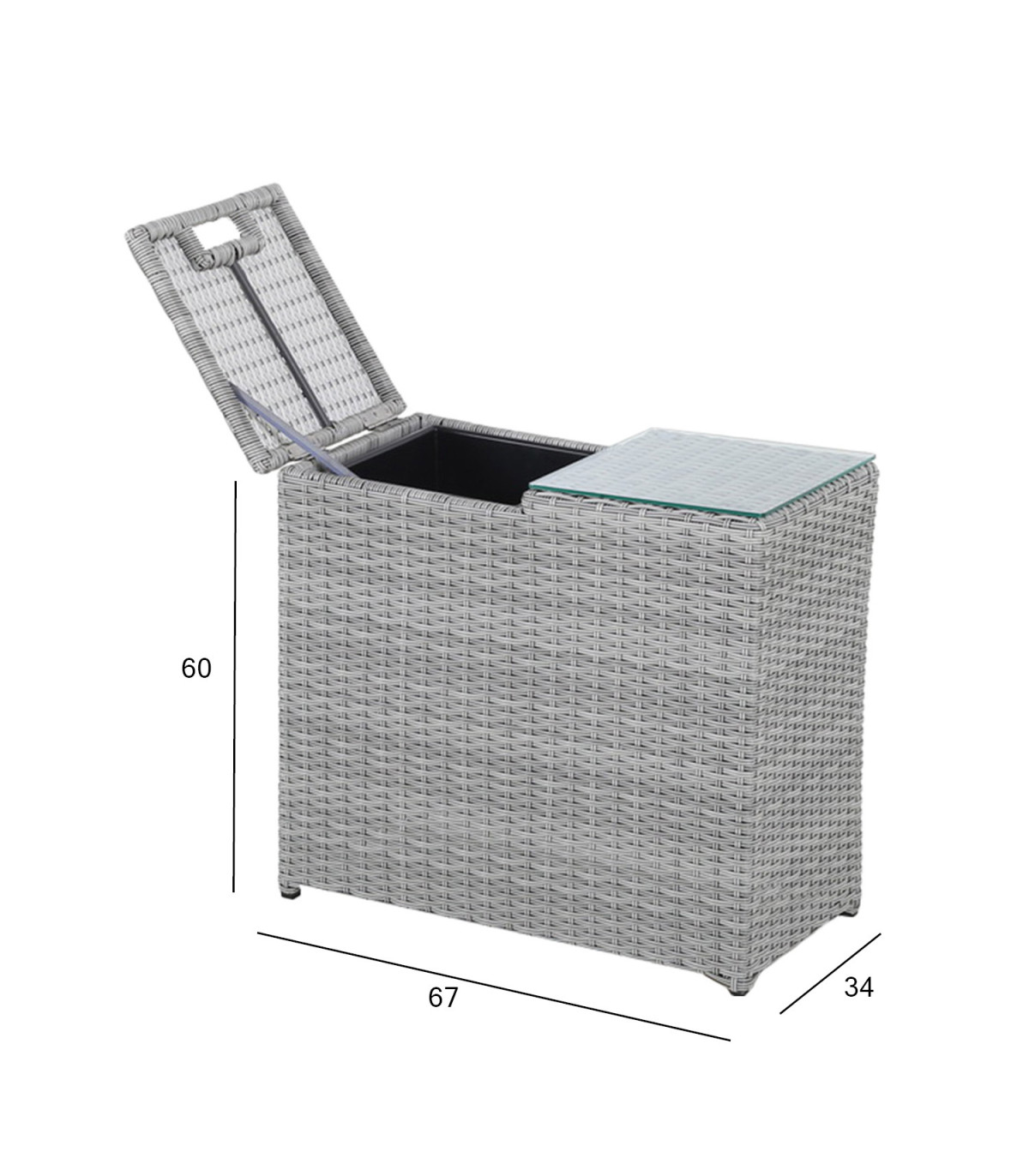 Приставной столик ASCOT можно комбинировать со всеми другими продуктами той же серии. В качестве практической дополнительной функции внутри стола помещается емкость для льда, которую также можно использовать как складское помещение. Каркас стола изготовлен из алюминия и обтянут пластиковым плетением. Размеры стола 67x34xH60, столешница: 5мм прозрачное закаленное стекло 33x33см. Продукт долговечен в меняющихся погодных условиях и очень прост в уходе. Чтобы продлить срок службы уличной мебели, мы рекомендуем использовать чехлы для уличной мебели. ХРАНЕНИЕ: в конце летнего сезона рекомендуем хранить садовую мебель в помещении. Очистите и высушите мебель перед хранением. Используйте для хранения прохладное, сухое, хорошо проветриваемое помещение.