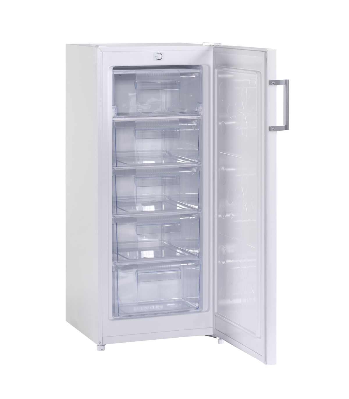The freezer has 4 transparent drawers and 1 shelf with a flap.