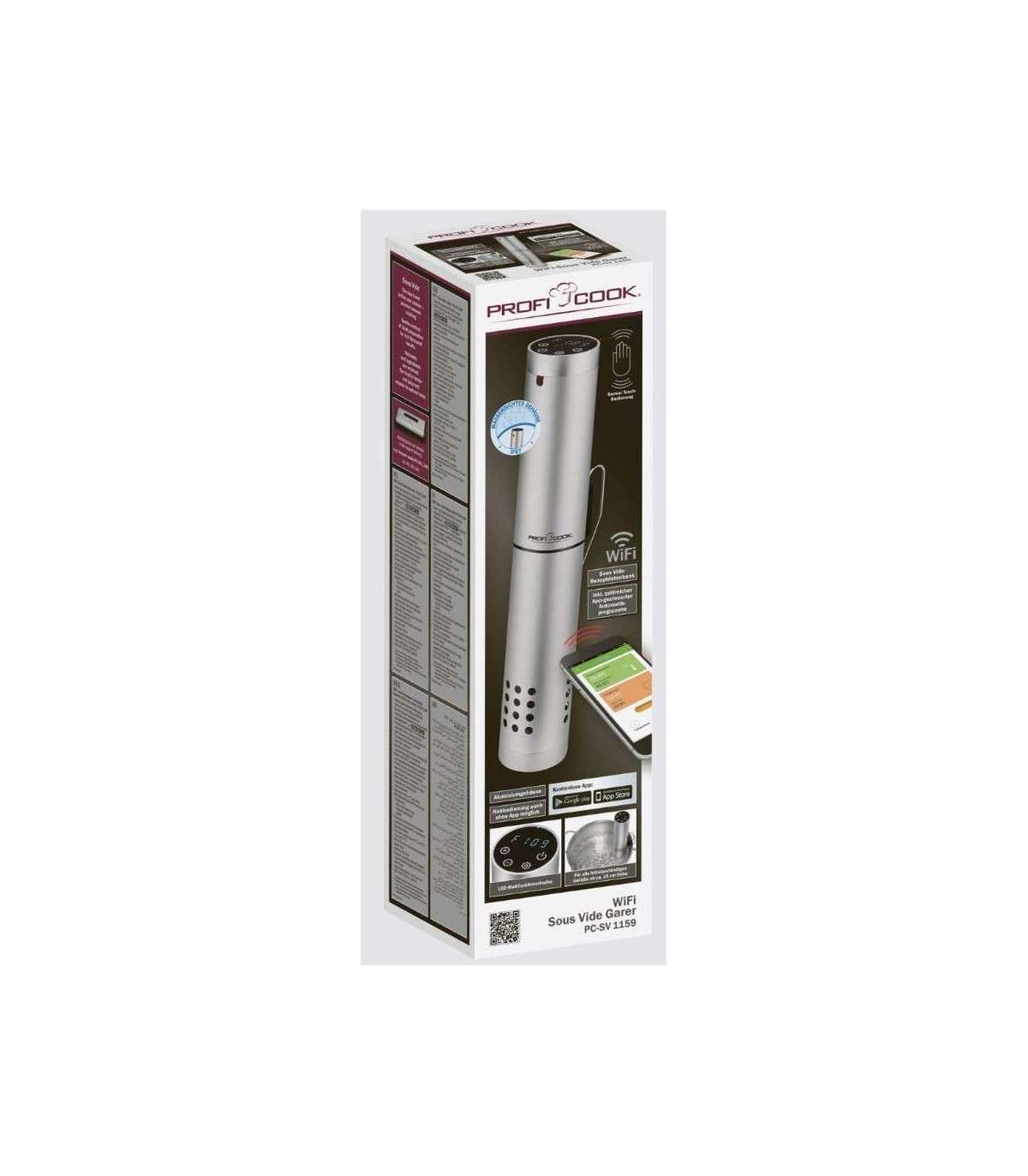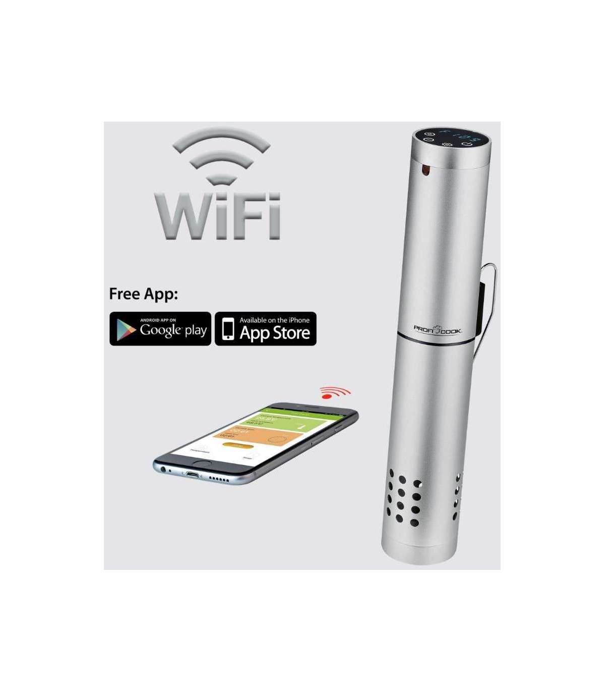 The ProfiCook Sous Vide Stick PCSV1159, with its waterproof aluminum housing and integrated clamp, enables precise cooking via app thanks to its Wi-Fi and timer functions.