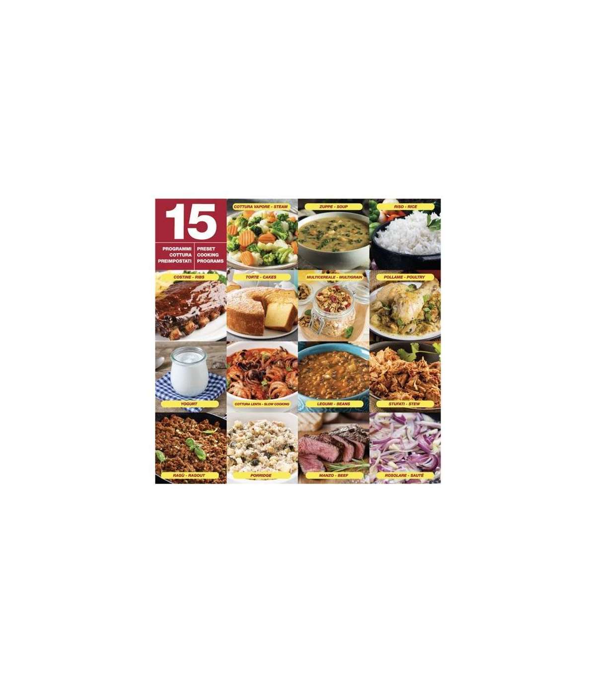 15 предустановленных программ предлагают широкий выбор блюд: от закусок и основных блюд до гарниров и десертов.