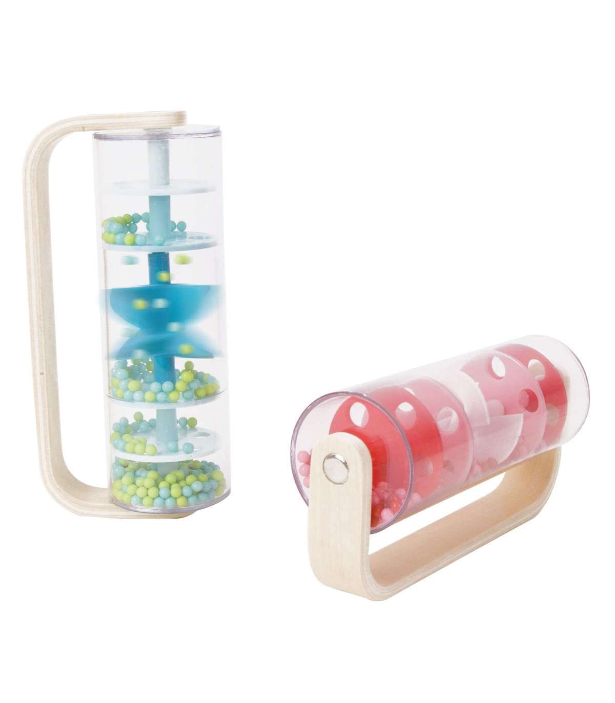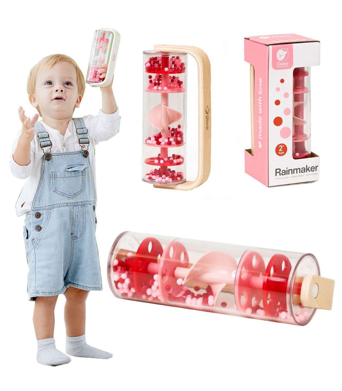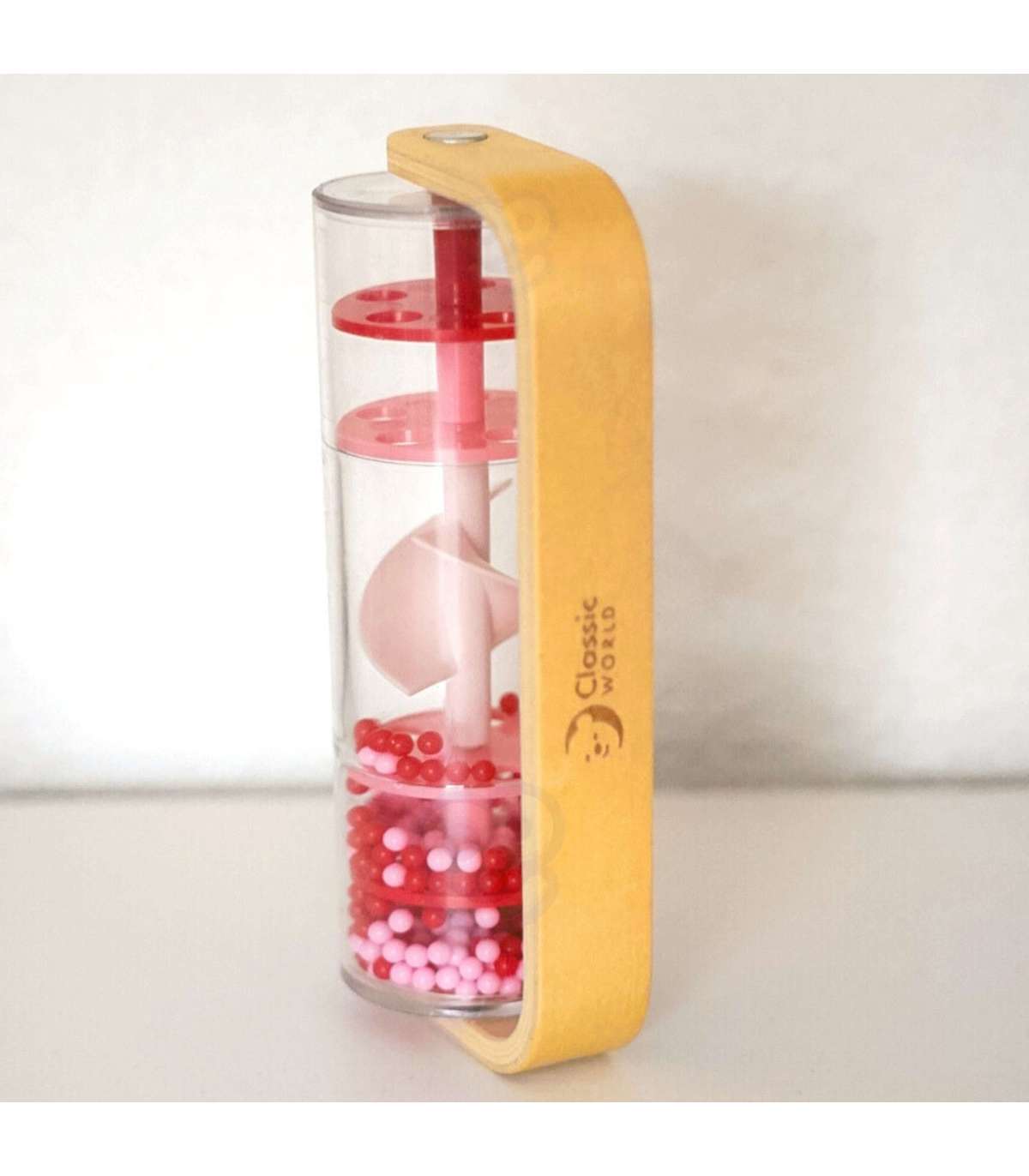 Деревянно-пластиковая красная дождевальная игрушка с шариками бренда CLASSIC WORLD с переливающимися шариками, создающими успокаивающий звук падающего дождя. Потряси, поверни и покрути, посмотри, как бусины опускаются сверху вниз. Одним быстрым захватом вы можете превратить эту игрушку в погремушку, которая вращается на 360 градусов. Отличное предложение для сенсорного развития. Идеальный реквизит для занятий по ритмике.