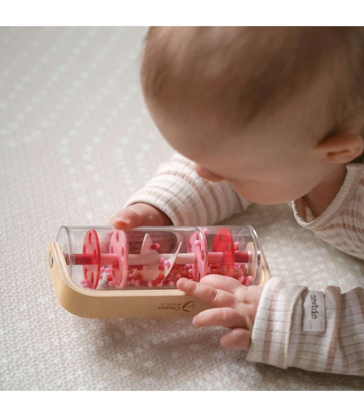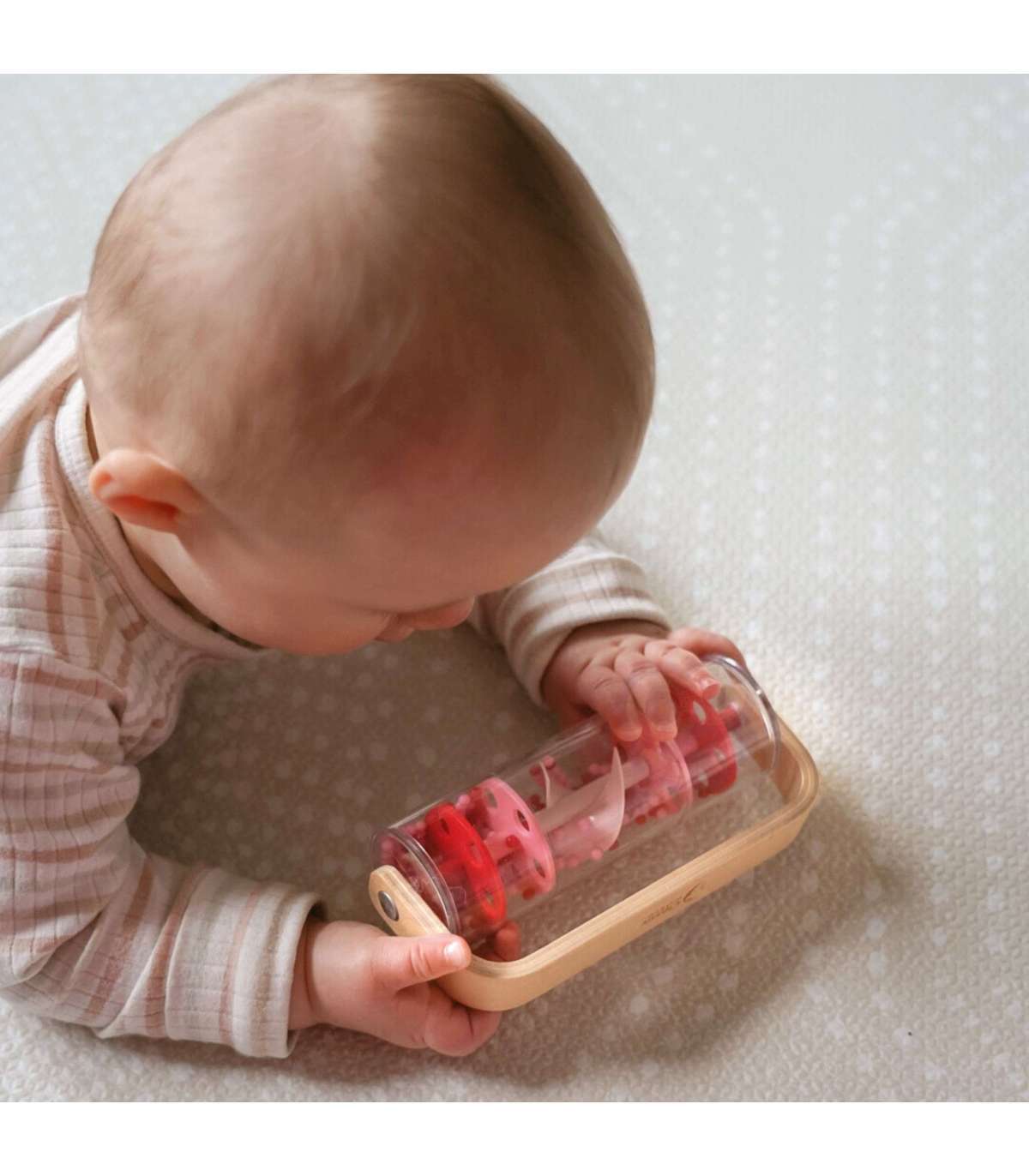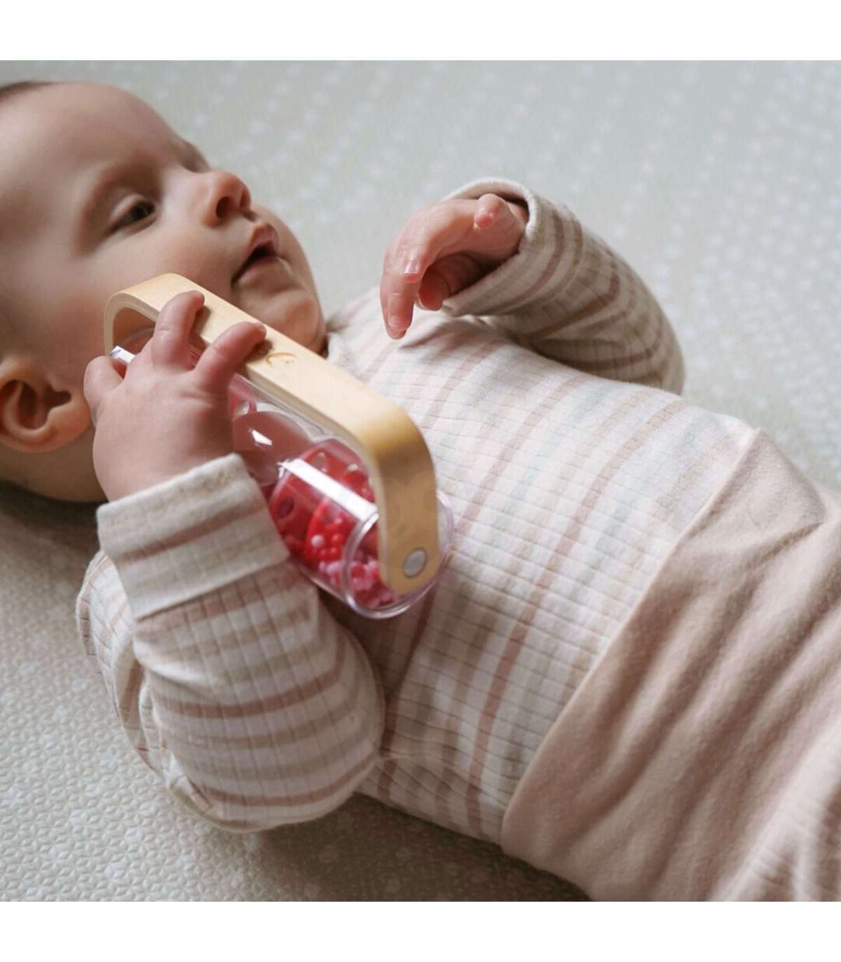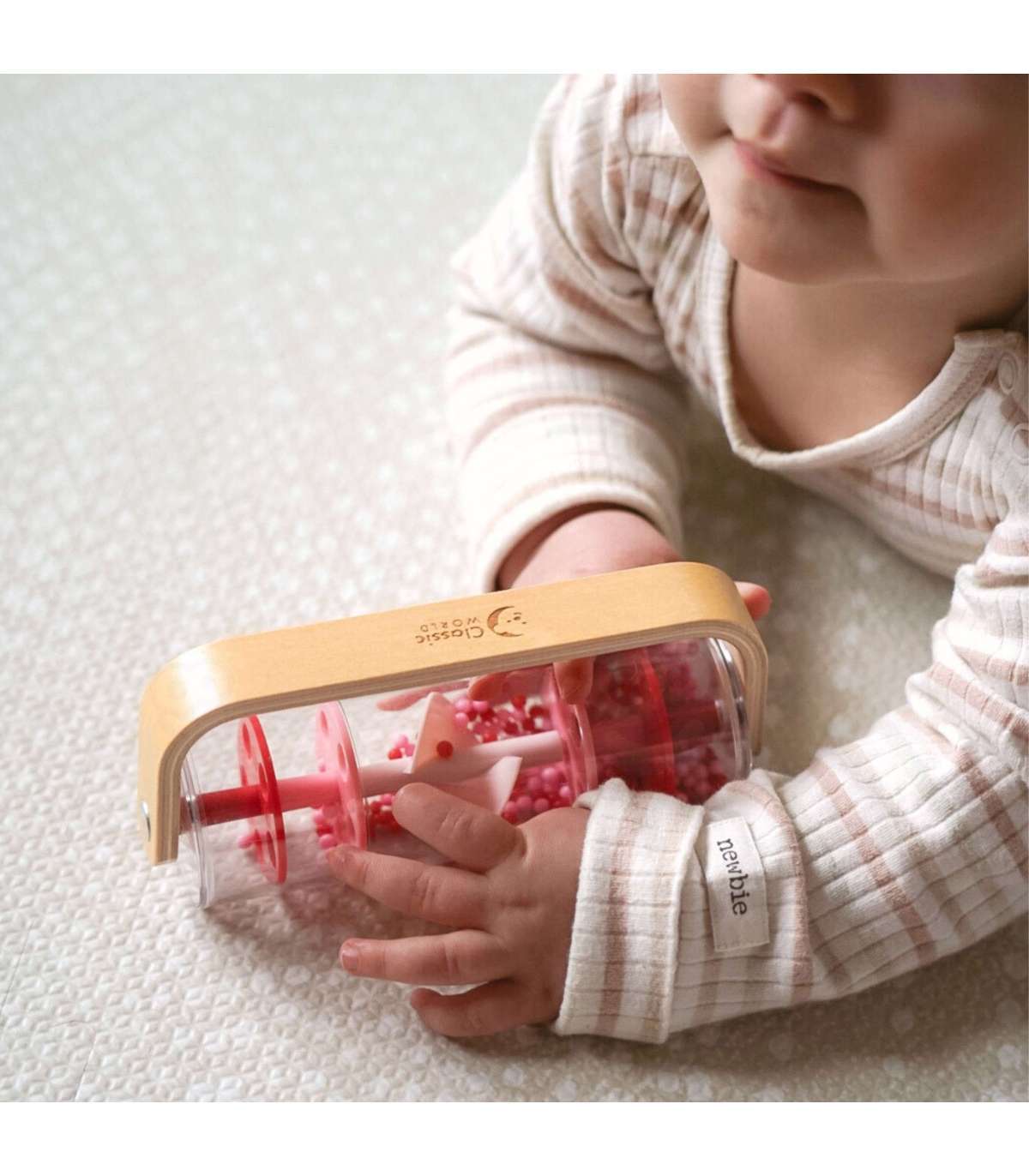 Деревянно-пластиковая красная дождевальная игрушка с шариками бренда CLASSIC WORLD с переливающимися шариками, создающими успокаивающий звук падающего дождя. Потряси, поверни и покрути, посмотри, как бусины опускаются сверху вниз. Одним быстрым захватом вы можете превратить эту игрушку в погремушку, которая вращается на 360 градусов. Отличное предложение для сенсорного развития. Идеальный реквизит для занятий по ритмике.