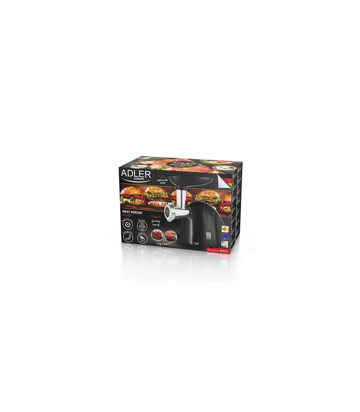 Adler | Meat mincer | AD 4811 | Black | 600 W | Number of speeds 1 | Throughput (kg/min) 1.8 | 3 replaceable sieves: 3mm for grinding poppies and preparing meat and vegetable stuffing; 5mm for meatballs, Roman roast and beef burgers; 7mm for coarsely ground sausages, offal sausages and pates; Charging tray; Pusher