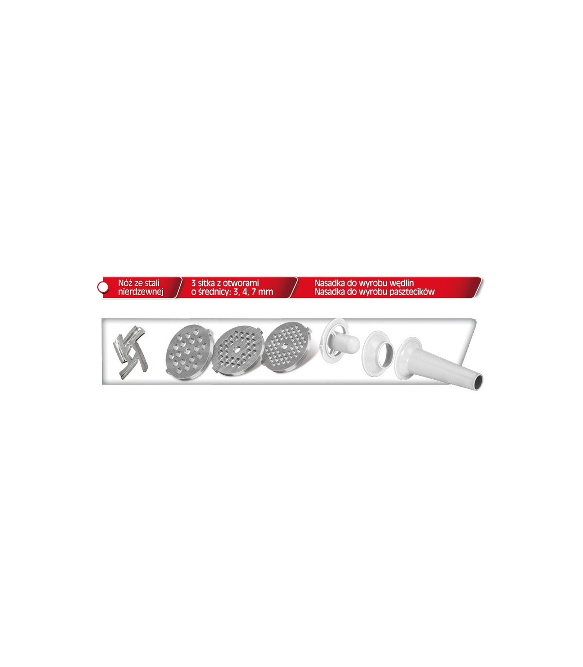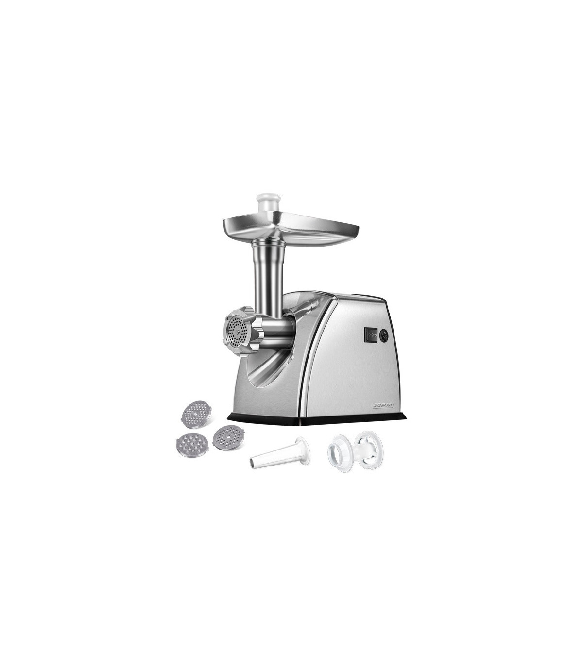 Мясорубка сделана из нержавеющей стали и оснащена воронкой для загрузки и трубой, а также насадками для переработки колбасы и приготовления пирожков. У прибора есть реверс, нож из нержавеющей стали и 3 сита (3 мм, 4 мм и 7 мм). Ножки сделаны из противоскользящего материала и сигнализацией, позволяющей избежать засоров. Мясорубку очень просто собирать и разбирать. Мощность - 1800 W.