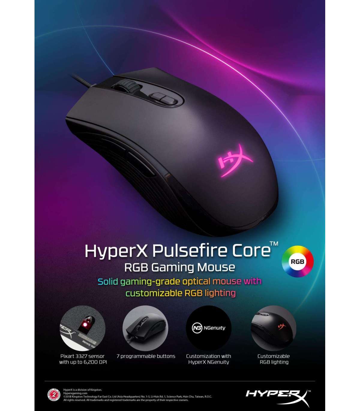 The HyperX Pulsefire Core™ delivers the essentials for gamers looking for a solid, comfortable, wired RGB gaming mouse. The Pixart 3327 optical sensor gives players precise, smooth tracking with no hardware acceleration, and has native DPI settings up to 6200 DPI. The ergonomically-designed Pulsefire Core has textured side grips for a comfortable, no-slip grip, and its symmetrical shape is suitable for both palm and claw grip. It features high-quality switches with crisp tactile feedback rated for up to 20 million clicks. Customize lighting, DPI settings, and macros for 7 programmable buttons with HyperX NGENUITY software and set your mouse up just the way you want it. The large skates on Pulsefire Core help deliver accurate aiming by giving you a smooth, controlled glide as you move the mouse.