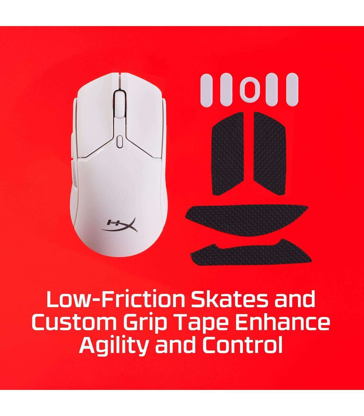 - Have ultimate confidence in your control with the smooth effortless glide of HyperX’s low-friction skates, and 4 pieces of custom, residue-free HyperX grips to help provide a secure hold.