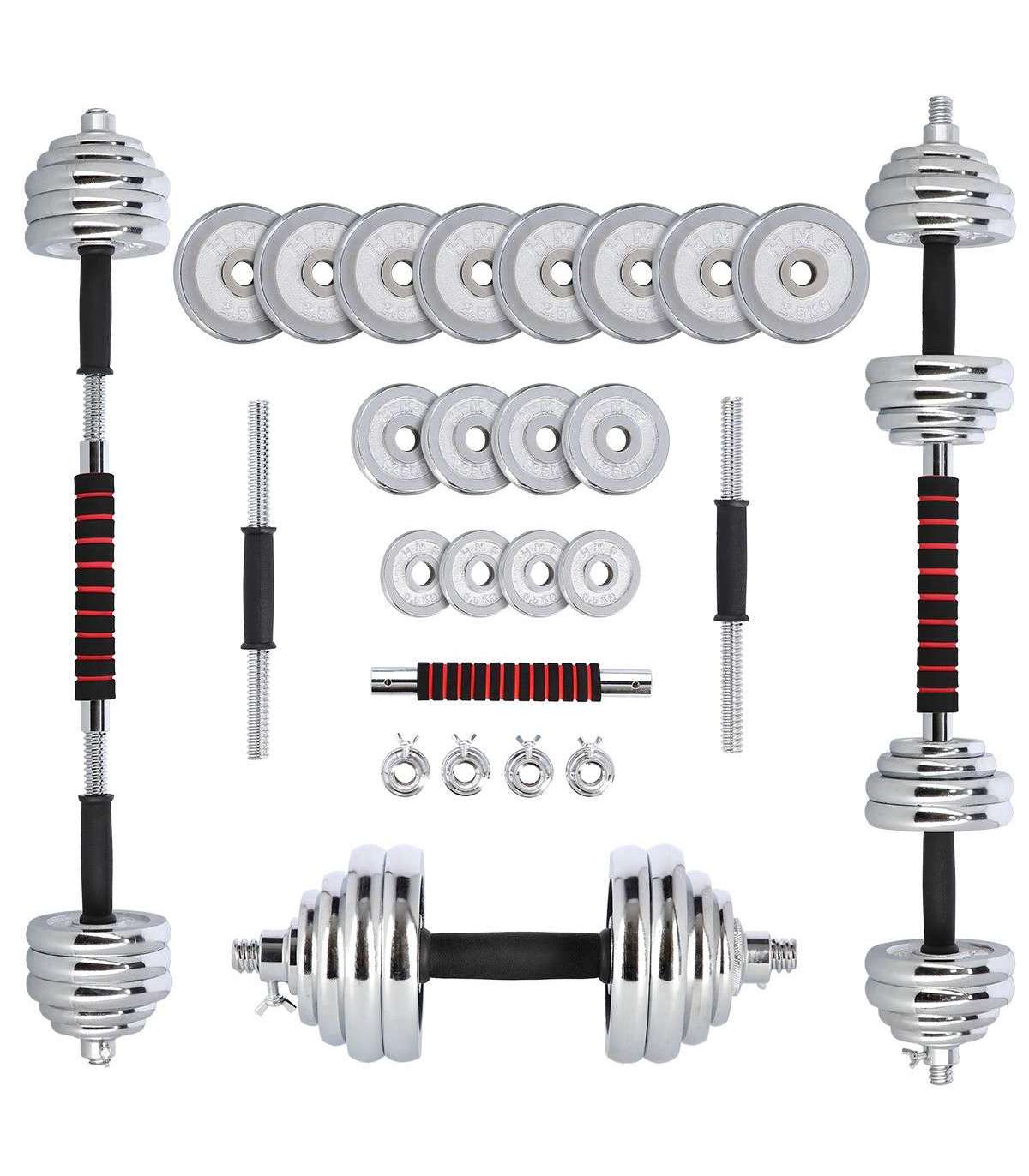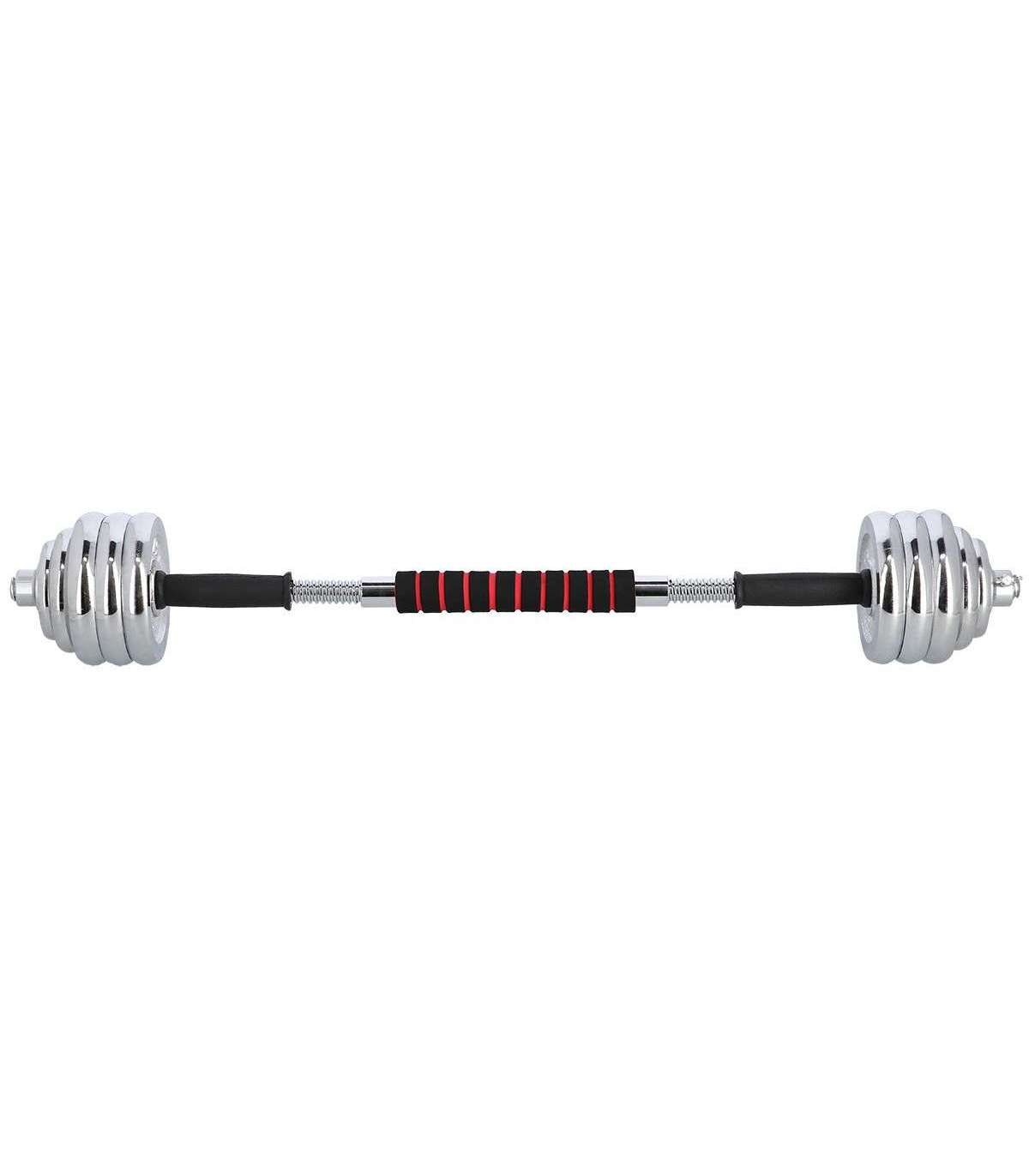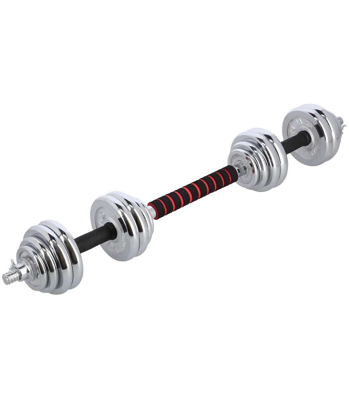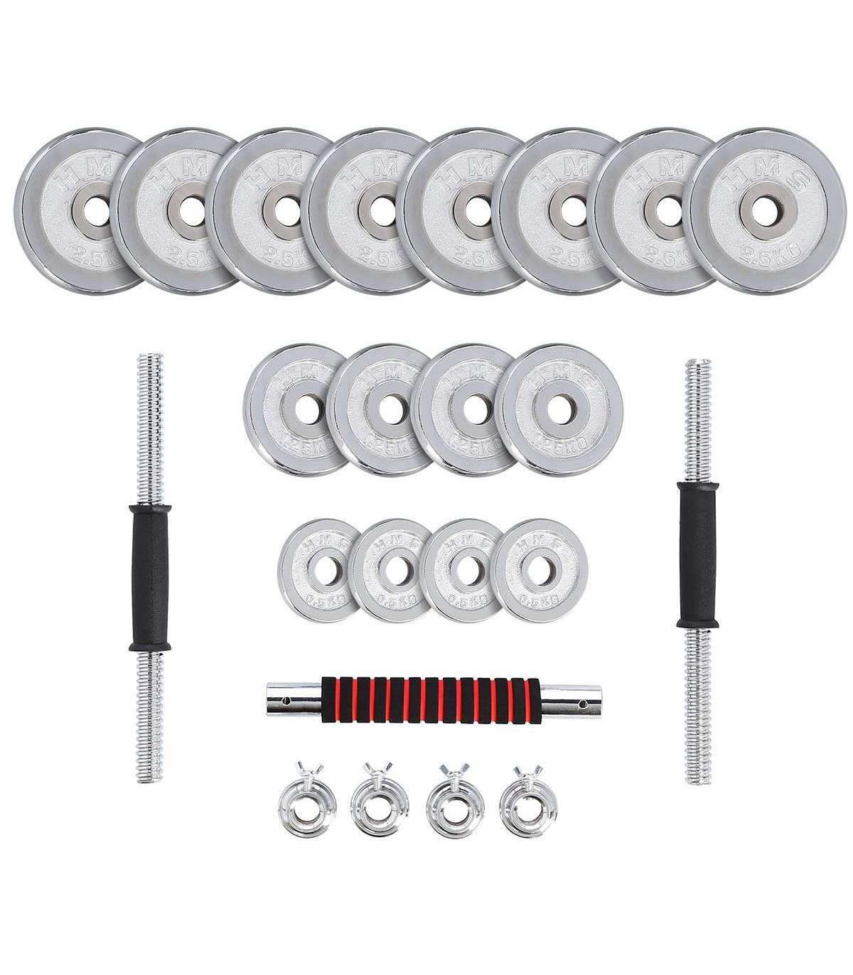 A dumbbell with replaceable weights is a classics and, at the same time, a must have for every home gym. The STC30 HMS is a set of two chromium-plated steel dumbbells. However, they can be joined together to form a bar.High quality chrome-plated steel guarantees high strength and it ensures long-term life of the equipment. Clamps and perfectly fitting diameter of the weight hole make it easier to replace the load quickly and to ensure robust position on the bar. The clamps are threaded, but they also have additional protection which is a tightening screw. Hence, the weighs do not shift in any way during a workout.Due to a special extension it is possible to join two short bars into a long one. This innovative solution significantly extends the range of possibilities. A user can have a barbell to do exercises that are not possible or not comfortable when using dumbbells. Having one product, we can use two.The set comprises two bars, four clamps, bars connection system and total no. of 16 weights. All of these in a comfortable suitcase.The product is suitable for both, advanced users and beginners. Start your training today, the STC30 HMS is an ideal choice for a home gym.Specification:Material: chromed steelDimensions of the barLength: 38 cmDiameter: 25 mmGrip diameter: 34 mmDimensions of the coupling system:Length: 30 cmDiameter: 32 mmGrip diameter: 41 mmWeights:2,5 kg – 14,8 x 2,4 cm1,25 kg – 11,4 x 1,8 cm0,5 kg – 9,3 x 1,5 cmWeight of the bar: 1,2 kgWeight of the coupling system: 0,7 kgWeight of the clamp: 0,2 kgTotal weight of the set: 32 kgThe set includes:Short bar x 2Bars coupling system x 1Weights 2,5 kg x 8Weights 1,25 kg x 4Weights 0,5 kg x 4Clamps x 4Remarks:Not for the commercial use24 months warrantyImporter: Abisal Ltd. | Poland | 41-807 Zabrze | Pyskowicka Street 17 | e-mail: abisal@abisal.plAbisal Ltd.. declares that the products sold by the company are safe and meet the requirements contained in the Act on General Product Safety of December 12, 2003. (Journal of Laws of December 31, 2003)