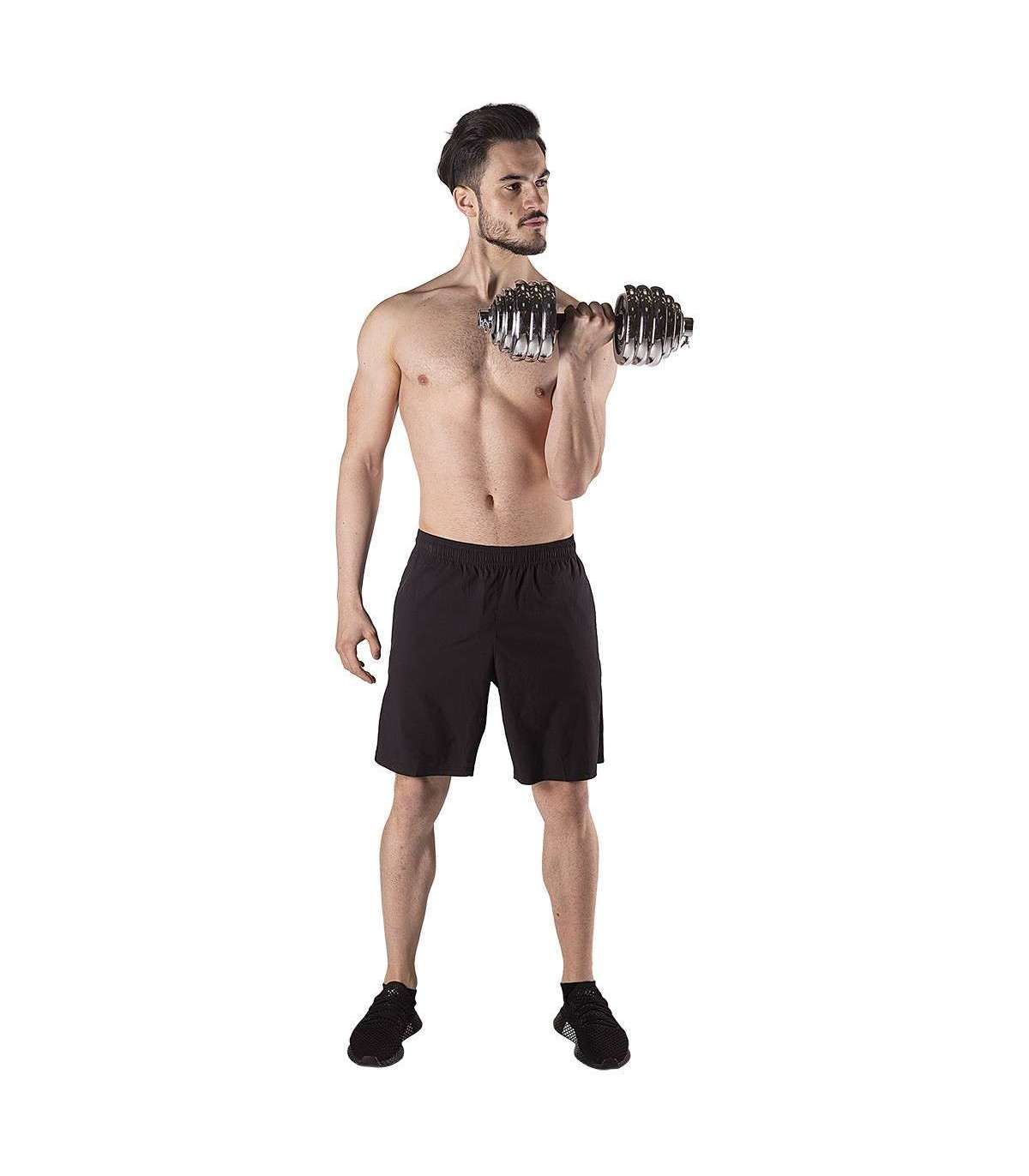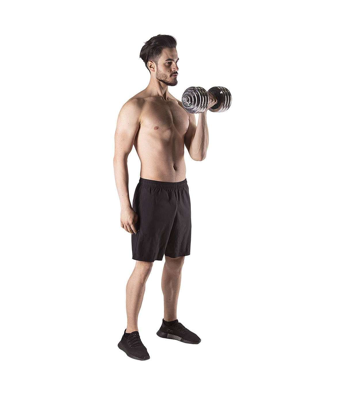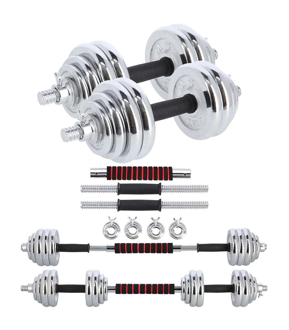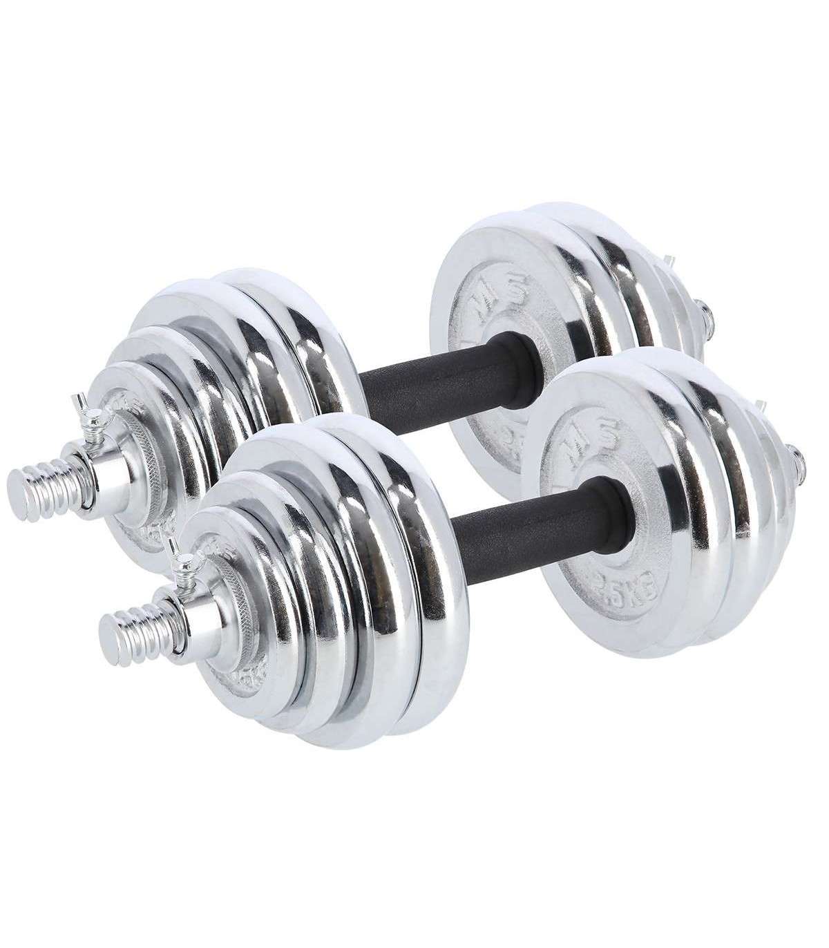A dumbbell with replaceable weights is a classics and, at the same time, a must have for every home gym. The STC30 HMS is a set of two chromium-plated steel dumbbells. However, they can be joined together to form a bar.High quality chrome-plated steel guarantees high strength and it ensures long-term life of the equipment. Clamps and perfectly fitting diameter of the weight hole make it easier to replace the load quickly and to ensure robust position on the bar. The clamps are threaded, but they also have additional protection which is a tightening screw. Hence, the weighs do not shift in any way during a workout.Due to a special extension it is possible to join two short bars into a long one. This innovative solution significantly extends the range of possibilities. A user can have a barbell to do exercises that are not possible or not comfortable when using dumbbells. Having one product, we can use two.The set comprises two bars, four clamps, bars connection system and total no. of 16 weights. All of these in a comfortable suitcase.The product is suitable for both, advanced users and beginners. Start your training today, the STC30 HMS is an ideal choice for a home gym.Specification:Material: chromed steelDimensions of the barLength: 38 cmDiameter: 25 mmGrip diameter: 34 mmDimensions of the coupling system:Length: 30 cmDiameter: 32 mmGrip diameter: 41 mmWeights:2,5 kg – 14,8 x 2,4 cm1,25 kg – 11,4 x 1,8 cm0,5 kg – 9,3 x 1,5 cmWeight of the bar: 1,2 kgWeight of the coupling system: 0,7 kgWeight of the clamp: 0,2 kgTotal weight of the set: 32 kgThe set includes:Short bar x 2Bars coupling system x 1Weights 2,5 kg x 8Weights 1,25 kg x 4Weights 0,5 kg x 4Clamps x 4Remarks:Not for the commercial use24 months warrantyImporter: Abisal Ltd. | Poland | 41-807 Zabrze | Pyskowicka Street 17 | e-mail: abisal@abisal.plAbisal Ltd.. declares that the products sold by the company are safe and meet the requirements contained in the Act on General Product Safety of December 12, 2003. (Journal of Laws of December 31, 2003)