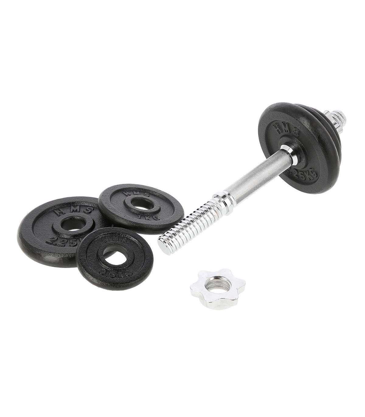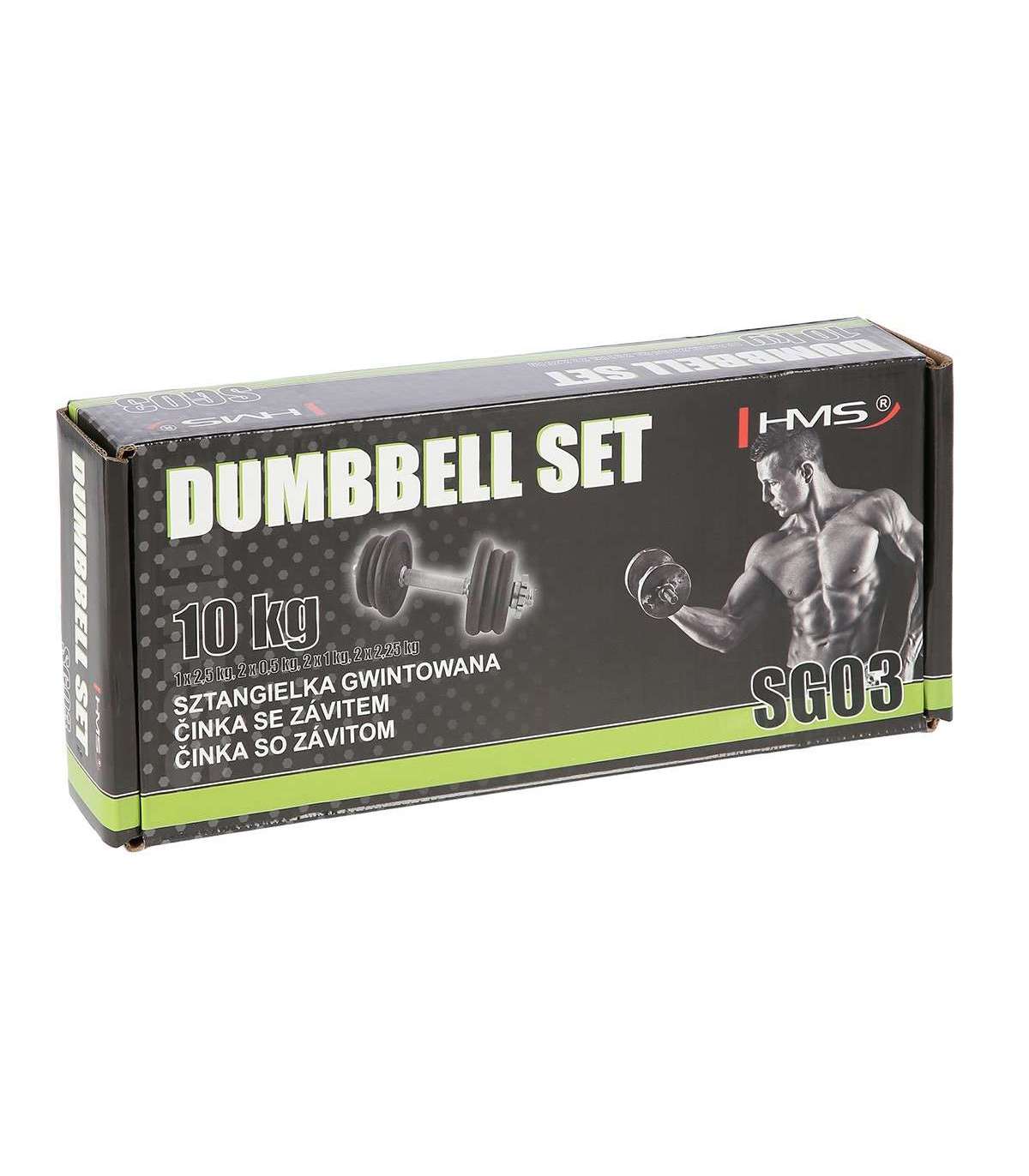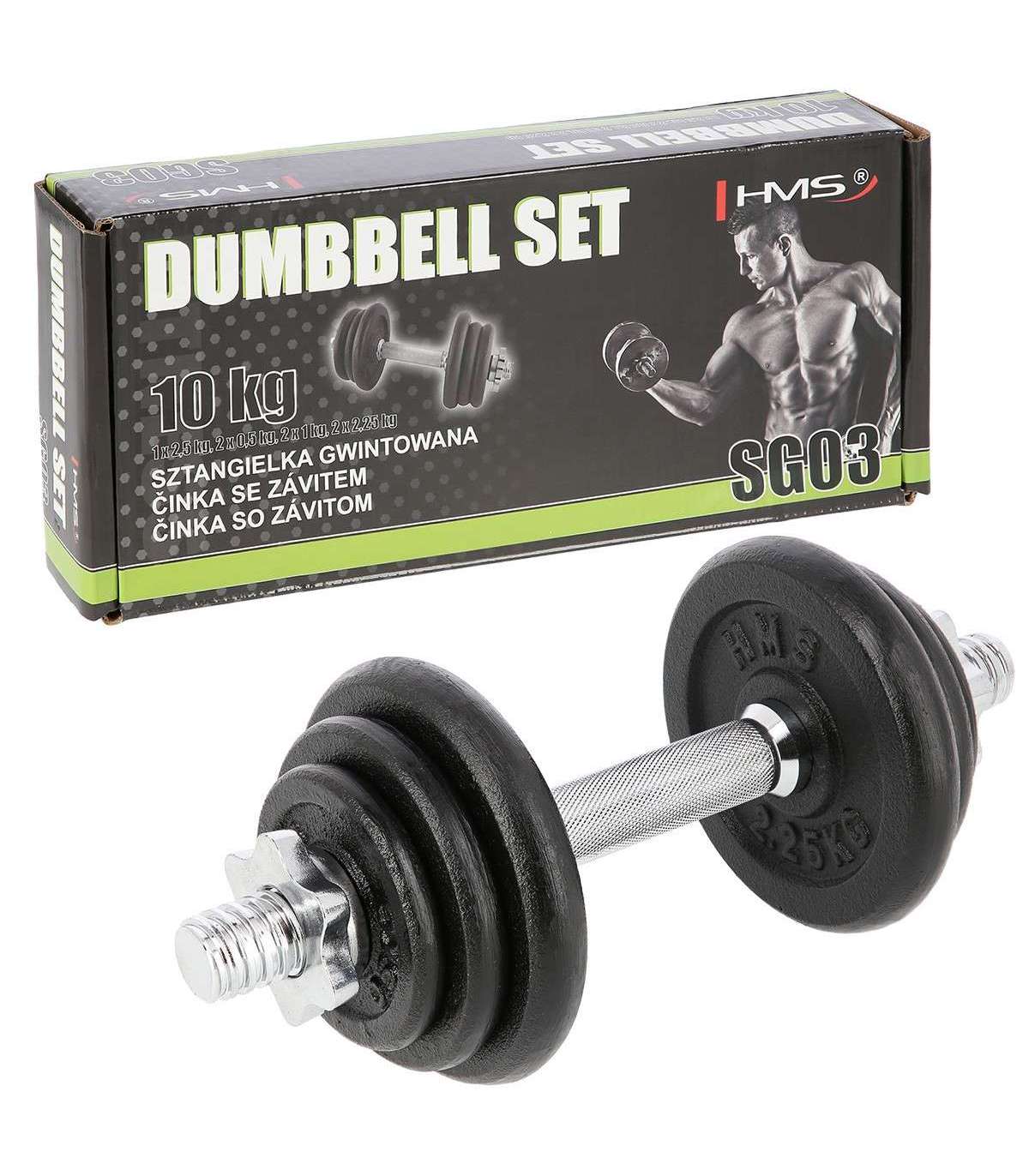 SG03 HMS – a cast iron dumbbell, made of high quality materials is a must in every home.The set includes: nickel-plated steel bar and iron cast plates.The bar has a grooved handle, so it doesn’t slip during exercise. Threaded dumbbells together with star collars guarantee an equal weight distribution.Start taking care of your body today with a 10kg dumbbell. It’s the perfect choice for both home and gym.Specification:Bar length: 35 cmBar diameter: 30 mm1 x straight bar 2,5 kg2 x plate 0,5 kg2 x plate 1 kg2 x plate 2,25 kgTotal weight: 10 kgRemarks:Not for commercial use24 months warrantyImporter: Abisal Ltd. | Poland | 41-807 Zabrze | Pyskowicka Street 17 | e-mail: abisal@abisal.plAbisal Ltd.. declares that the products sold by the company are safe and meet the requirements contained in the Act on General Product Safety of December 12, 2003. (Journal of Laws of December 31, 2003)
