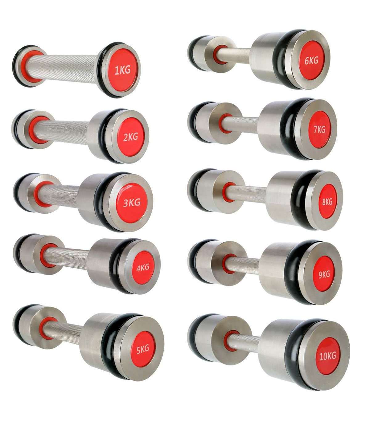 HH HMS are chrome-coated steel dumbbells. They are perfect for fitness and strength exercises. They enable workout and improvement of the upper body sections.The dumbbells are made of high-quality chrome coating which makes them resistant to abrasions and scratches. Knurled grip surface makes the dumbbells fit perfectly in your hand and prevents their slippage during the workout. Two silicone overlays on the sides prevent the surface from damage from a falling dumbbell. The tools can be stored both on the stand as well as placed on the floor. The dumbbells come in weight range from 1 to 10 kg.Specification:Material: Chrome-plated steel, siliconeGrip: KnurledAvailable weights: 1 / 2 / 3 / 4 / 5 / 6 / 7 / 8 / 9 / 10 kgLength of dumbbells: 187.5 / 219 / 251 / 267 / 280 / 298 / 302 / 304 / 310.4 / 308.4 mmDiametre of the grip part: 32 mmLength of the grip part: 133 mmRemarks:24 months warrantyImporter: Abisal Ltd. | Poland | 41-807 Zabrze | Pyskowicka Street 17 | e-mail: abisal@abisal.plAbisal Ltd.. declares that the products sold by the company are safe and meet the requirements contained in the Act on General Product Safety of December 12, 2003. (Journal of Laws of December 31, 2003)