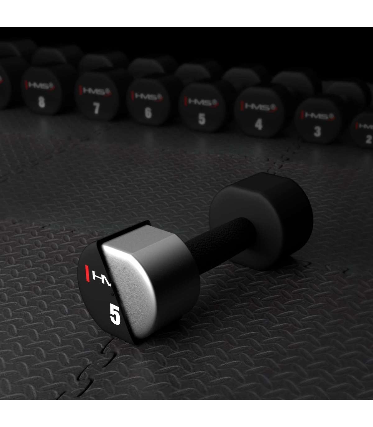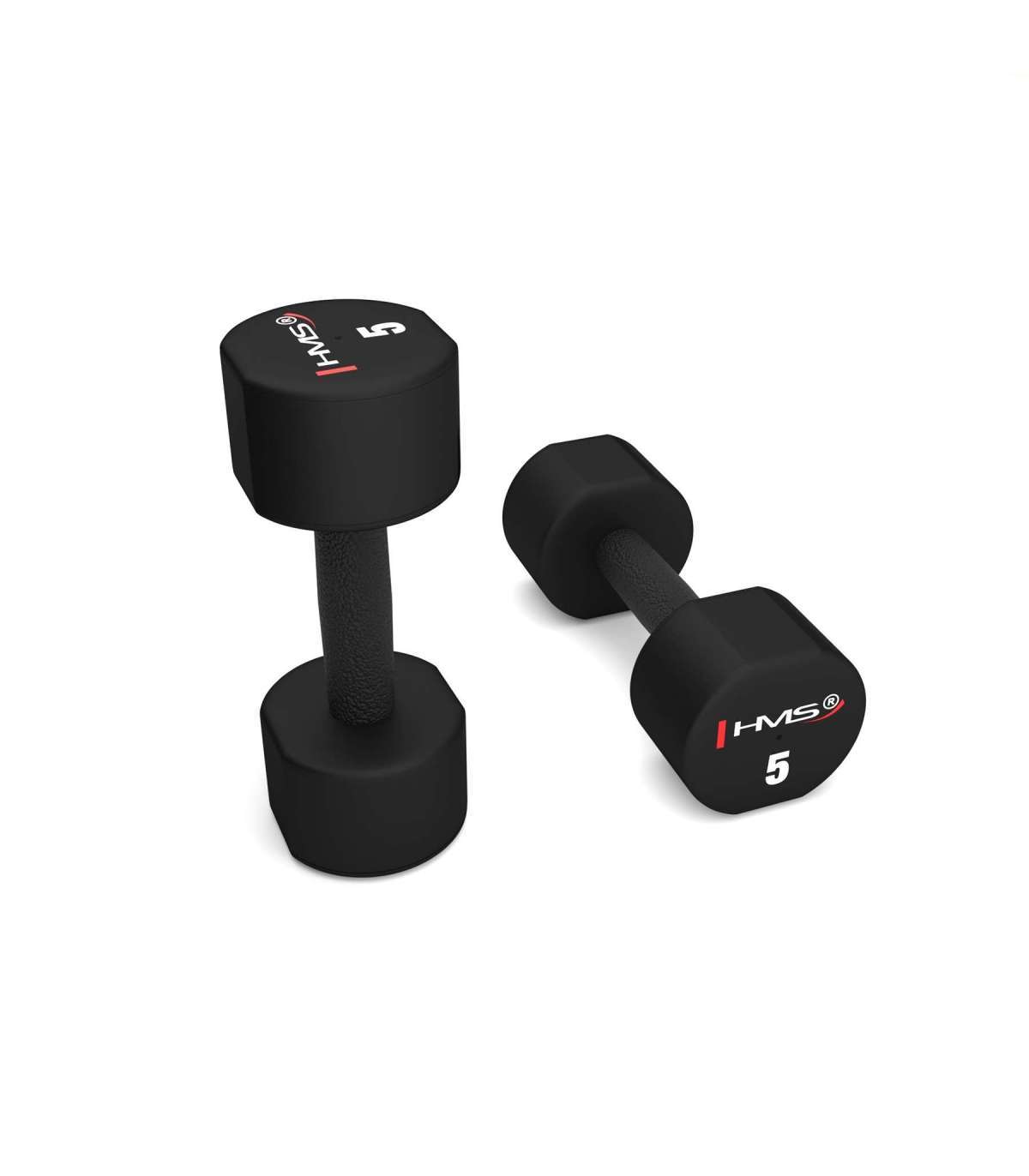 Introducing the HPT training dumbbells, which have been coated with polyurethane (TPU). Thanks to special materials, they combine durability with comfortable use. Their flexible, abrasion-resistant surface provides a secure grip and safety during training, regardless of the intensity.Protection thanks to the TPU polyurethane coatingThe HPT dumbbells from HMS are coated with a black layer of thermoplastic polyurethane (TPU), a material known for its flexibility while maintaining a high degree of hardness. This makes them shock-, scratch- and impact-resistant, ensuring long-lasting use without loss of quality. The polyurethane coating is odourless and protects the ground from damage, minimising the risk of scratches or noise during training.Ergonomic gripEach dumbbell has an ergonomic handle with a knurled surface, which guarantees a secure and comfortable grip. This design prevents your hands from slipping, increasing safety and comfort during intense training sessions.Choose the load for youAvailable from 1kg to 10kg (sold in pairs), the polyurethane dumbbells allow you to gradually increase the load, which is key to effective training progression. This weight range allows you to tailor the intensity of your exercises to suit your individual needs.Modern designThe black coating gives the HPT dumbbells a sleek and modern look that blends in perfectly with any gym interior or home training area. The clear weight markings make it easy to quickly select the right load for a more effective workout.Versatility of useHPTs are ideal for a variety of exercises such as bench presses, squats, rowing and functional training. Their robust construction and excellent balance make them an indispensable piece of equipment for amateur and professional training spaces.Specification:Material: steel + TPUHandle: knurledOverall length: 24.5 cmLength of grip section: 12.1 cmDiameter of grip part: 3.1 cmDiameter of load: 9.2 cmThickness of load: 6.2 cmWeight: 2 x 5 kgRemarks:3-year warrantyImporter: Abisal Ltd. | Poland | 41-807 Zabrze | Pyskowicka Street 17 | e-mail: abisal@abisal.plAbisal Ltd.. declares that the products sold by the company are safe and meet the requirements contained in the Act on General Product Safety of December 12, 2003. (Journal of Laws of December 31, 2003)