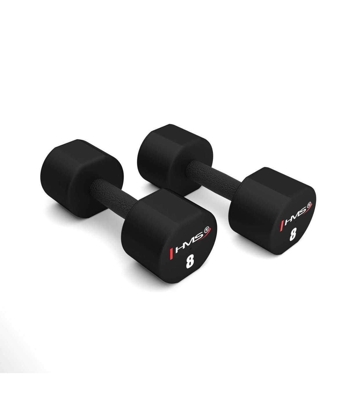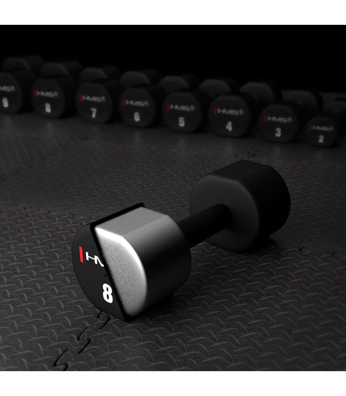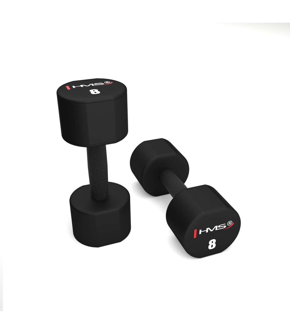 Introducing the HPT training dumbbells, which have been coated with polyurethane (TPU). Thanks to special materials, they combine durability with comfortable use. Their flexible, abrasion-resistant surface provides a secure grip and safety during training, regardless of the intensity.Protection thanks to the TPU polyurethane coatingThe HPT dumbbells from HMS are coated with a black layer of thermoplastic polyurethane (TPU), a material known for its flexibility while maintaining a high degree of hardness. This makes them shock-, scratch- and impact-resistant, ensuring long-lasting use without loss of quality. The polyurethane coating is odourless and protects the ground from damage, minimising the risk of scratches or noise during training.Ergonomic gripEach dumbbell has an ergonomic handle with a knurled surface, which guarantees a secure and comfortable grip. This design prevents your hands from slipping, increasing safety and comfort during intense training sessions.Choose the load for youAvailable from 1kg to 10kg (sold in pairs), the polyurethane dumbbells allow you to gradually increase the load, which is key to effective training progression. This weight range allows you to tailor the intensity of your exercises to suit your individual needs.Modern designThe black coating gives the HPT dumbbells a sleek and modern look that blends in perfectly with any gym interior or home training area. The clear weight markings make it easy to quickly select the right load for a more effective workout.Versatility of useHPTs are ideal for a variety of exercises such as bench presses, squats, rowing and functional training. Their robust construction and excellent balance make them an indispensable piece of equipment for amateur and professional training spaces.Specification:Material: steel + TPUHandle: knurledOverall length: 27.6 cmLength of grip section: 12 cmDiameter of grip part: 3.1 cmDiameter of load: 10.6 cmThickness of load: 7.8 cmWeight: 2 x 8 kgRemarks:3-year warrantyImporter: Abisal Ltd. | Poland | 41-807 Zabrze | Pyskowicka Street 17 | e-mail: abisal@abisal.plAbisal Ltd.. declares that the products sold by the company are safe and meet the requirements contained in the Act on General Product Safety of December 12, 2003. (Journal of Laws of December 31, 2003)