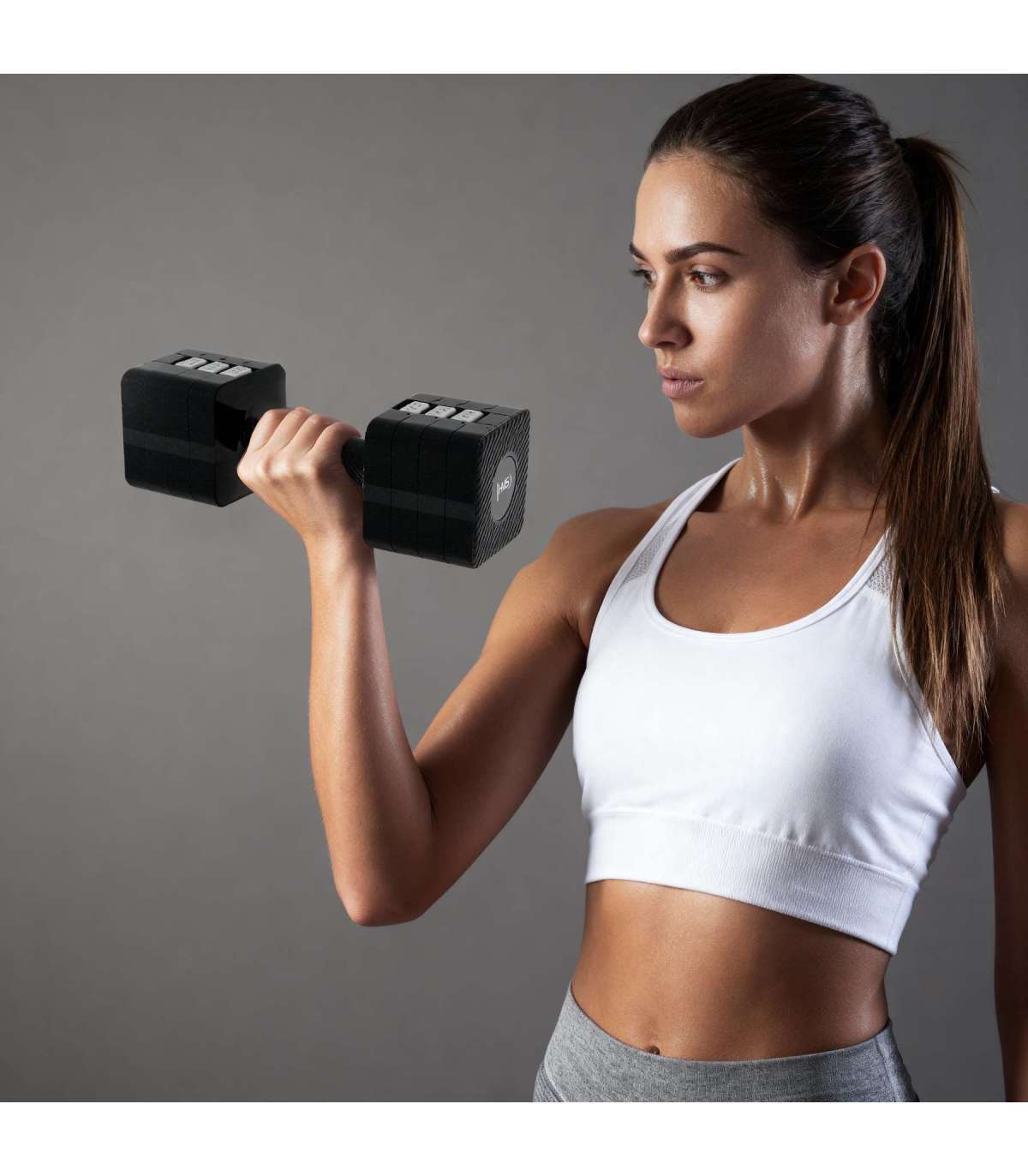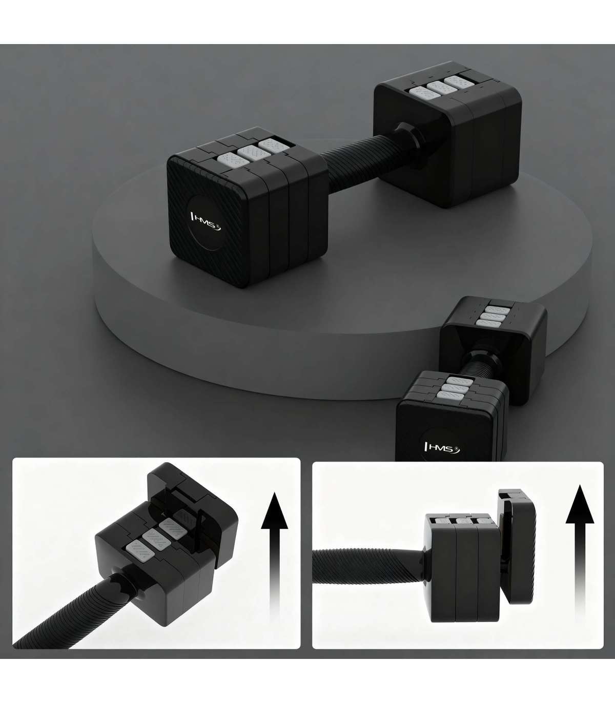 HL02 ADJUSTABLE DUMBBELLS BLACK 2 × 5 KG HMSUpgrade your fitness training with the HL02 HMS – adjustable dumbbells (2 × 5 kg) featuring instant weight adjustment, a non-slip handle, and a stable square shape. One pair replaces five traditional dumbbell sets – saving you space, time, and money.Why Choose HL02?Quick adjustment – press the button, add or remove a segment, and keep training without interruption.Weight range: 1.36–5 kg per dumbbell – ideal for cardio, fitness, strength, and rehabilitation workouts.Square heads (anti-roll) – dumbbells stay in place on the floor; can also be used as push-up stands.Comfortable, non-slip grip – knurled handle ensures a secure hold, even during dynamic sets.Durable ABS casing – impact-resistant and quiet when placed down.Adjustable Weight – 5 LevelsHL02 dumbbells allow you to set the following weights per piece:1.36 kg2.27 kg3.18 kg4.09 kg5.00 kgAdd or remove the segmented weight plates in just a few seconds – no clips, no plates, no hassle. The fastest way to progress your load mid-workout.Comfort and SafetyAn ergonomic, anti-slip handle, durable ABS coating, and secure locking mechanism guarantee stability and confidence during training. The square shape increases stability when setting down or using as a push-up base.Perfect For:Arm, shoulder, chest, and back trainingHIIT, cardio, pilates, yoga, and aerobicsHome gym workouts, warm-ups, and mobility sessionsThese universal adjustable dumbbells are perfect for both men and women – from beginners to intermediate fitness enthusiasts.Specification:Dimensions by weight (fixed head size 9×9 cm):1.36 kg – length 16.2 cm2.27 kg – length 20.5 cm3.18 kg – length 24.3 cm4.09 kg – length 28.1 cm5.00 kg – length 31.9 cmQuantity: 2 piecesTotal set weight: 10 kgGrip diameter: 3.3 cmShape: squareMaterial: galvanized iron + ABSNotes:Not intended for commercial useWarranty: 24 monthsImporter: Abisal Ltd. | Poland | 41-807 Zabrze | Pyskowicka Street 17 | e-mail: abisal@abisal.plAbisal Ltd.. declares that the products sold by the company are safe and meet the requirements contained in the Act on General Product Safety of December 12, 2003. (Journal of Laws of December 31, 2003)