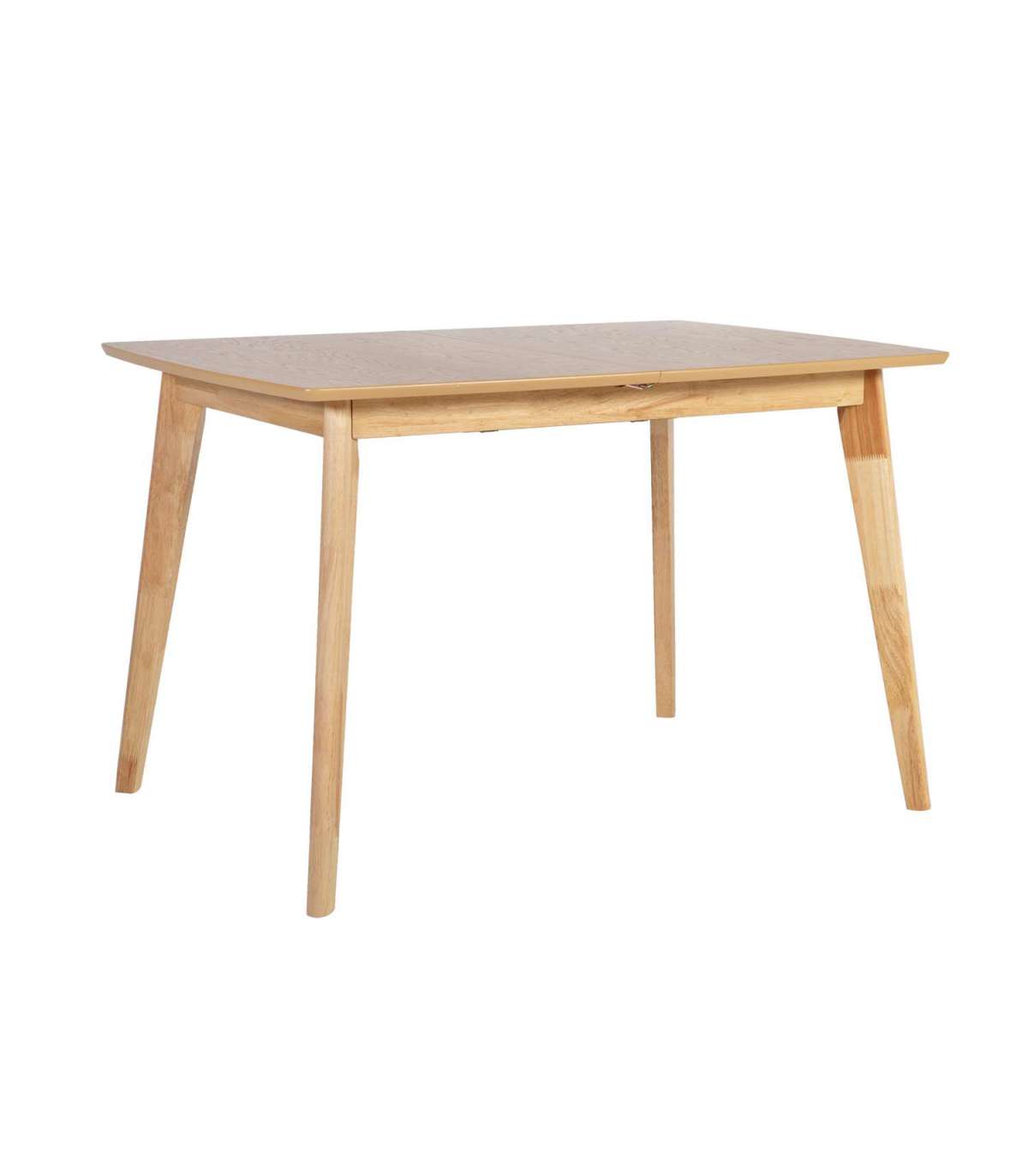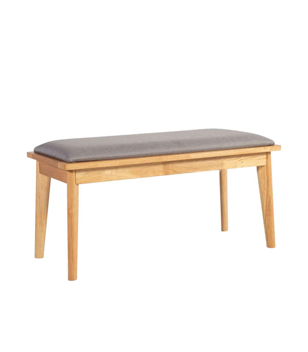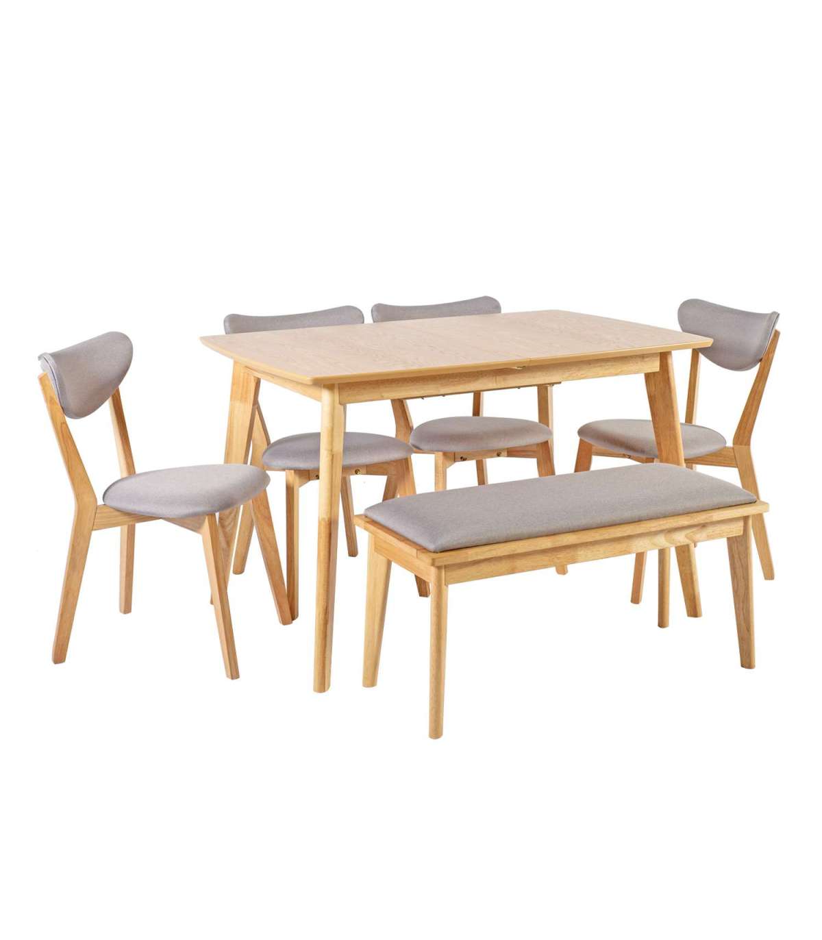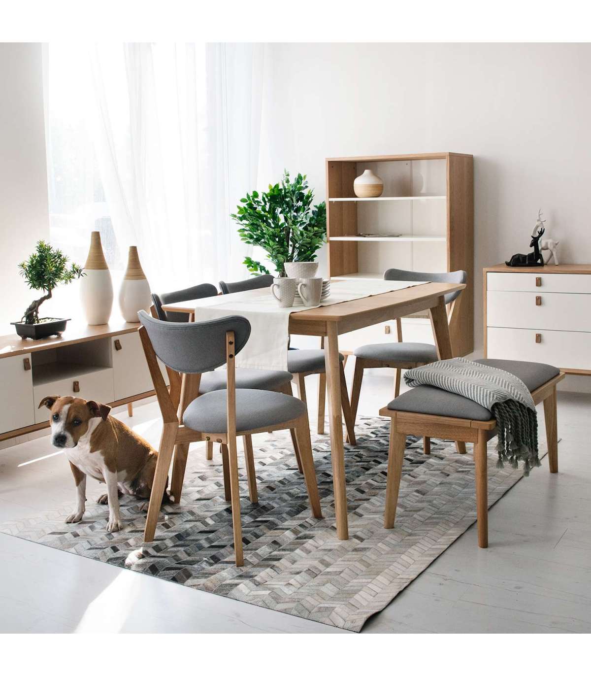 Обеденный стол 120/160x80xH76см, cтолешница: шпон дуба МДФ, ножки и рама: каучуковое дерево, цвет: натуральный. Стол легко удлиняется при помощи выдвижной панели, ширина 44см. Скамья 92x40xH45см, сиденье покрыто серым текстилем, ножки и рама: каучуковое дерево, цвет: натуральный. Cтул 48,5x51,5x78,5см, сиденье покрыто серым текстилем, ножки и рама: каучуковое дерево, цвет: натуральный.
