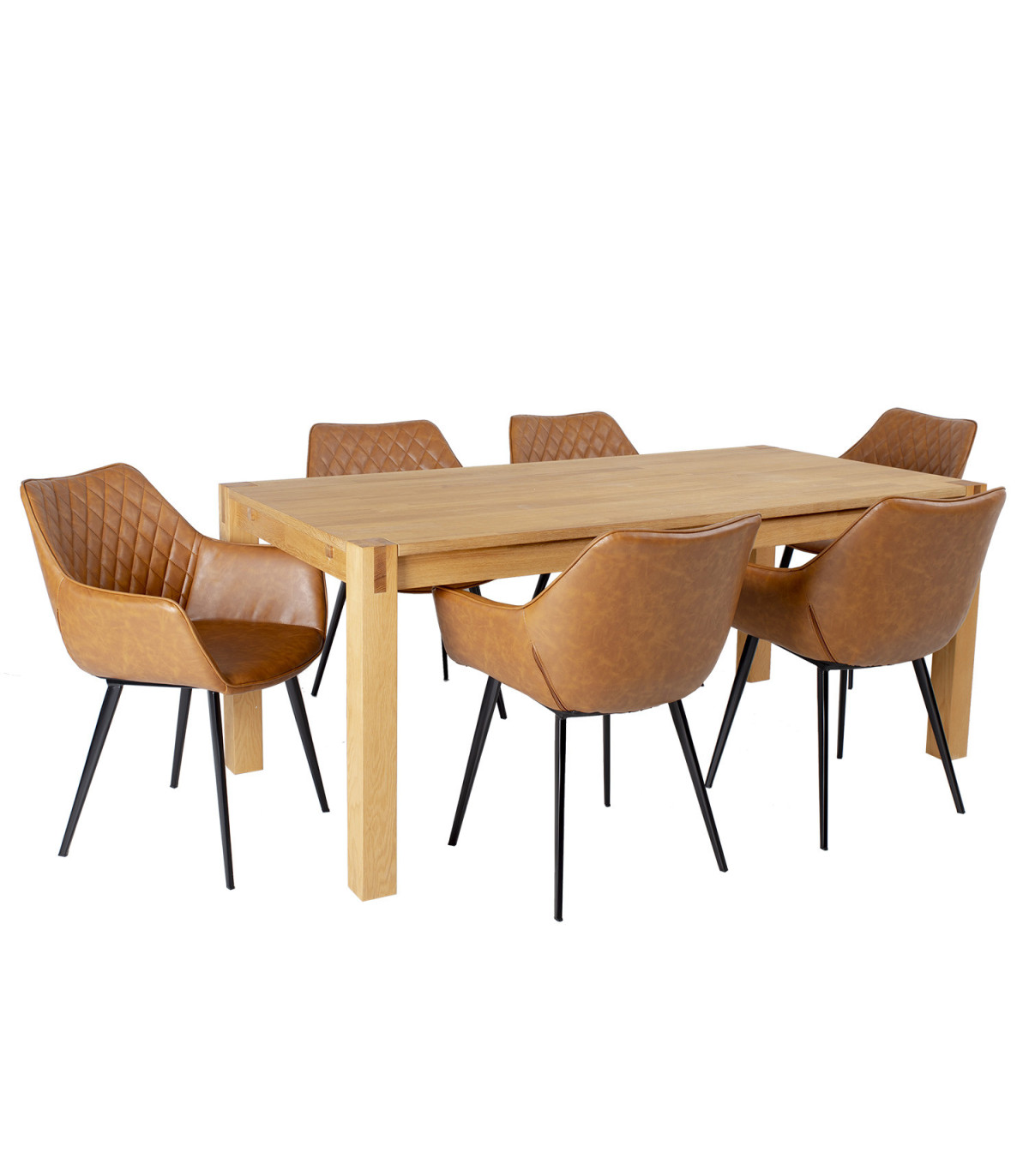 Стол 180x90xH76см. Столешница: МДФ, покрытый натуральным шпоном дуба. Ножки из низкопробных пород древесины 8x8см, покрытые дубовым шпоном. Стул NAOMI 61x60,5xH47 / 84см, светло-коричневая кожзаменитель, черные металлические ножки.