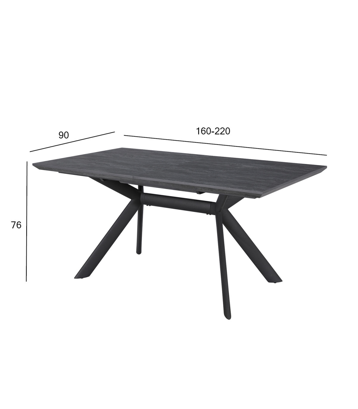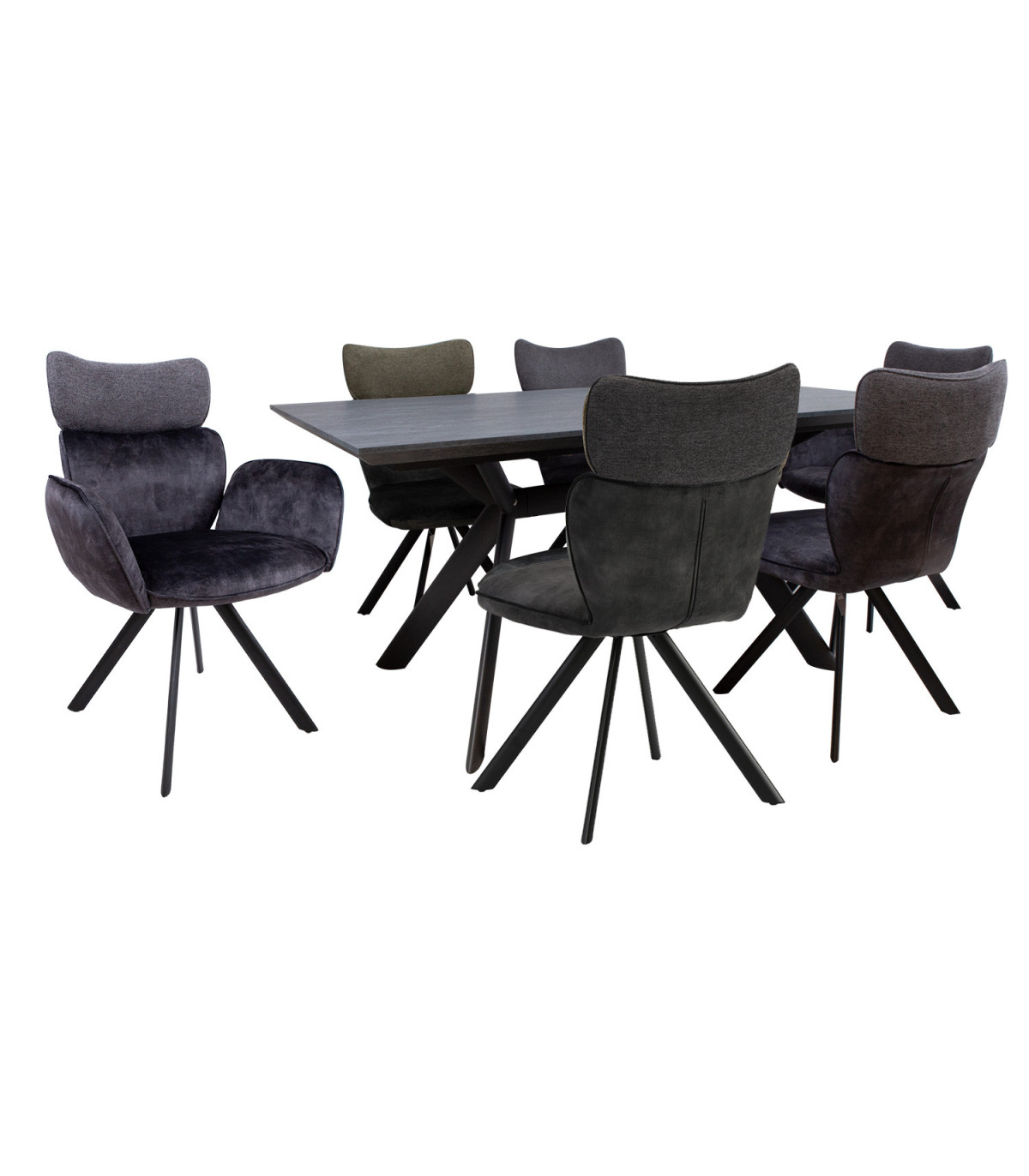 Обеденный комплект EDDY-2 с 6 стульями. В комплект входит раздвижной обеденный стол и 2+4 стула. Размеры стола 160/220x90xH76см. Стол раздвижной посередине. Боковины столешницы перемещаются по металлическим рельсам, под столешницу ставится удлинитель. Столешница: серый, имитация камня МДФ с меламиновым покрытием. У стола металлические ножки, покрытые черной порошковой краской. Стул EDDY с подлокотниками 63x55xH89cm, без подлокотников 49x55xH89cm. Материал покрытия: темно-серый бархат. Высота сиденья 48см, ширина сиденья 45/49см, глубина сиденья 42см. Высота спинки 47см. Высота подлокотника от земли 64см. Максимальный вес составляет 120кг.