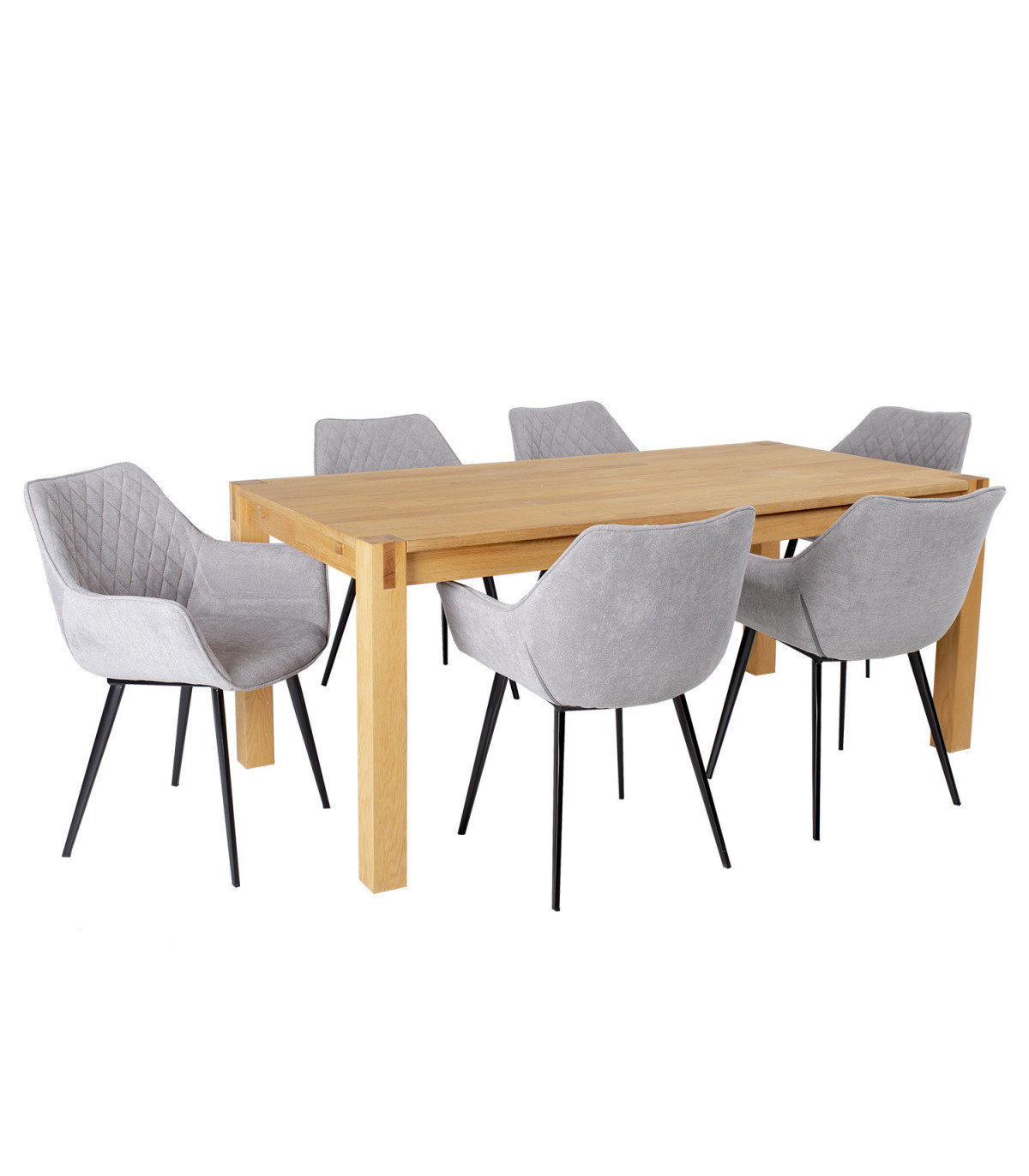 Стол 180x90xH76см. Столешница: МДФ, покрытый натуральным шпоном дуба. Ножки из низкопробных пород древесины 8x8см, покрытые дубовым шпоном. Стул NAOMI 61x60,5xH47 / 84см, серая ткань, черные металлические ножки.