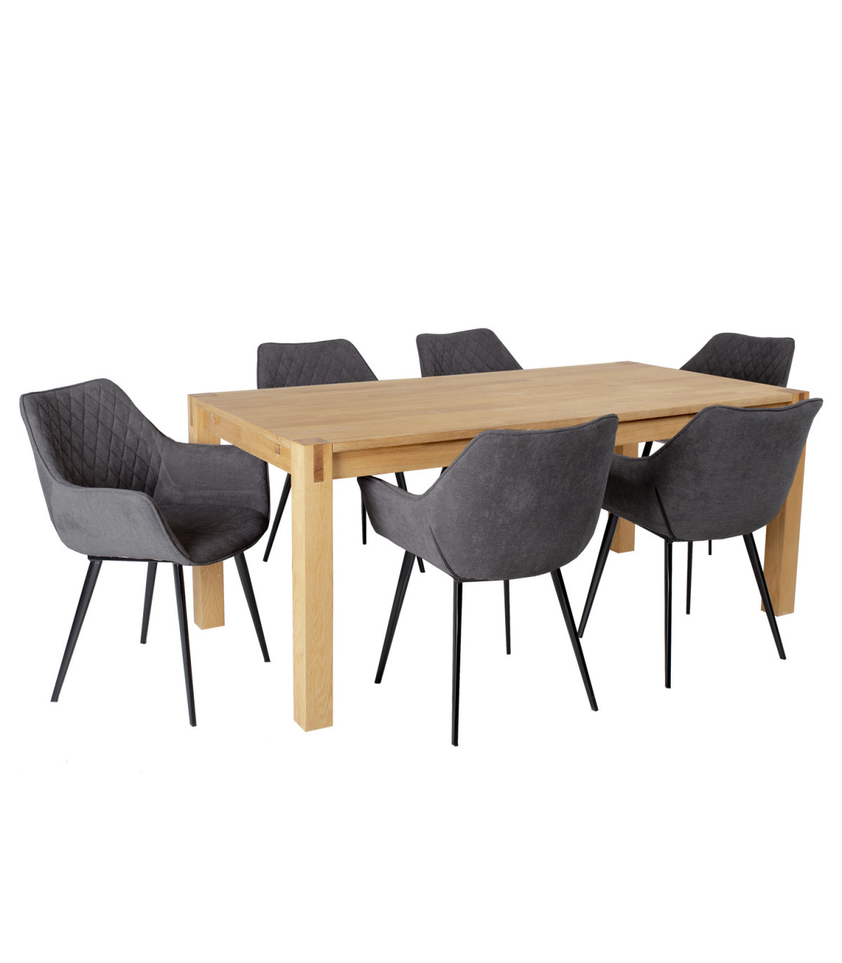 Стол 180x90xH76см. Столешница: МДФ, покрытый натуральным шпоном дуба. Ножки из низкопробных пород древесины 8x8см, покрытые дубовым шпоном. Стул NAOMI 61x60,5xH47 / 84см, ткань темно-серая, ножки из металла черные.