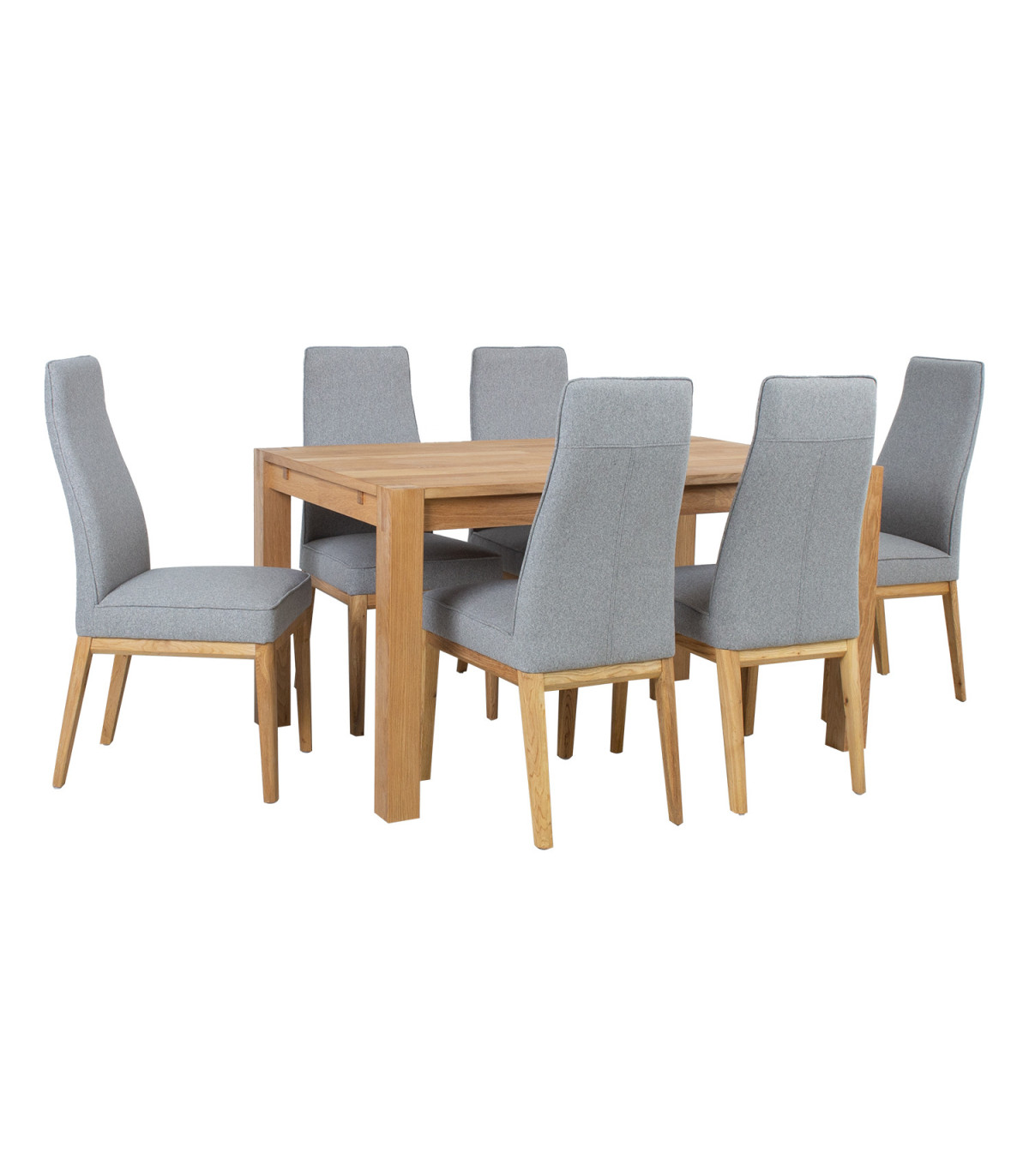 Обеденный комплект CHICAGO NEW с 6 стульями, массив дерева/МДФ с натуральным шпоном дуба, промасленный. Стол 140x90xH76см. Ножка стола 8х8см. Ножки изготовлены из низкосортных пород древесины и покрыты дубовым шпоном. Удлинительная пластина 45x90 см приобретается отдельно, код изделия 84026. Удлинительную пластину можно установить на обоих концах стола. Стул 46x58,5xH102см, серый полиэстер, ножки из дуба. Максимальный вес 100 кг.