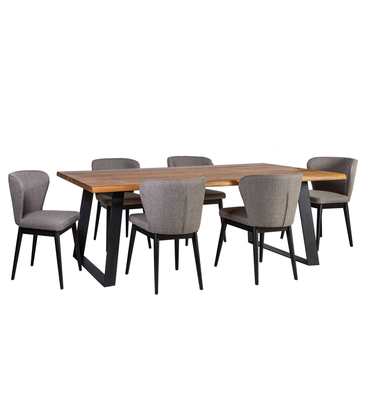 Обеденный комплект ROTTERDAM с 6-стульями. Стол 220x100xH75см. Столешница: мебельная доска натуральном рустикальном шпоном дуба, чёрные металлические ножки. Планки на край стола из массива дерева. Столешница состоит из двух панелей. Обработка: промасленный. Шпон в деревенском стиле смотрится живо и ярко, допускаются большие и маленькие сучки, а также множество вариаций тона. Стул 53,5x54xH81,5см, сиденье и спинка с обшивкой покрыто текстилем, цвет: серый, чёрные деревянные ножки. Предельный вес 100кг.