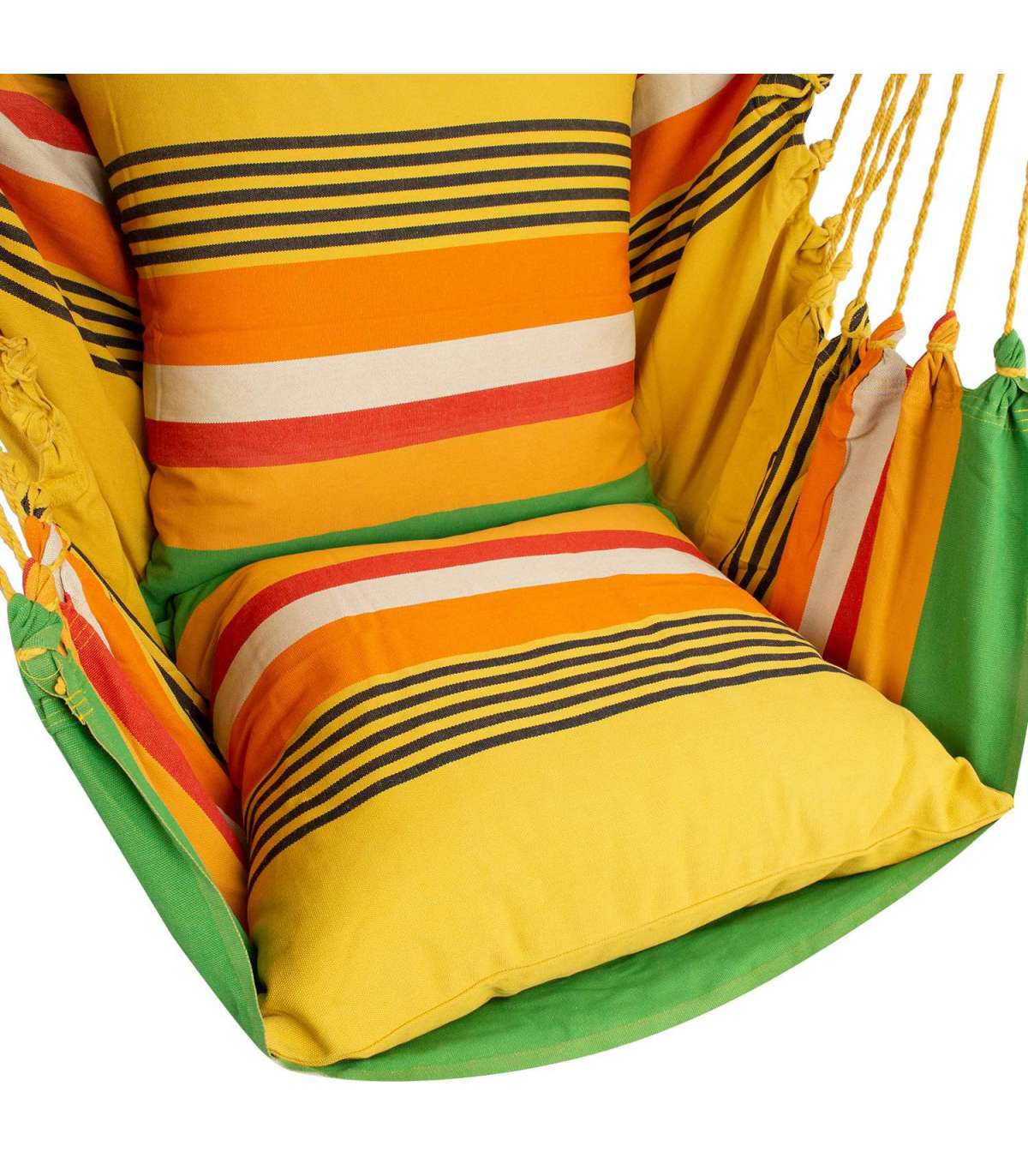 Гамак-качели JOY 130x127см, ткань: 100% хлопок, зеленый полосатый. Этот продукт сделан в Сальвадоре ремесленниками, которые сохраняют свою культуру, используя традиционные методы производства. Сиденье изготовлено вручную из хлопчатобумажной ткани, размеры 130x127см, общая длина 137см. 2 шт. подушки включены. Длина деревянной рамы 112см. Полиэфирные нити обеспечивают долговечность. Максимальный вес 140кг.
