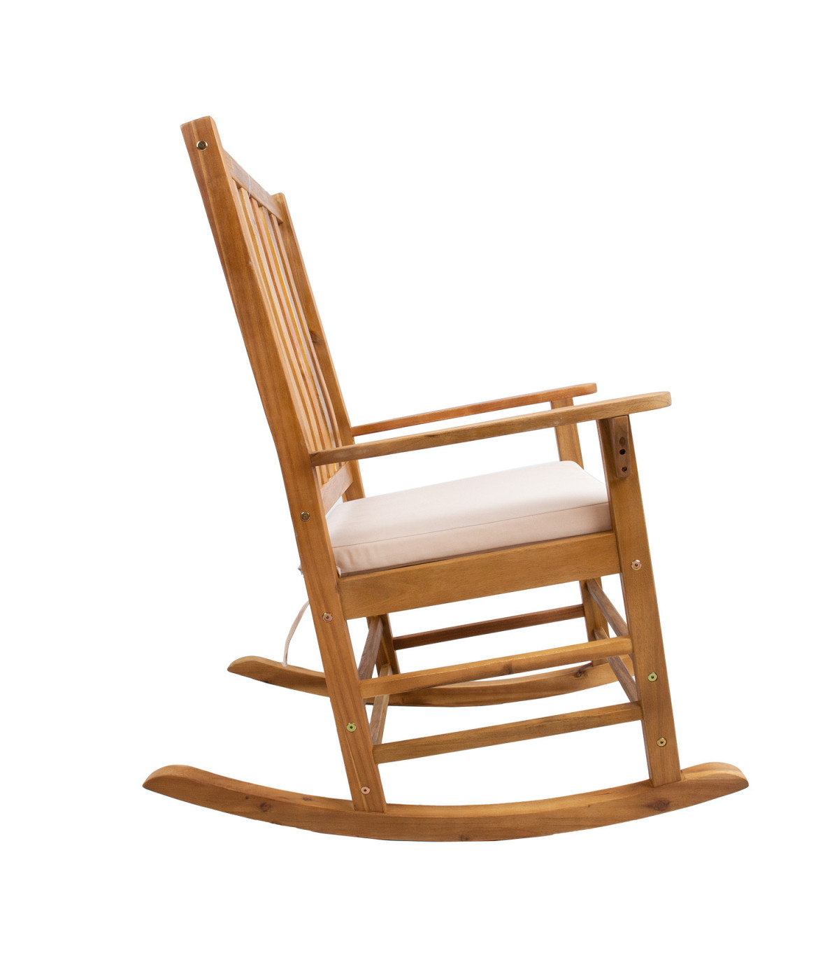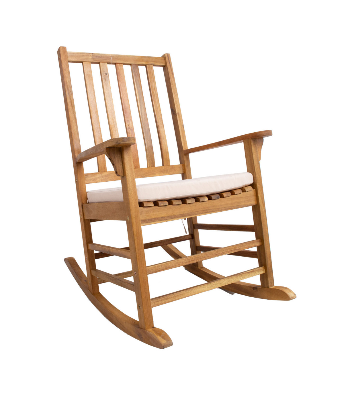 Кресло-качалка FINLAY светло-коричневый. Кресло-качалка хорошо подойдет для террасы, где можно наслаждаться прекрасной погодой и уютными вечерами. Кресло-качалка изготовлено из дерева акации и обработано маслом. Мягкая и удобная подушка сиденья входит в комплект. Чехол на подушку изготовлен из полиэстера бежевого цвета (180г/м?). Подушка толщиной 5см. Максимальный вес стула составляет 100кг, а размеры - 66x93xH105см. УХОД: древесина - это живой продукт, который со временем меняется и стареет. Регулярно очищайте мебель, защищайте от лишней влаги и УФ-излучения. Достаточно легкой шлифовки и нанесения нового масляного слоя не реже одного раза в год, чтобы мебель снова выглядела свежей.