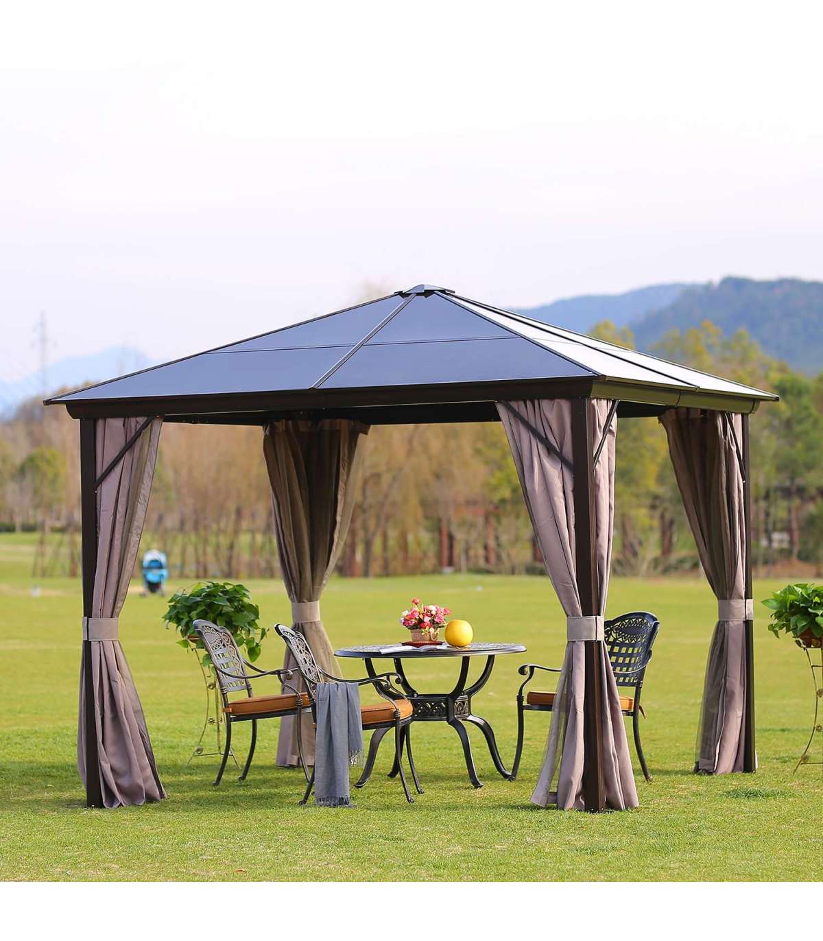 Шатёр SUNSET 3x3x2,67м, коричневая алюминиевая рама, поликарбонатная крыша, по бокам бежевые стенки и сетки из нейлон