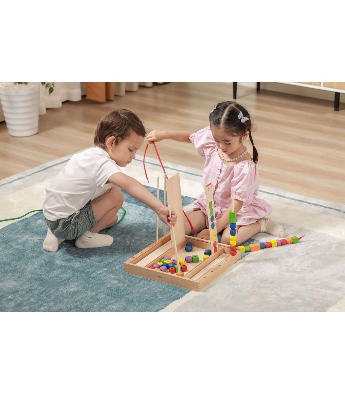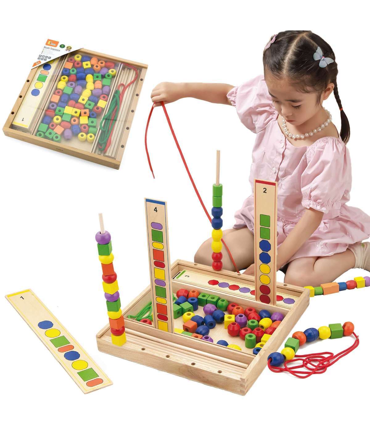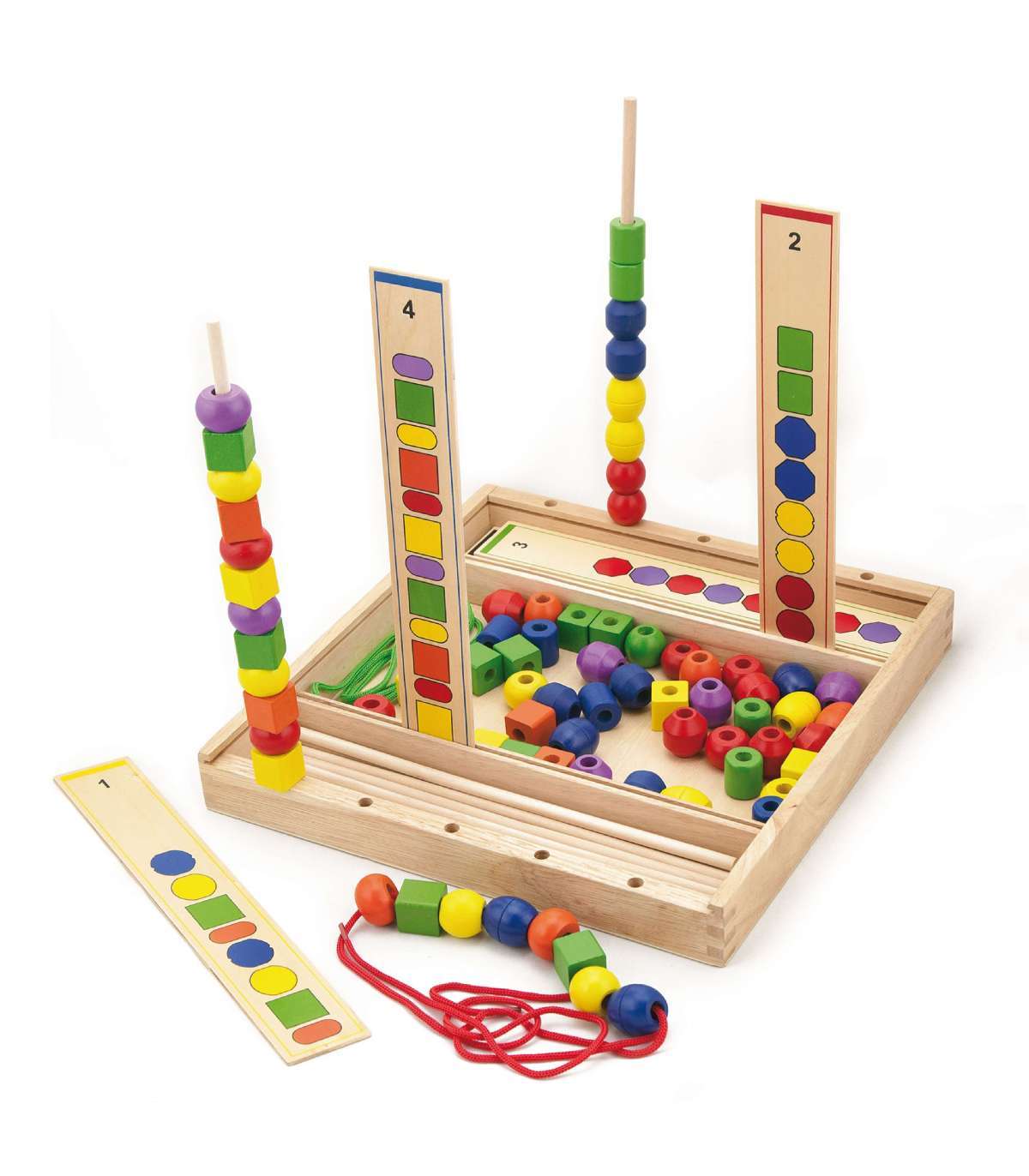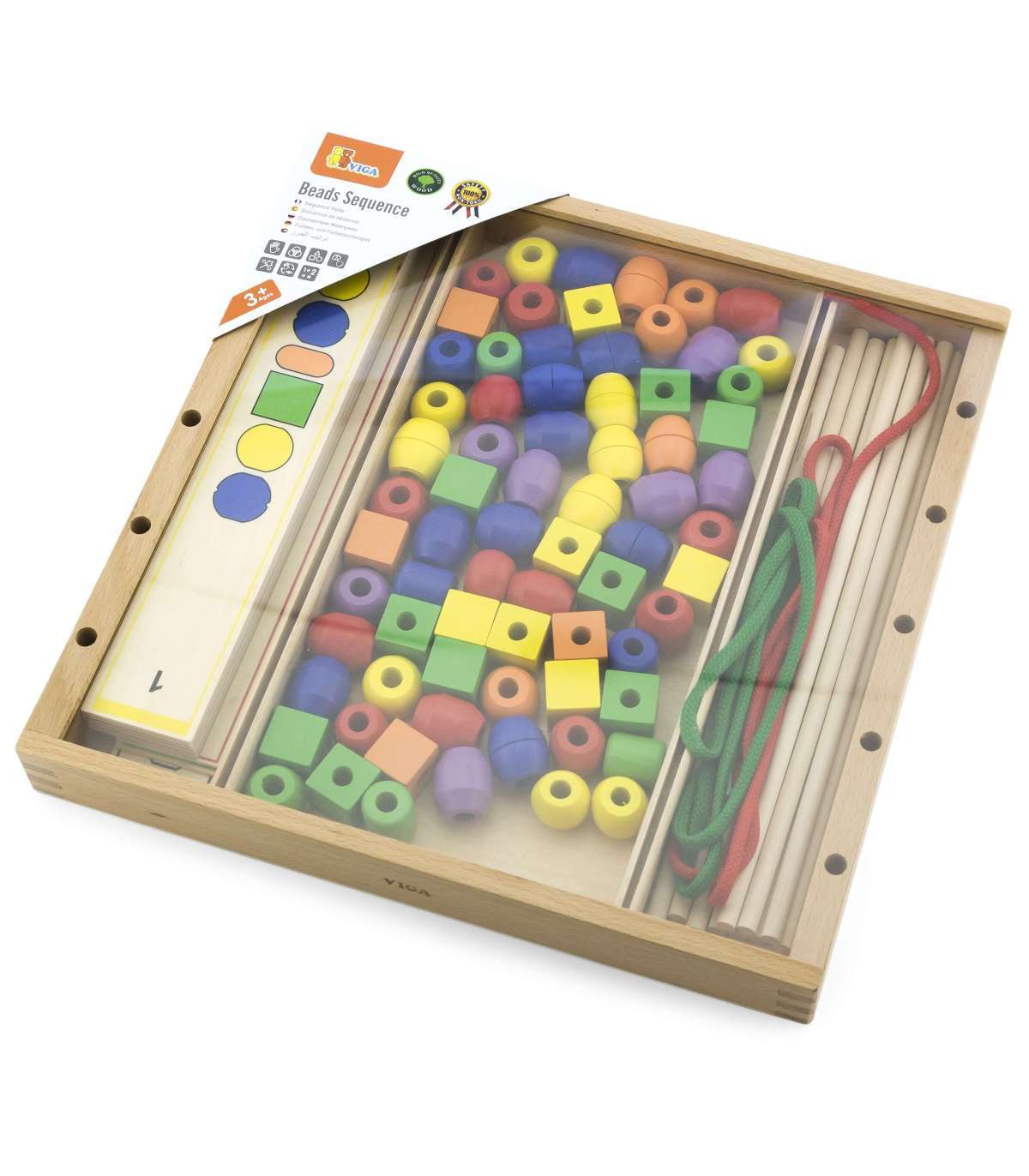 - В деревянной коробке ребёнок найдёт 72 бусины различных форм и цветов, 19 шаблонов, 10 палочек и 2 шнурка.