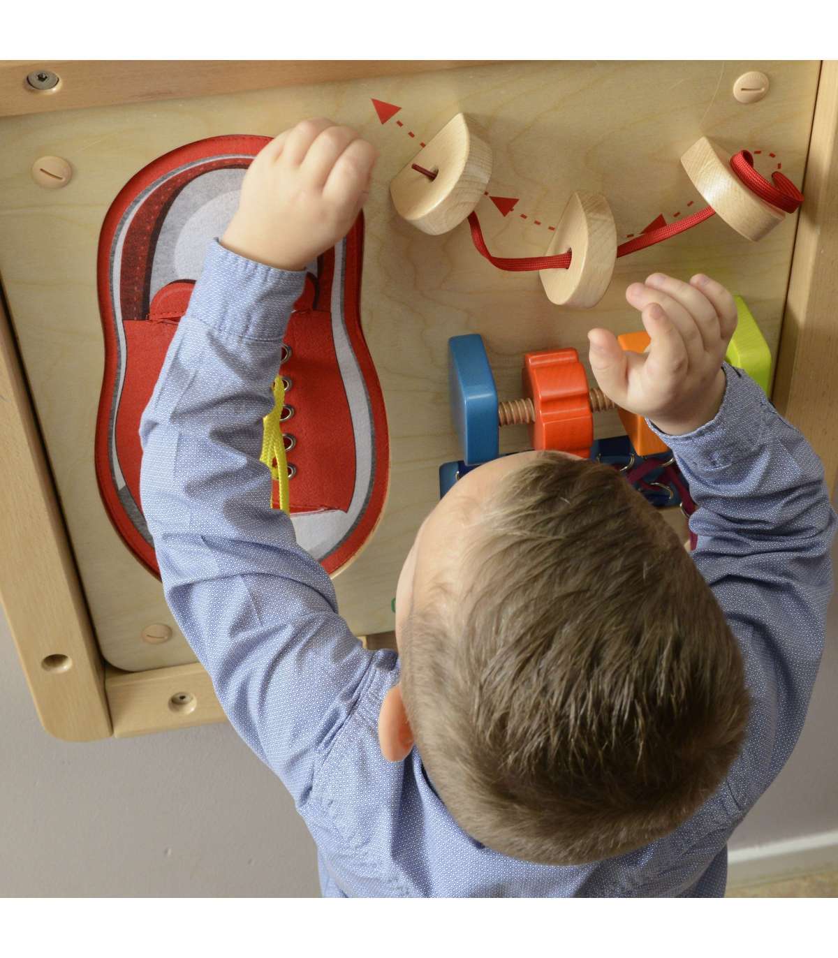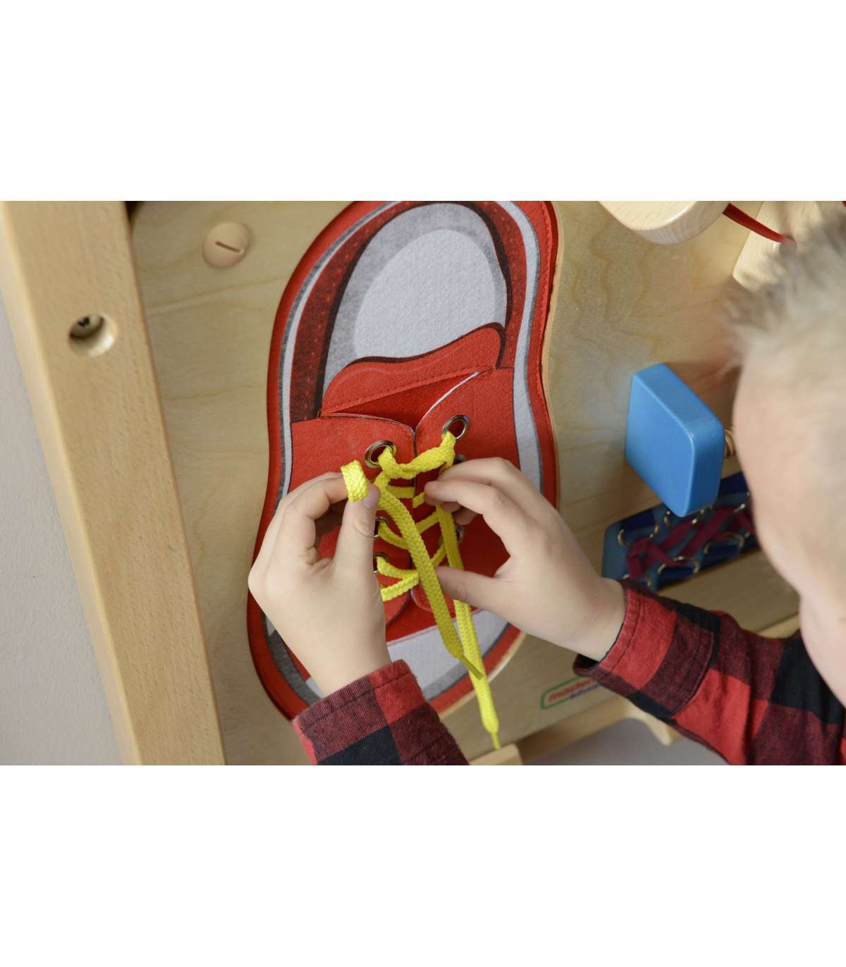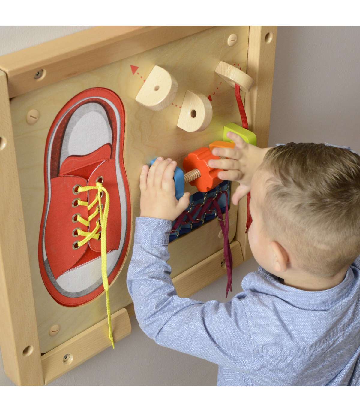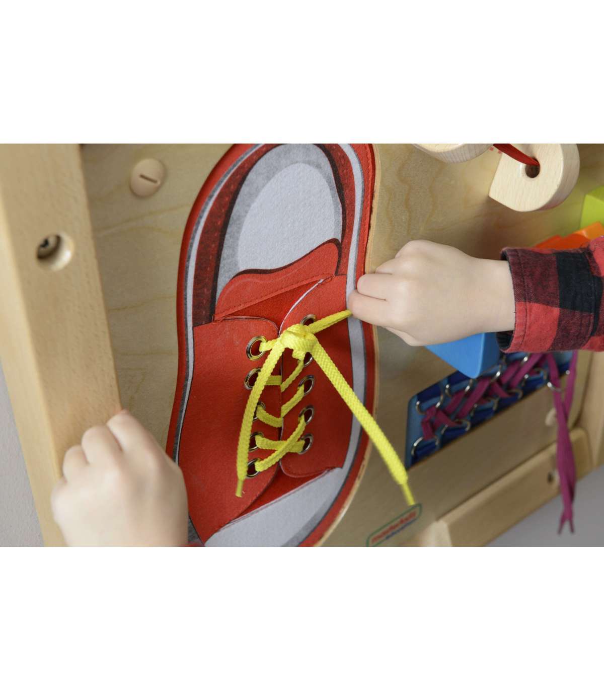 - детям наверняка понравится завязывать гигантский красный ботинок, а бесчисленные варианты шнуровки разовьют их воображение