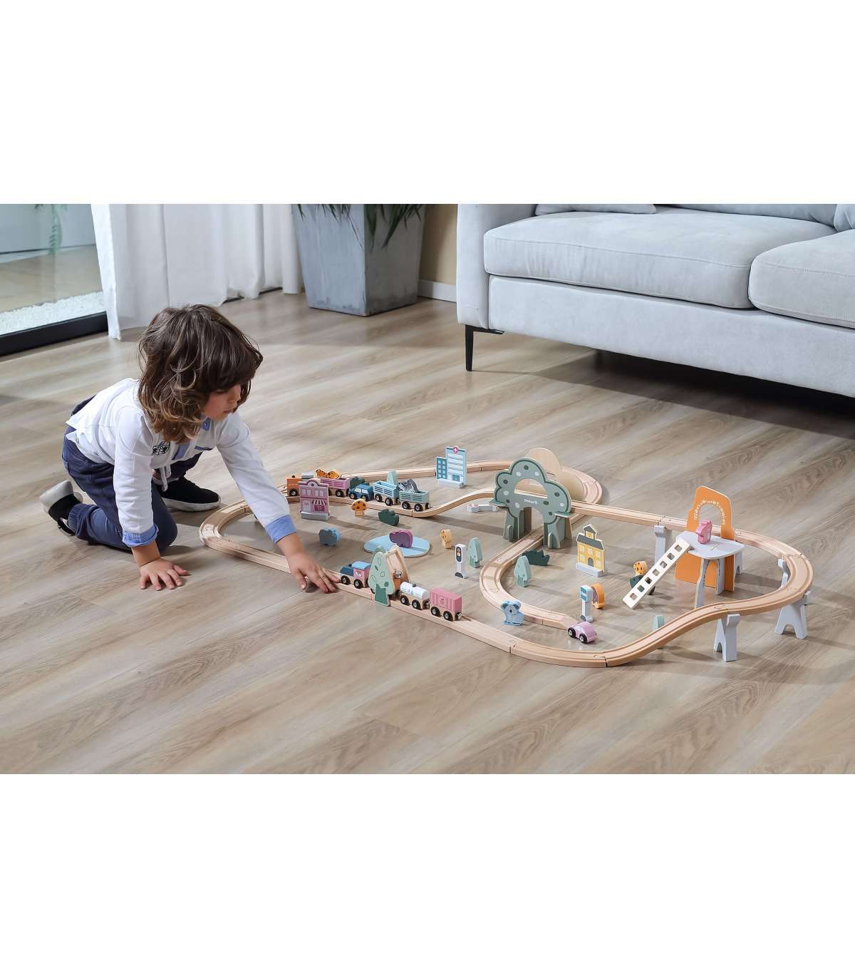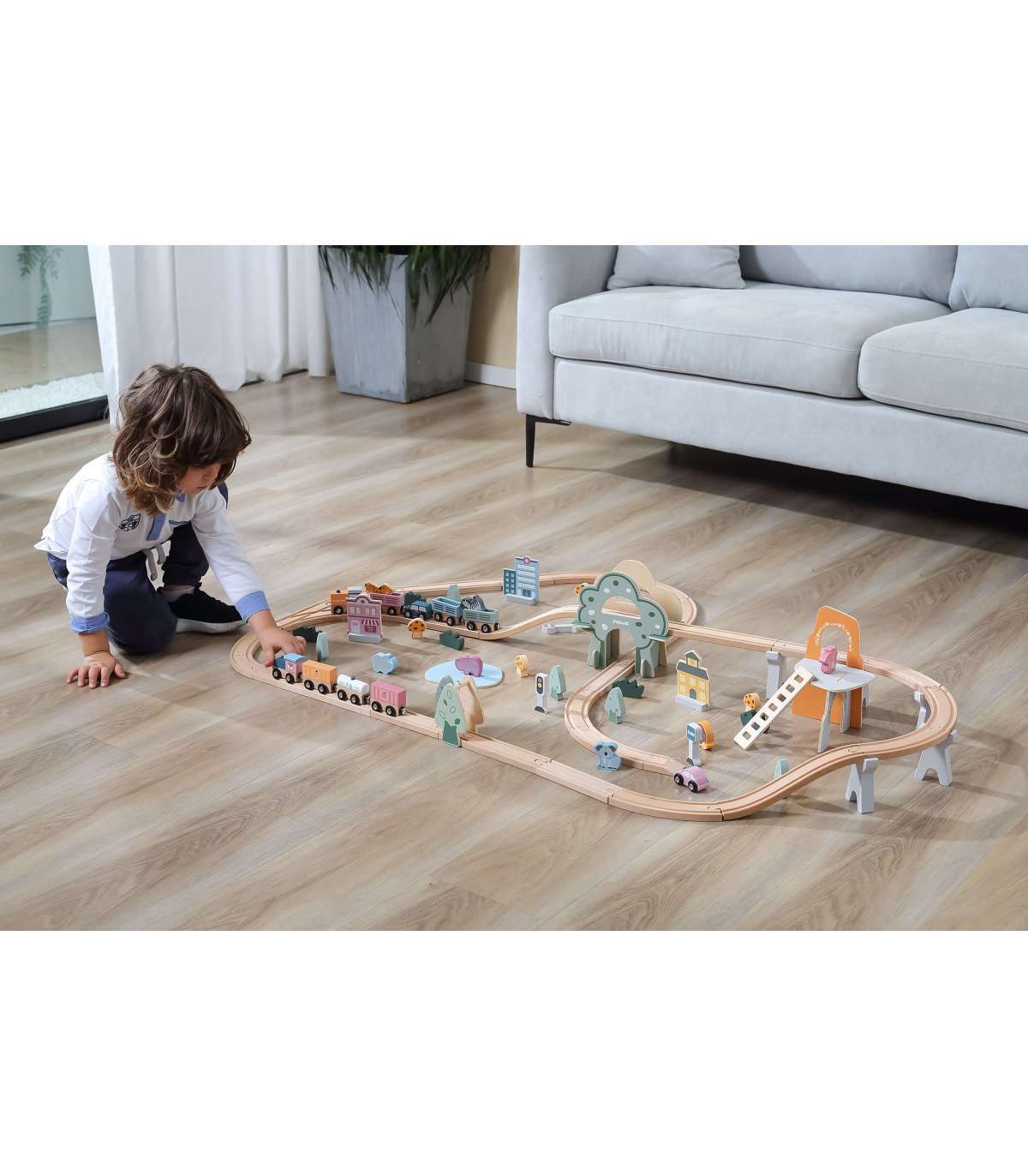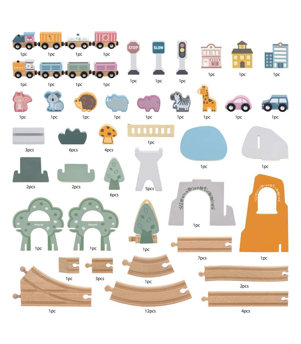 - Набор состоит из 90 элементов, включая рельсы, подъёмы для рельсов, поезд и разные вагончики, железнодорожные знаки, здания, животных, транспортные средства, а также различные деревья и скалы