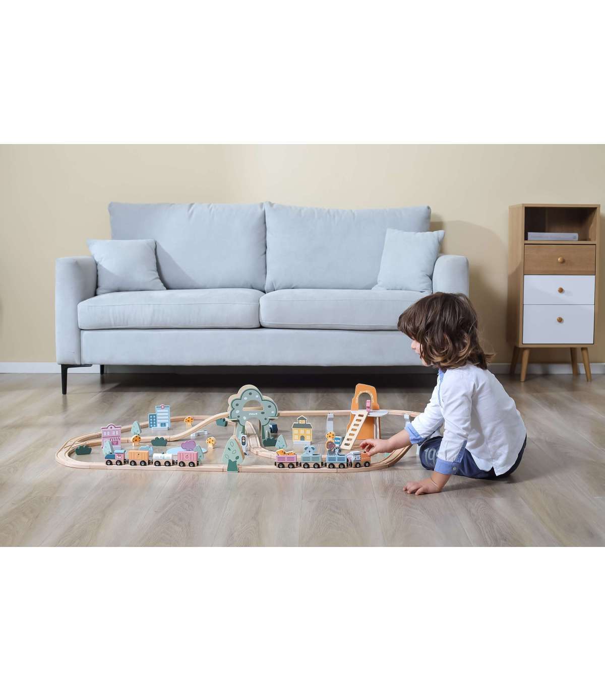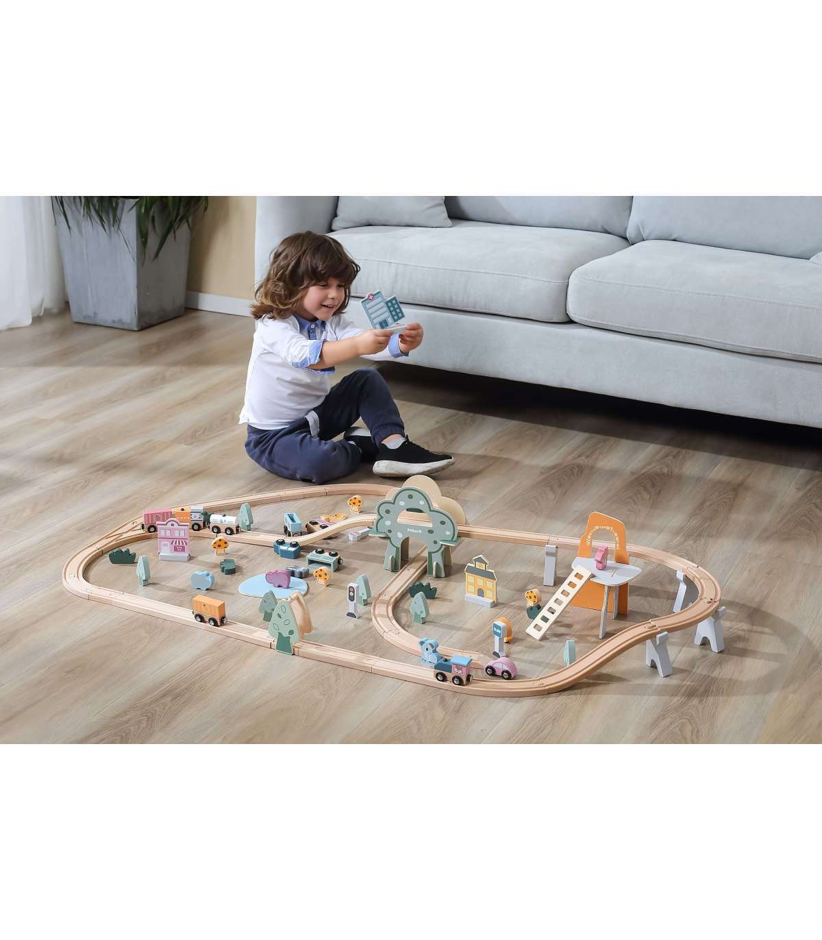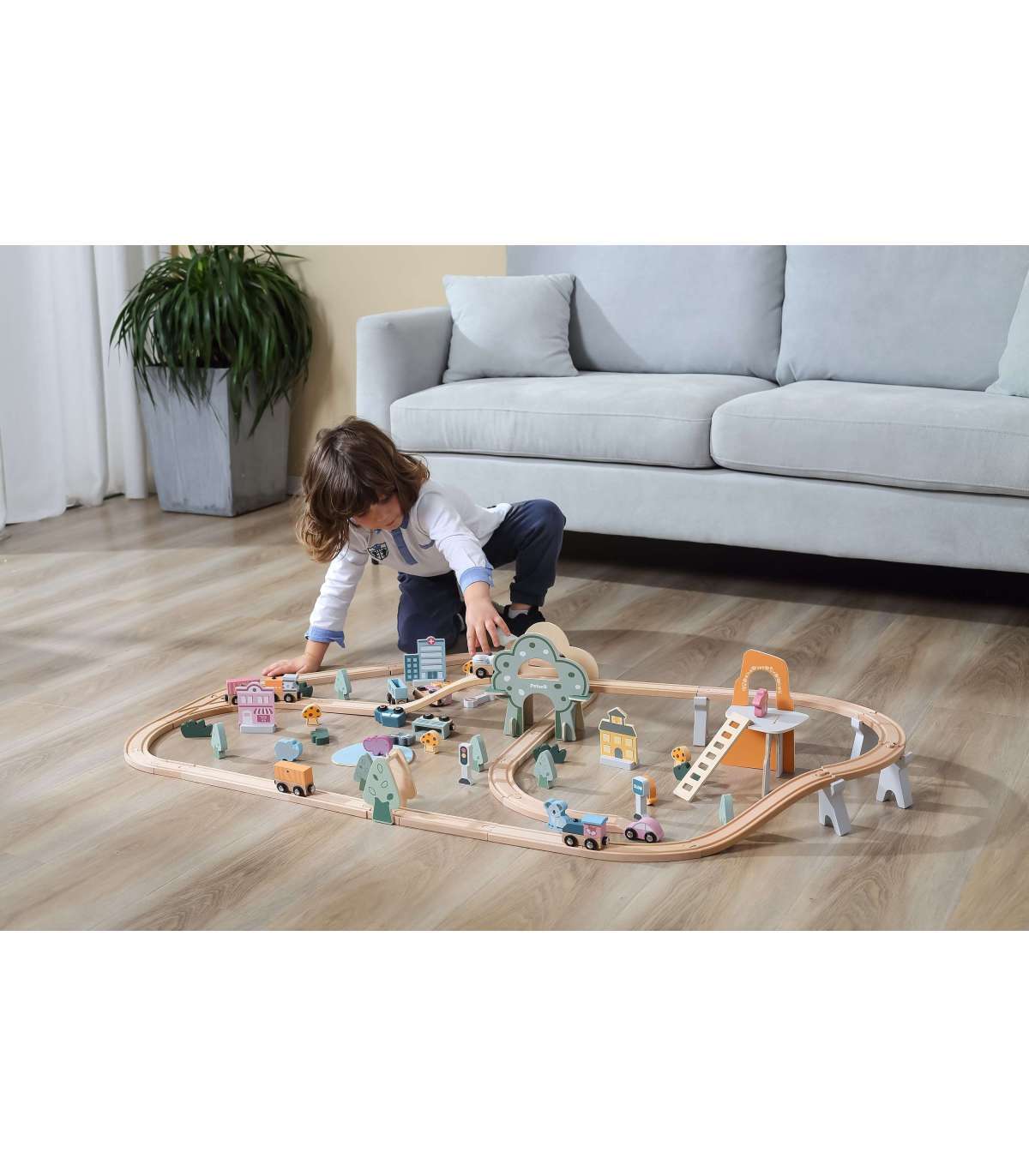 - Набор состоит из 90 элементов, включая рельсы, подъёмы для рельсов, поезд и разные вагончики, железнодорожные знаки, здания, животных, транспортные средства, а также различные деревья и скалы