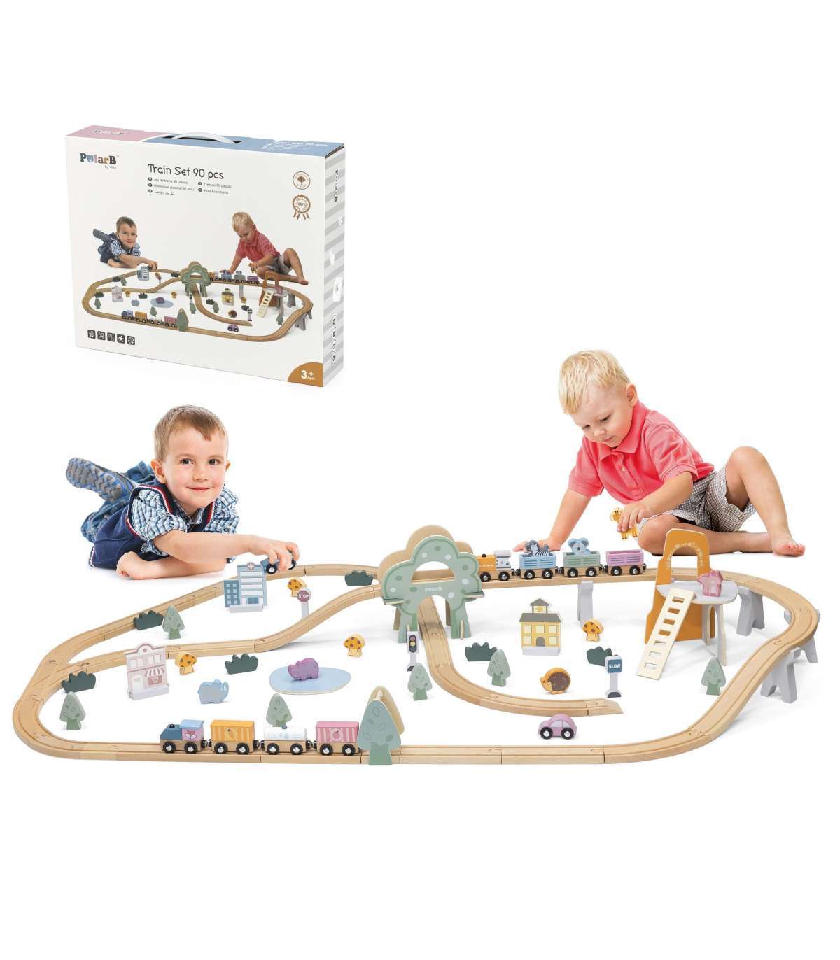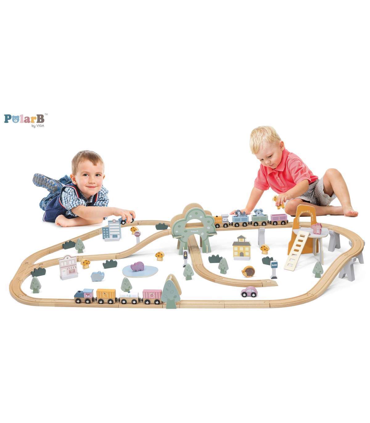 VIGA PolarB деревянный железнодорожный набор для детей — поезд и рельсы, 90 деталей