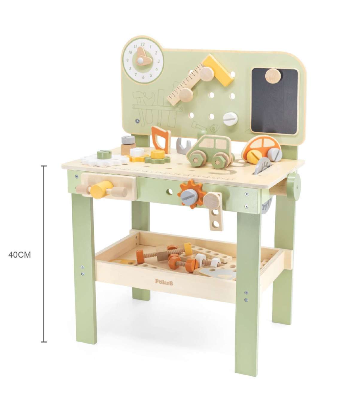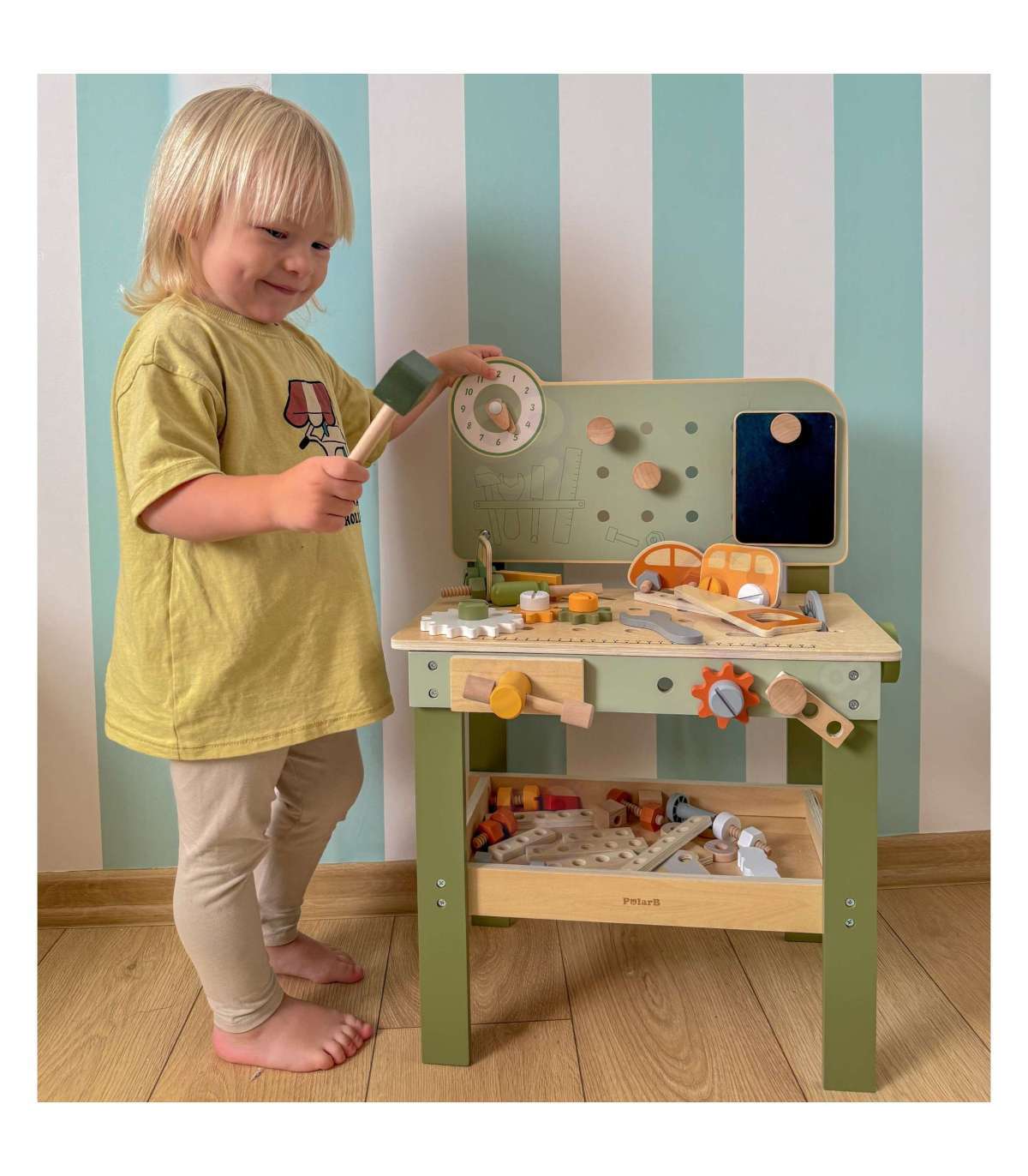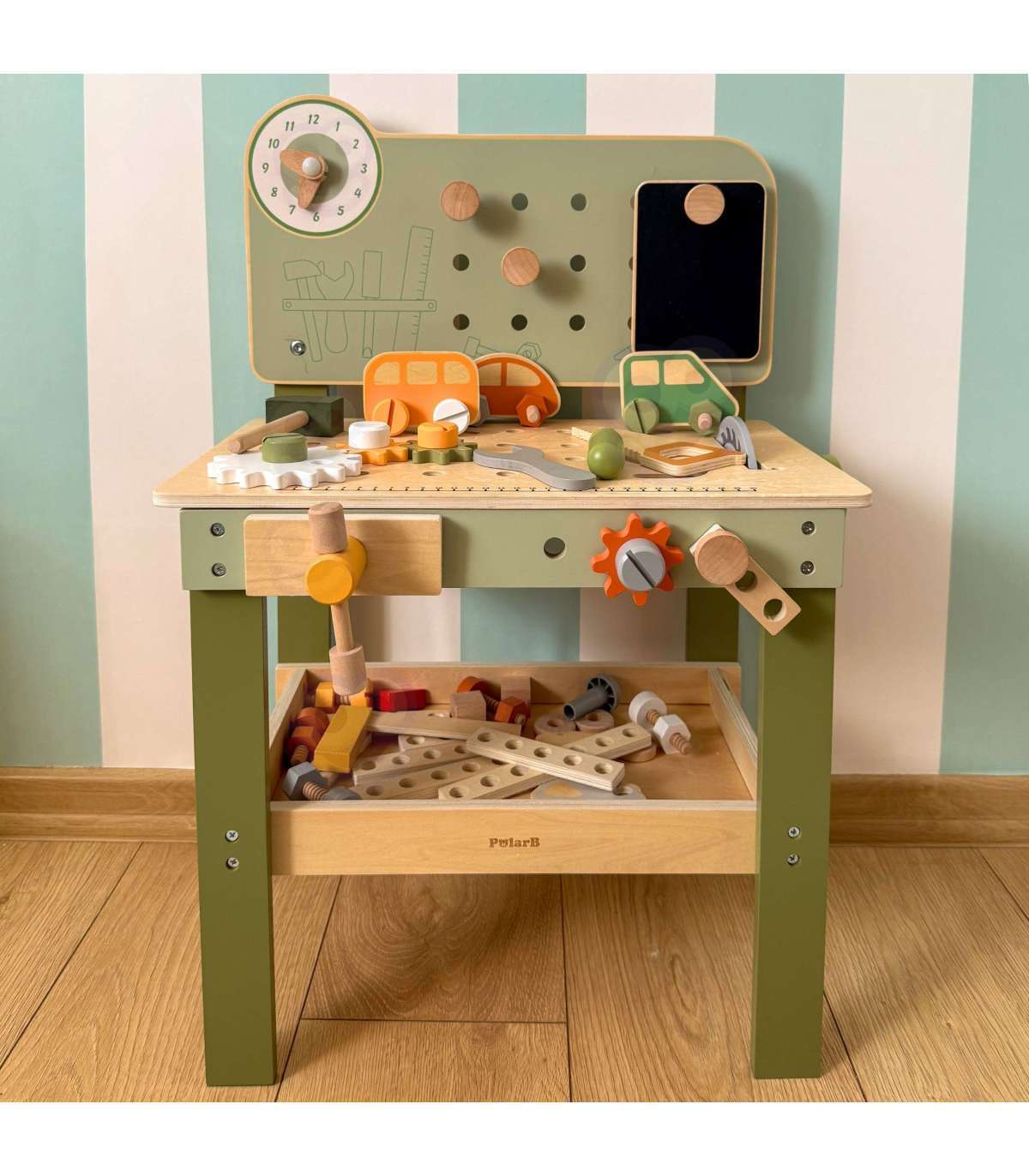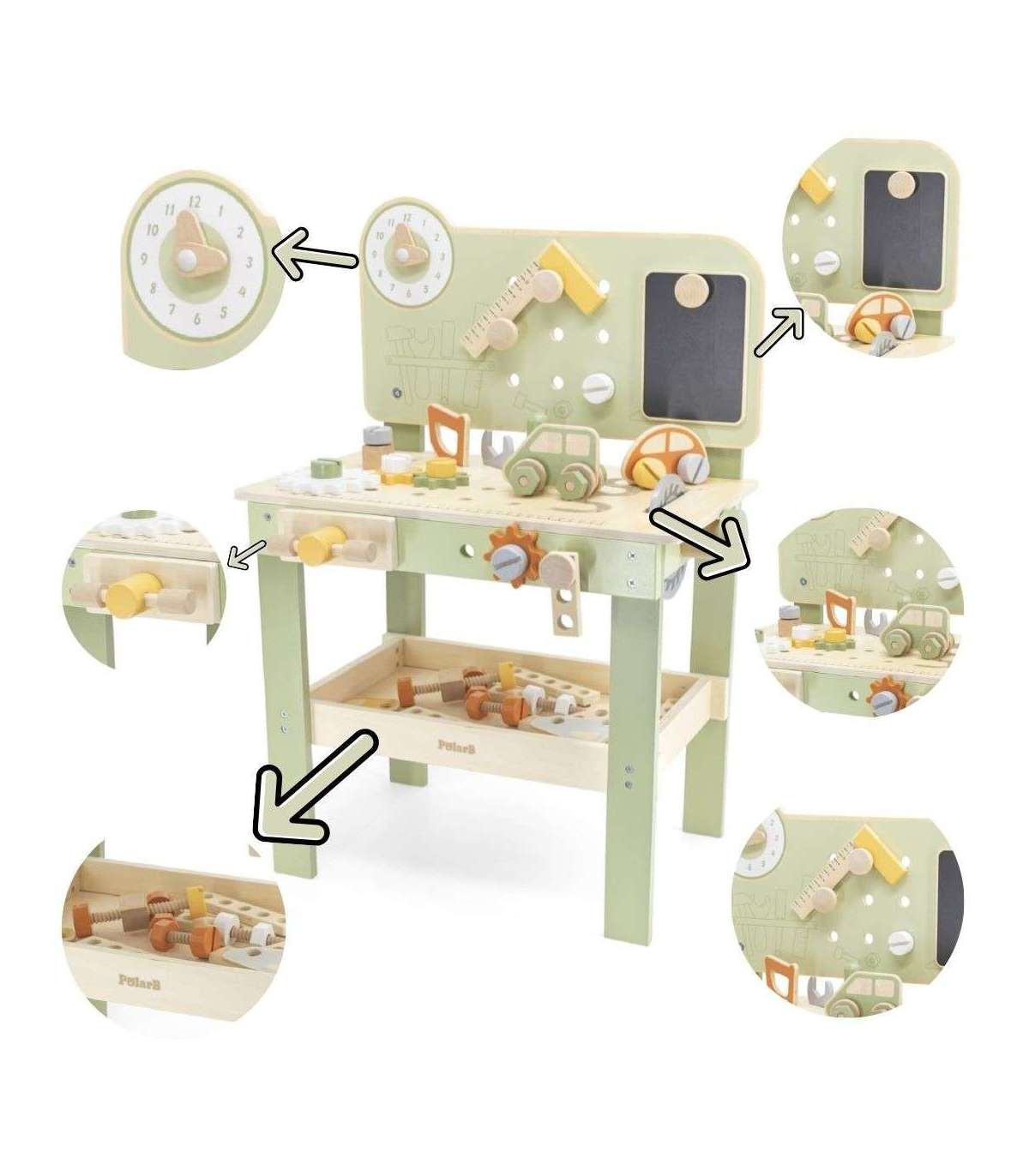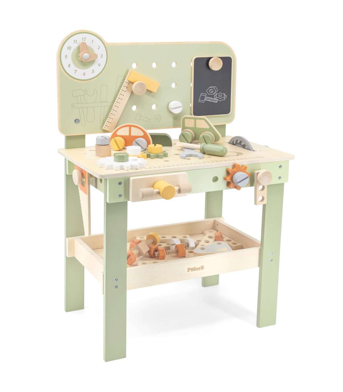 Warsztat majsterkowicza od marki Viga Toys z ekskluzywnej serii PolarB pozwoli poczuć się Twojemu dziecku jak prawdziwy mechanik. Dziecko może wbijać gwoździe, dokręcać śruby kluczem, a także przykręcać drewniane deski i zębatki do stołu warsztatowego. Zabawka posiada zegar ze wskazówkami, drewniane samochodziki oraz różne narzędzia.