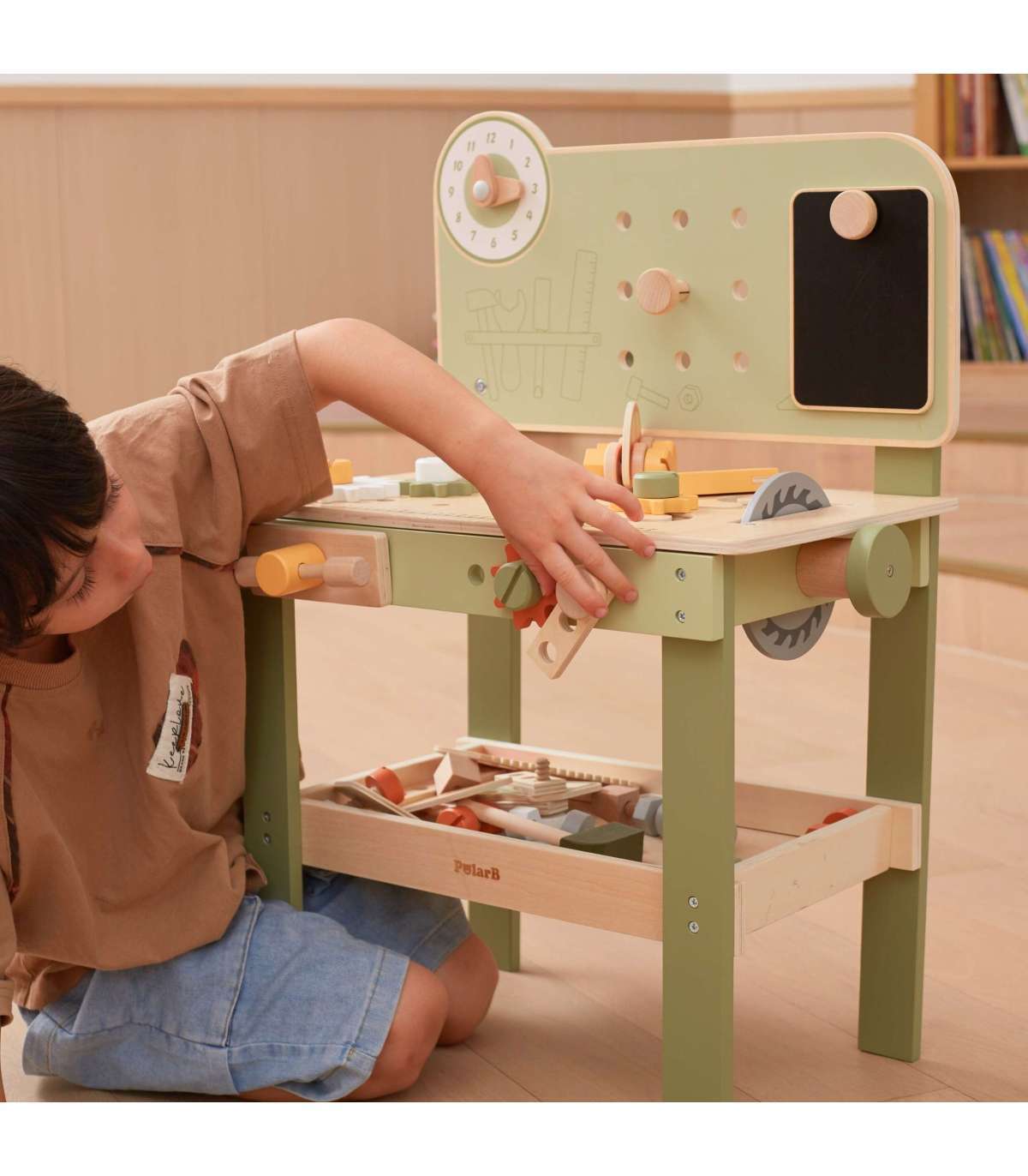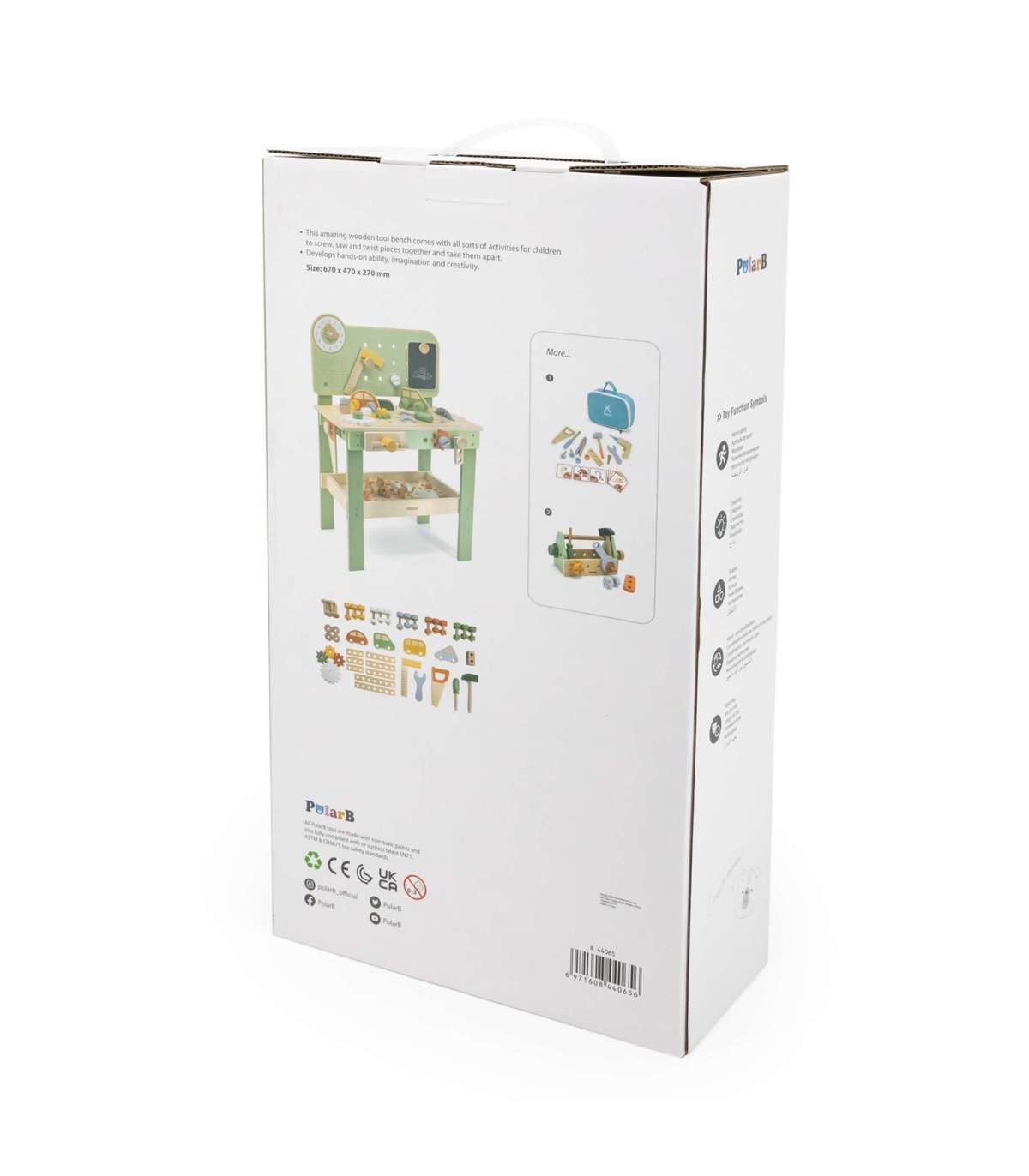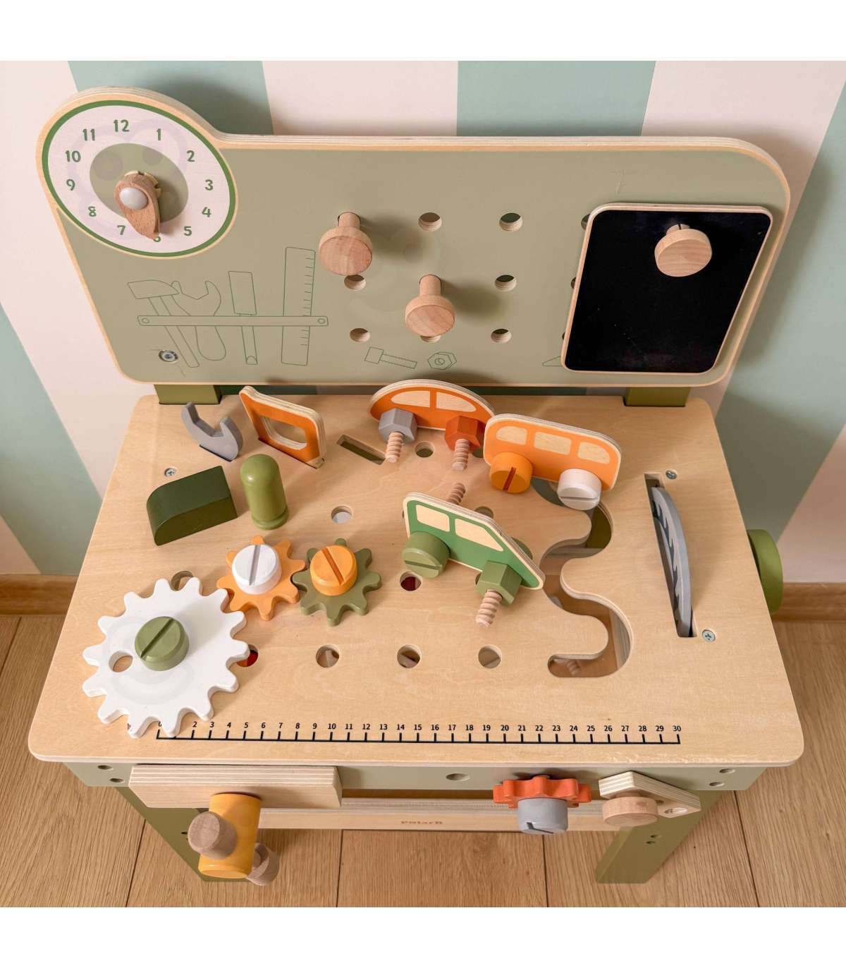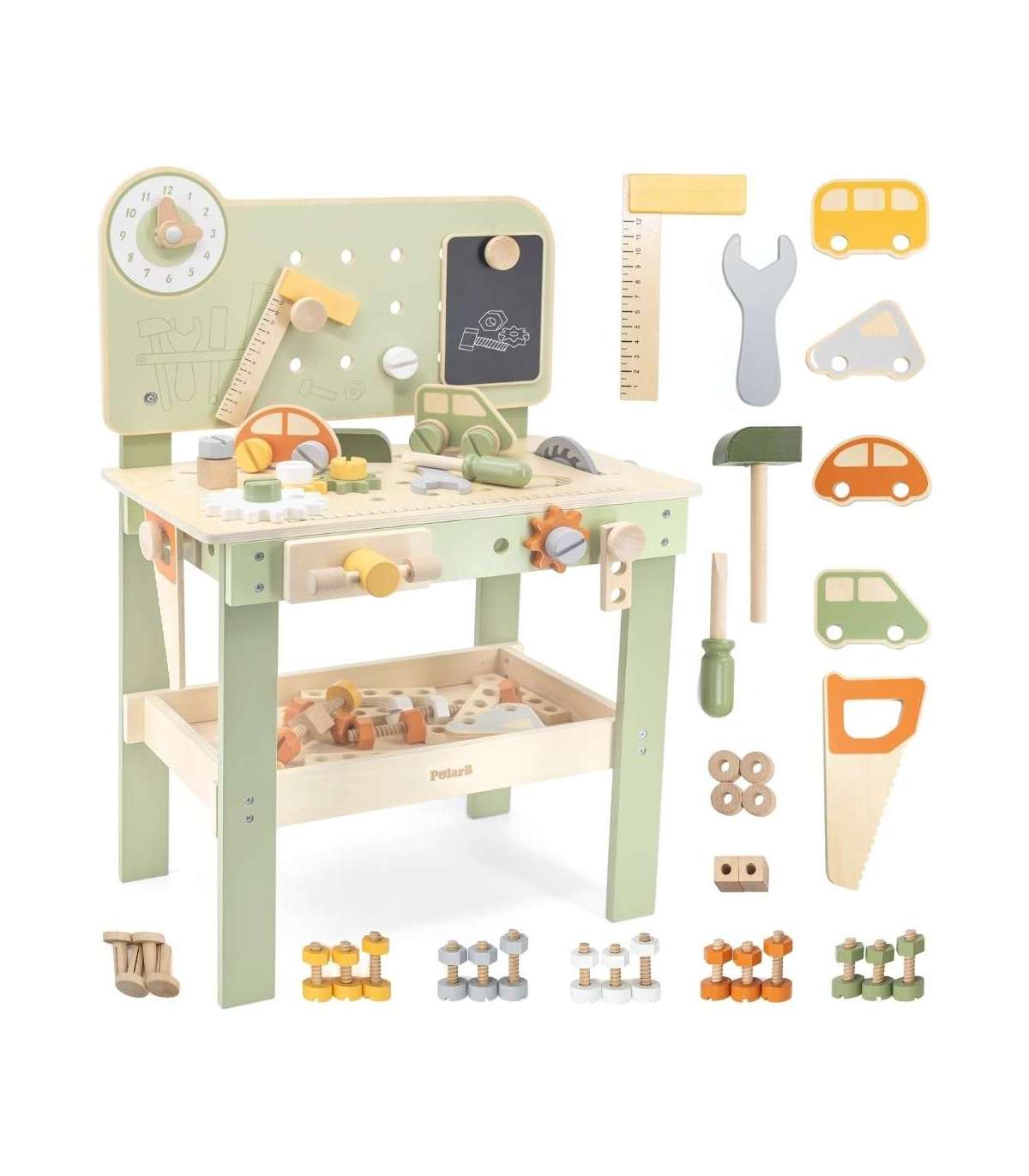 Warsztat majsterkowicza od marki Viga Toys z ekskluzywnej serii PolarB pozwoli poczuć się Twojemu dziecku jak prawdziwy mechanik. Dziecko może wbijać gwoździe, dokręcać śruby kluczem, a także przykręcać drewniane deski i zębatki do stołu warsztatowego. Zabawka posiada zegar ze wskazówkami, drewniane samochodziki oraz różne narzędzia.