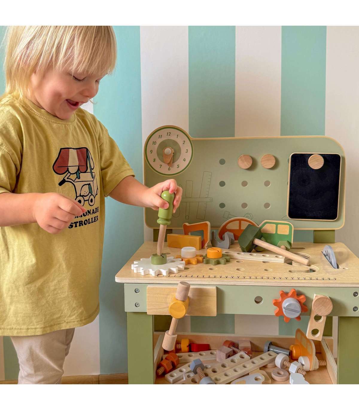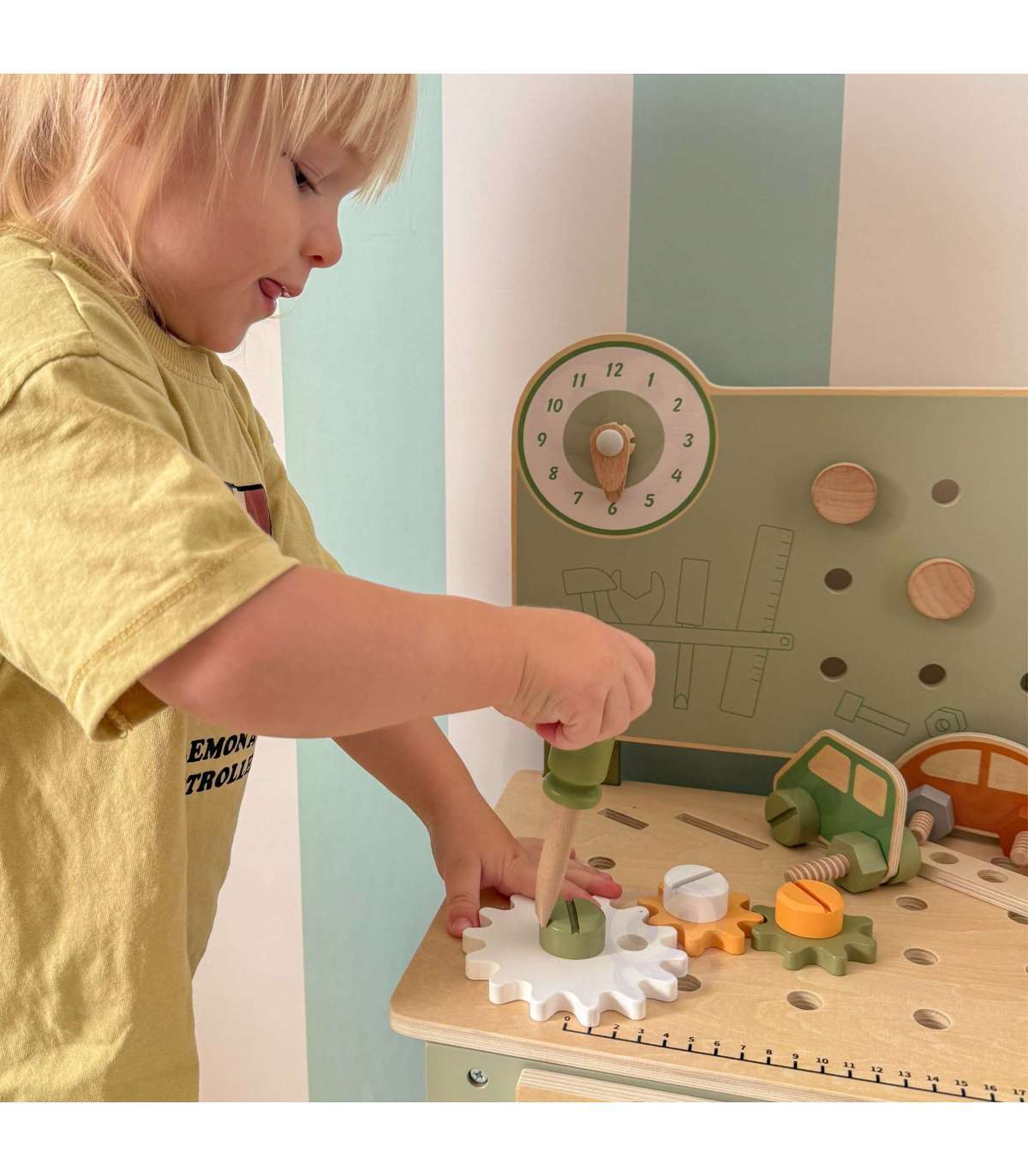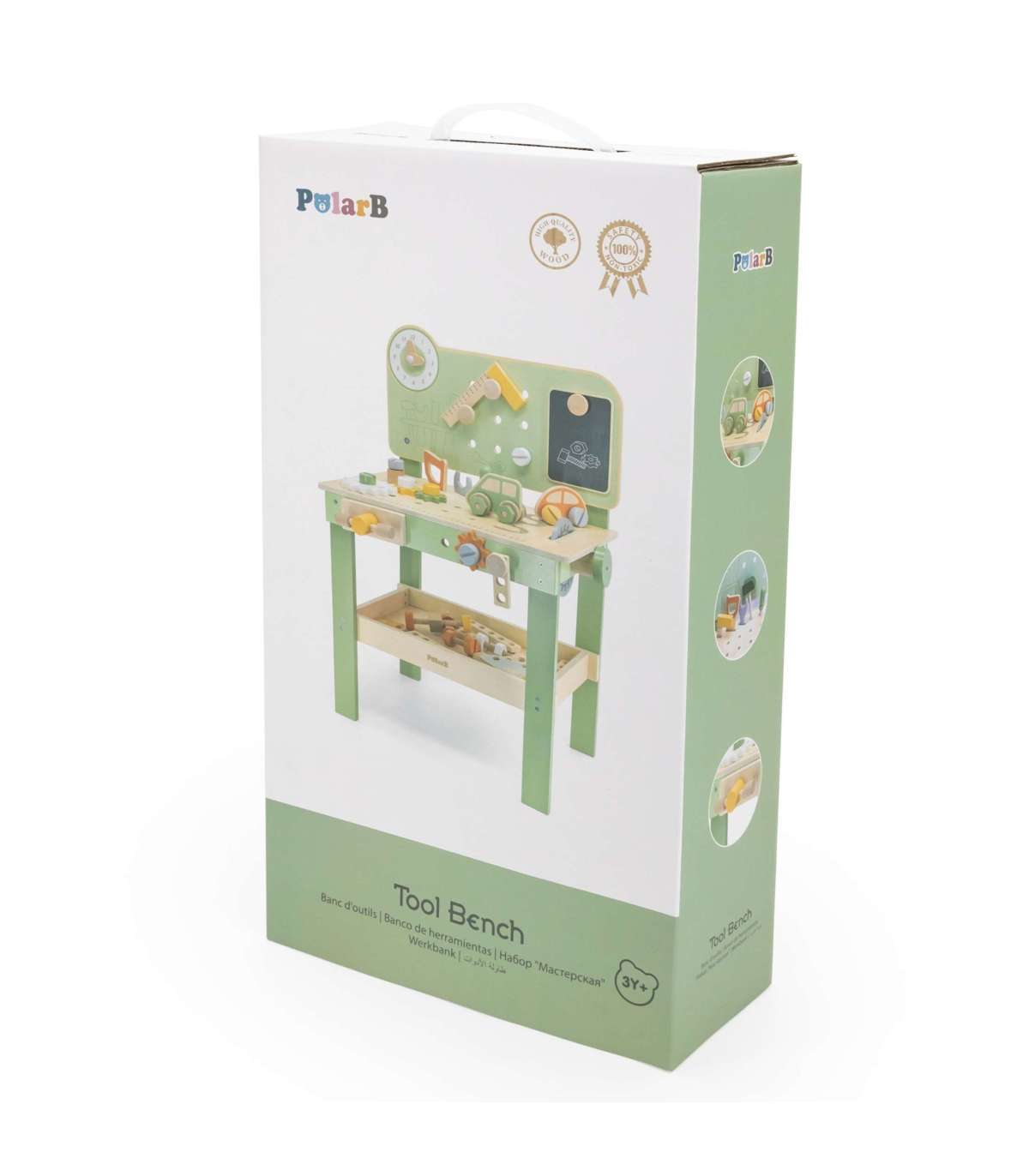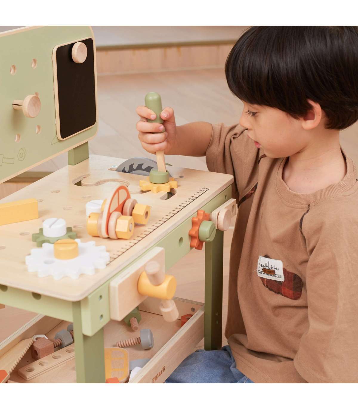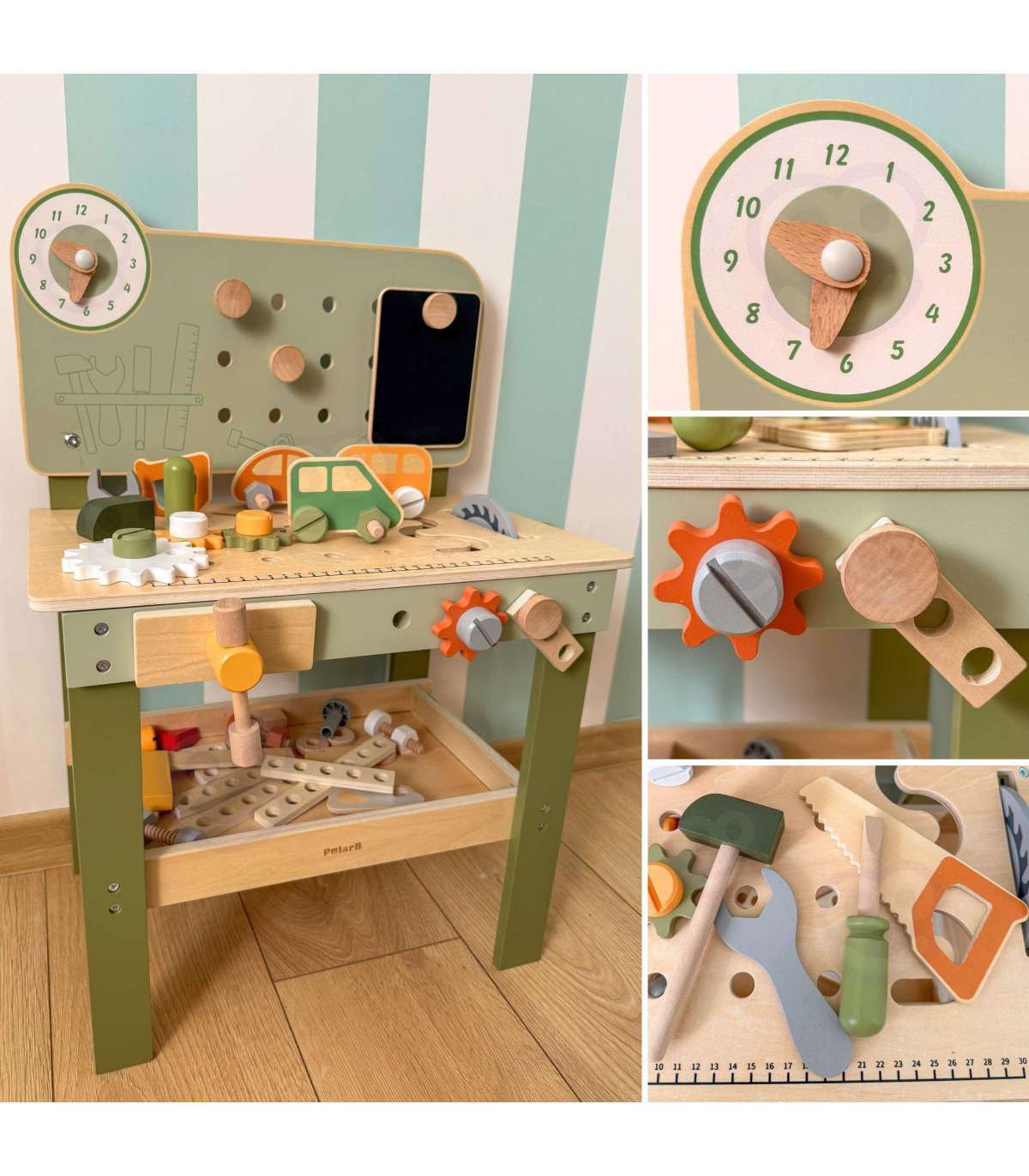 Warsztat majsterkowicza od marki Viga Toys z ekskluzywnej serii PolarB pozwoli poczuć się Twojemu dziecku jak prawdziwy mechanik. Dziecko może wbijać gwoździe, dokręcać śruby kluczem, a także przykręcać drewniane deski i zębatki do stołu warsztatowego. Zabawka posiada zegar ze wskazówkami, drewniane samochodziki oraz różne narzędzia.