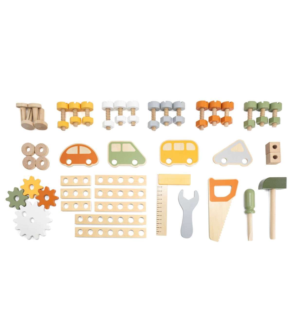 - - zestaw składa się z warsztatu, narzędzi, śrubek, płaskich rysunków zwierząt,