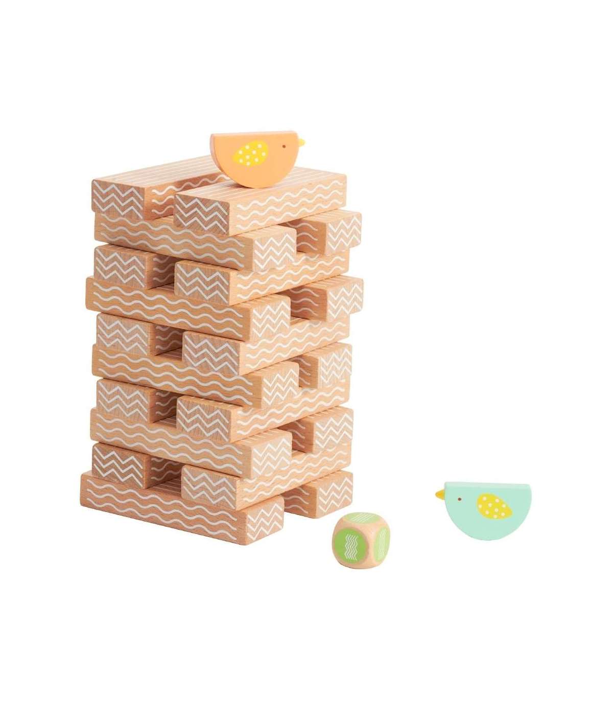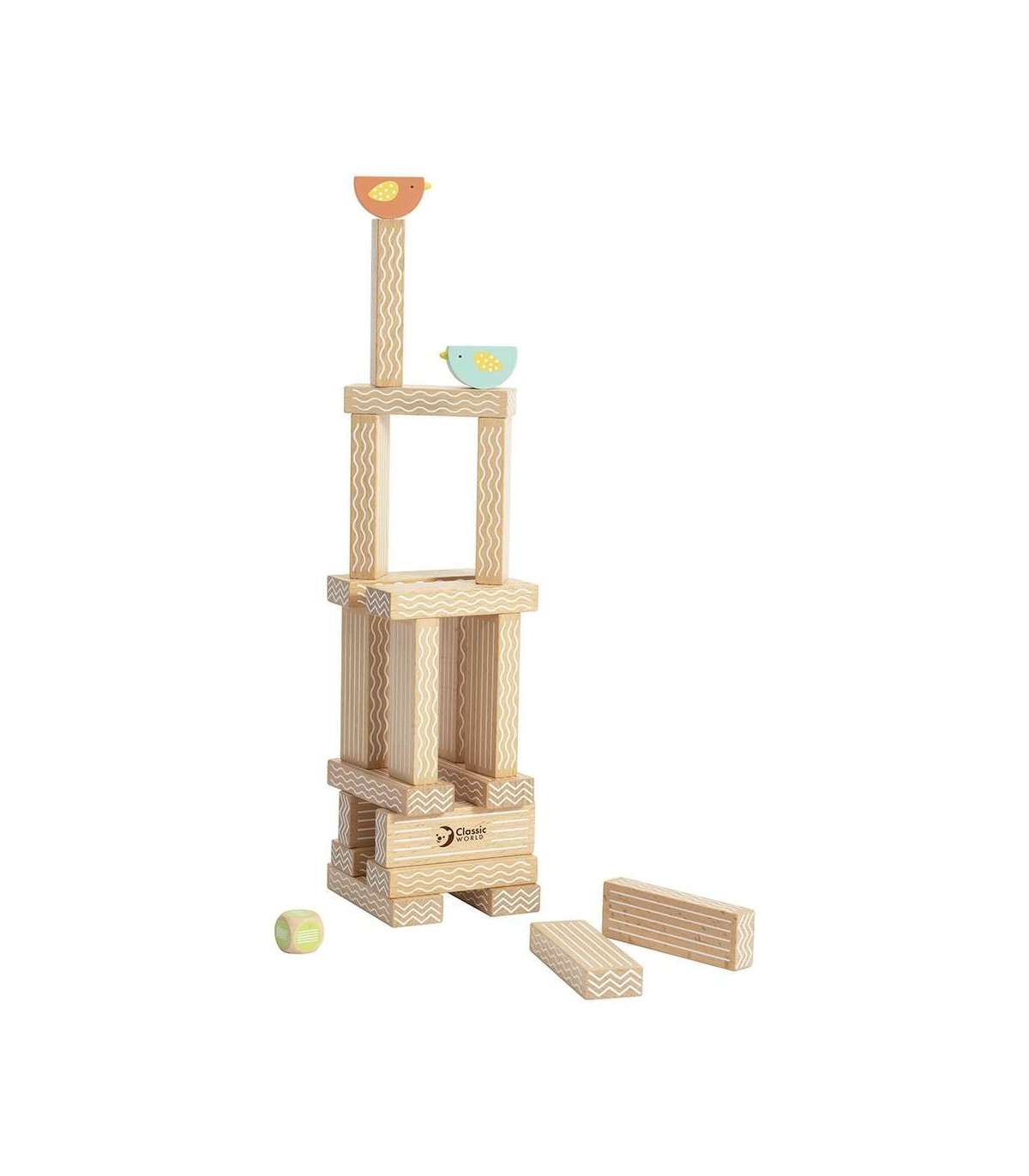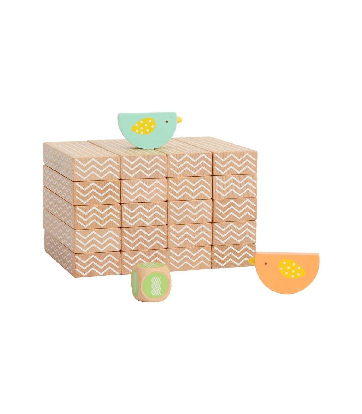 - В комплекте: 20 блоков, 2 птицы и игровой кубик.