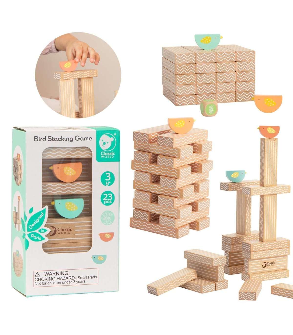 Обучающая игра «Укладка птиц» от бренда CLASSIC WORLD позволяет играть во множество уникальных игр — единственным ограничением является воображение! Игра содержит 20 блоков, 2 птицы и кубик, все изготовлены из букового дерева. Собирайте и смотрите, кто сможет летать выше! Такие игры улучшают коммуникационные навыки, развивают смелость и уверенность в себе у детей!