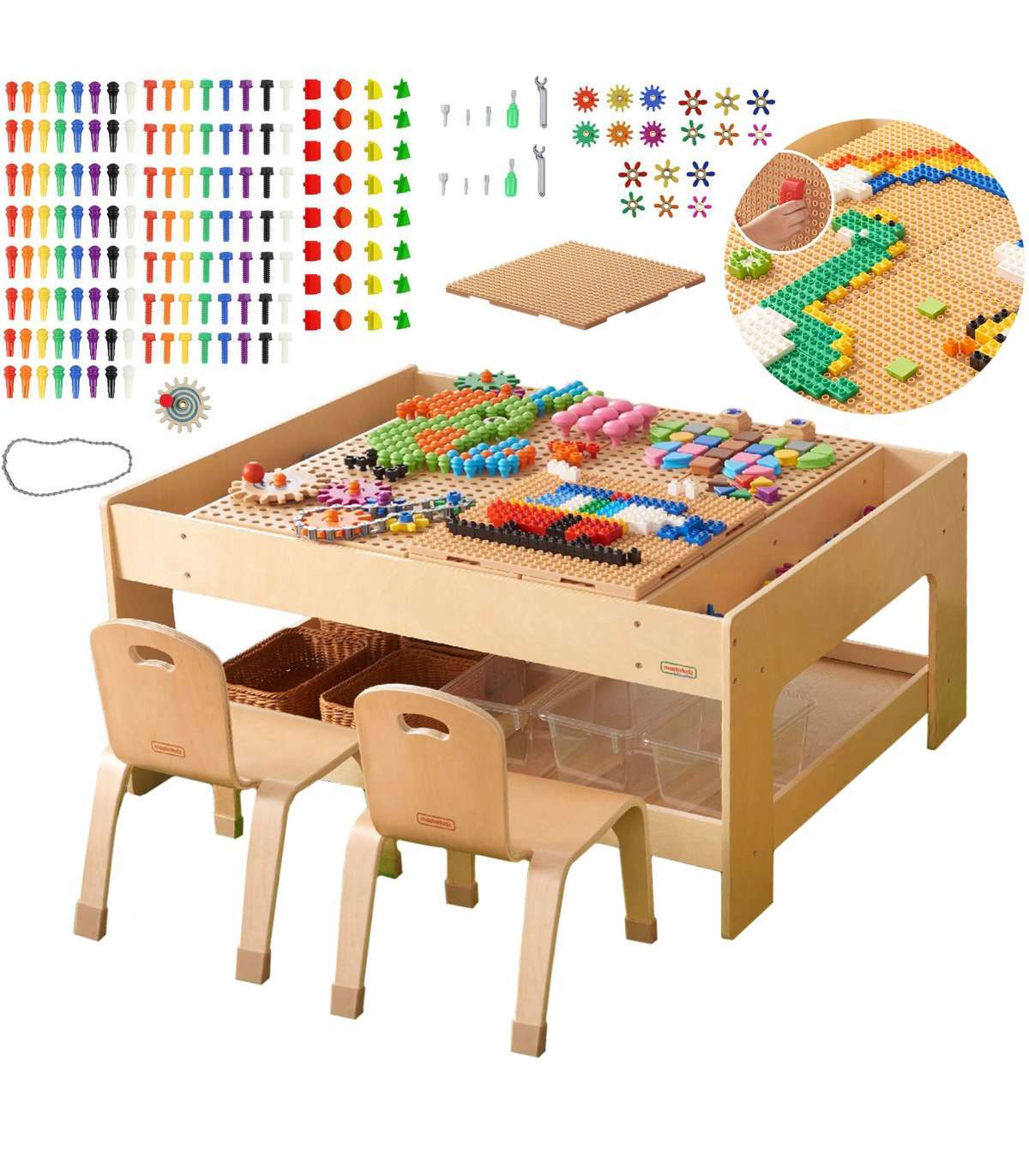 Учебный стол STEM Masterkidz + аксессуары позволяют творчески играть и познавать мир науки. Стол имеет панель с отверстиями, в которые, вставляя цветные и геометрические колышки, винты, шестерёнки, можно создавать красивые узоры. Дополнительно в наборе есть плита размером 39,7 x 39,7 см, которую можно положить на стол, и 135 кубиков для укладки на ней.