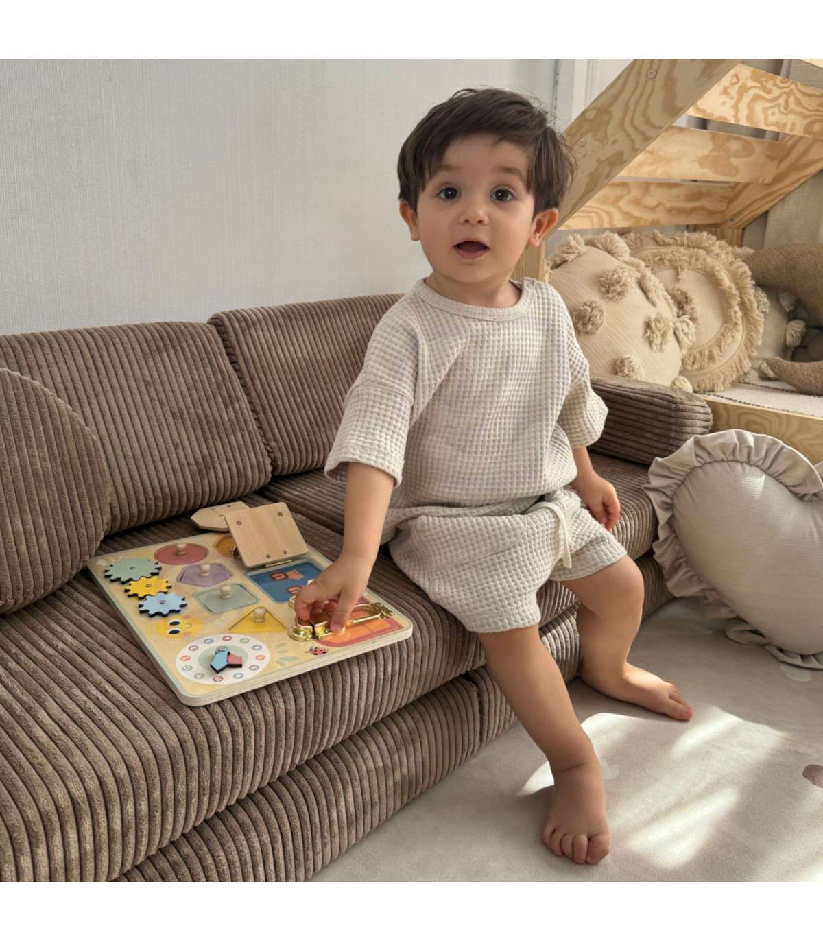 - игрушка имеет много активностей: замки, окошки, шестерёнки, пазл, часы