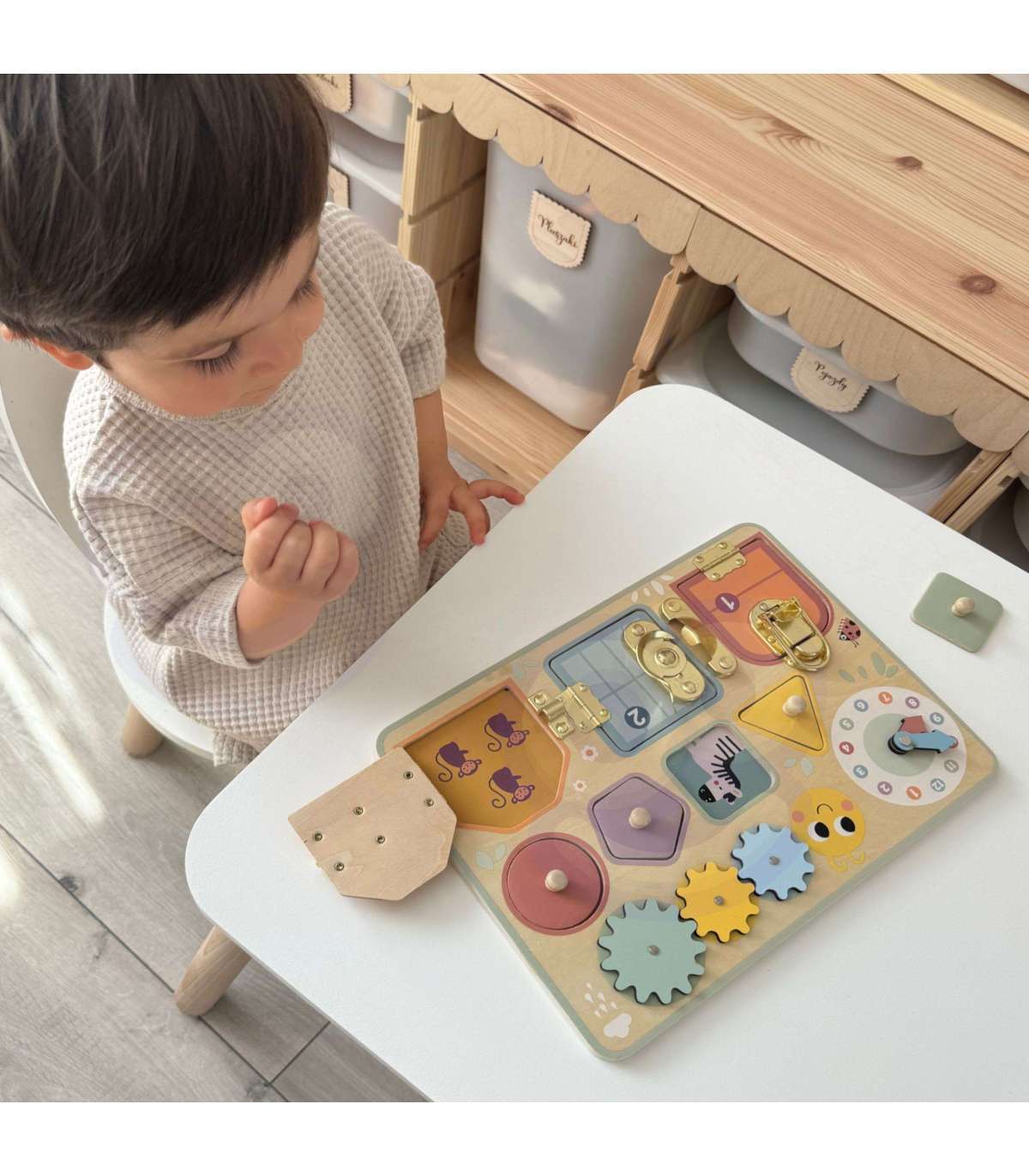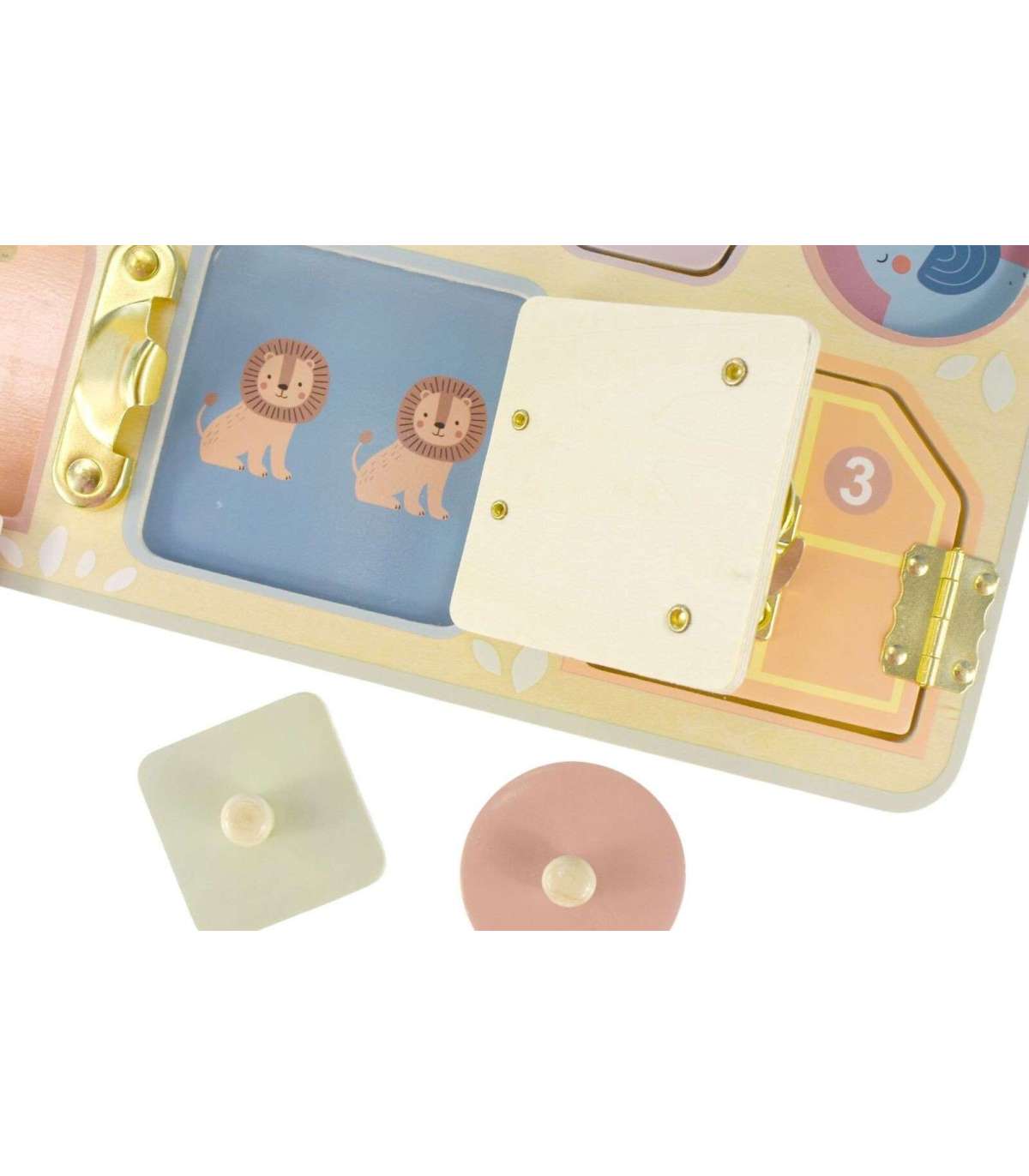 Табличка состоит из прочной деревянной панели, на которой расположены три разных замка. За ними скрываются милые картинки с животными, которые дополнительно вдохновляют воображение малыша. Кроме того, табличка оснащена интерактивными шестерёнками, которые добавляют ещё больше веселья. Ребёнок может свободно крутить их, развивая моторные навыки и формируя восприятие света и тени.