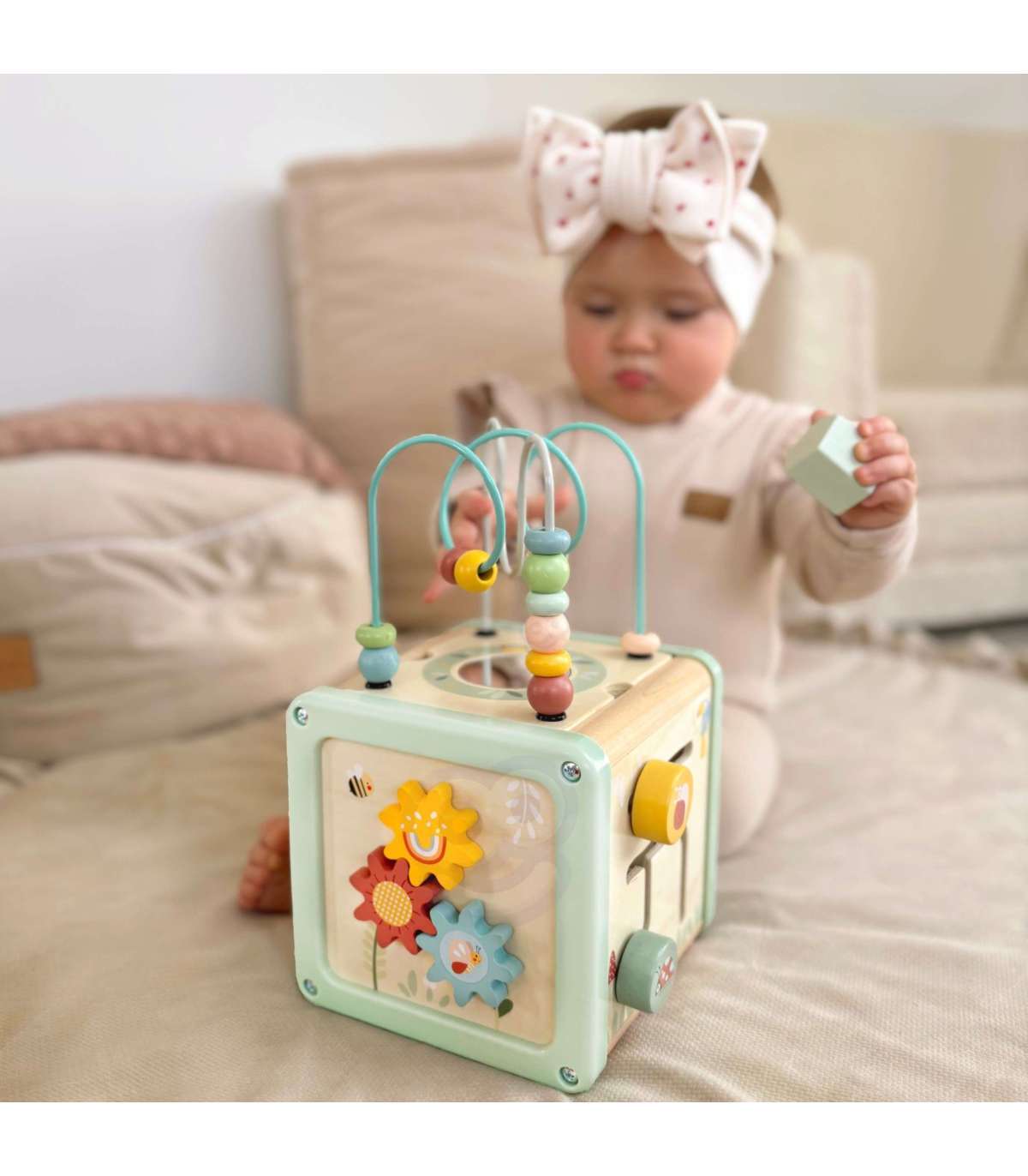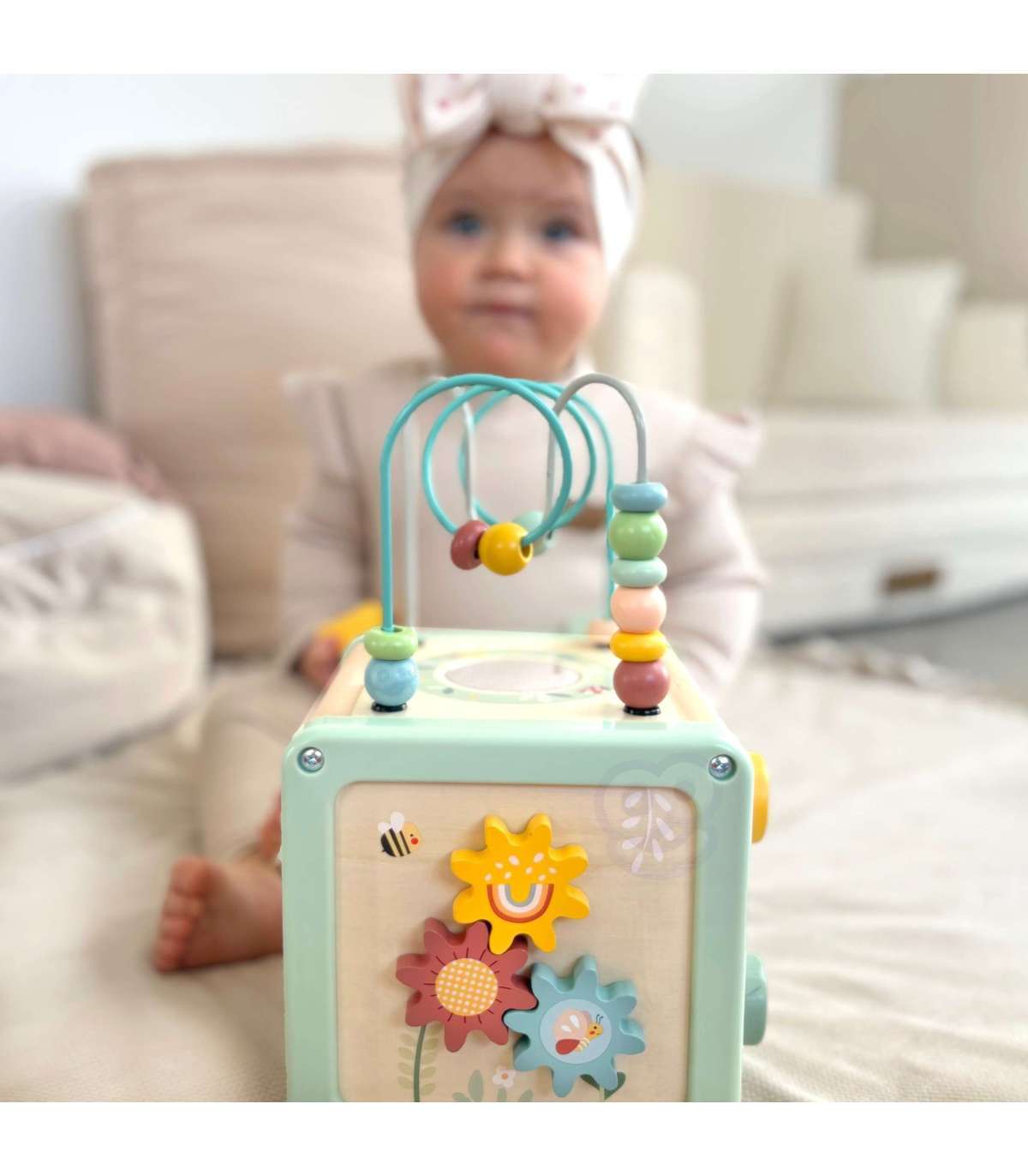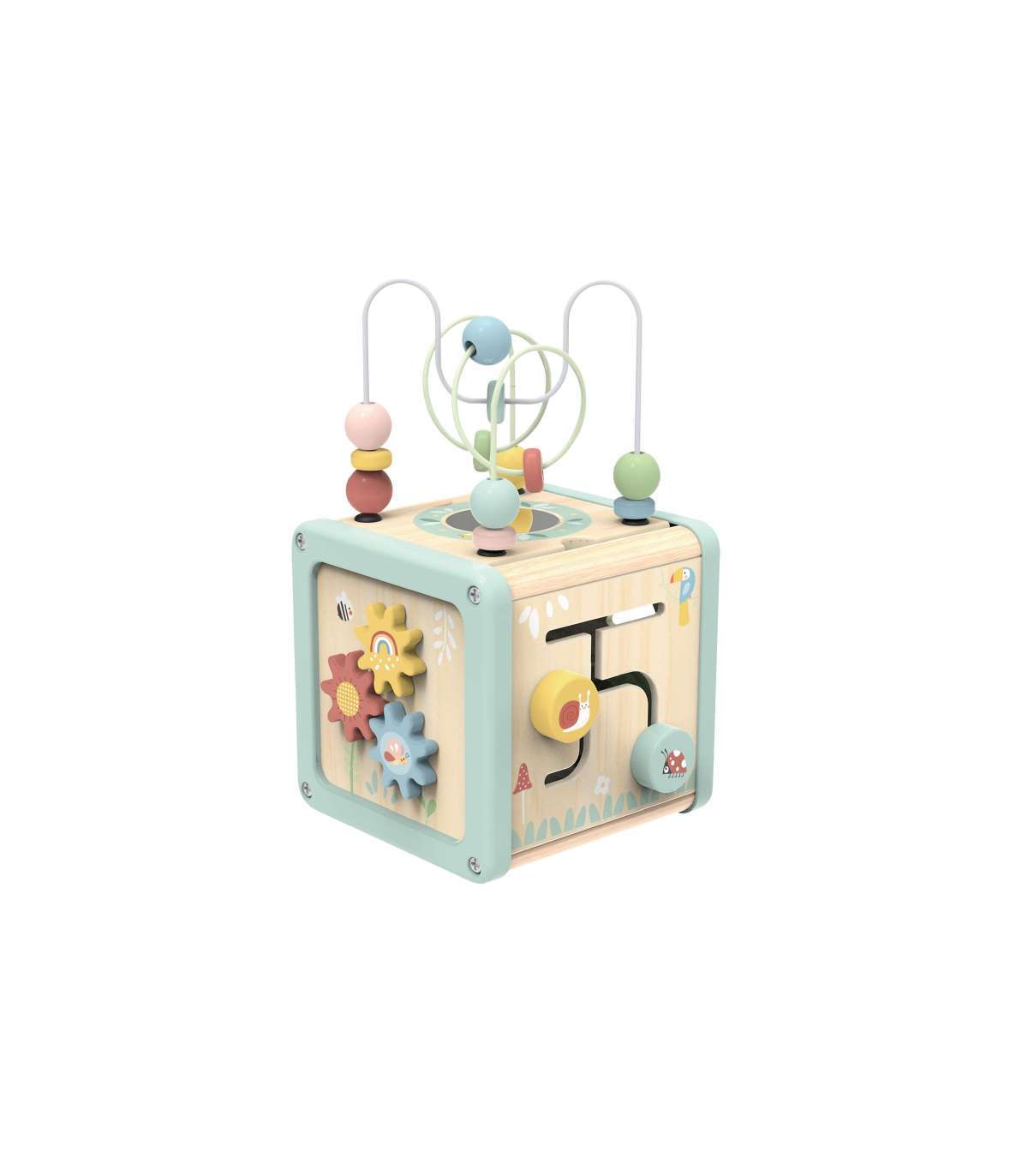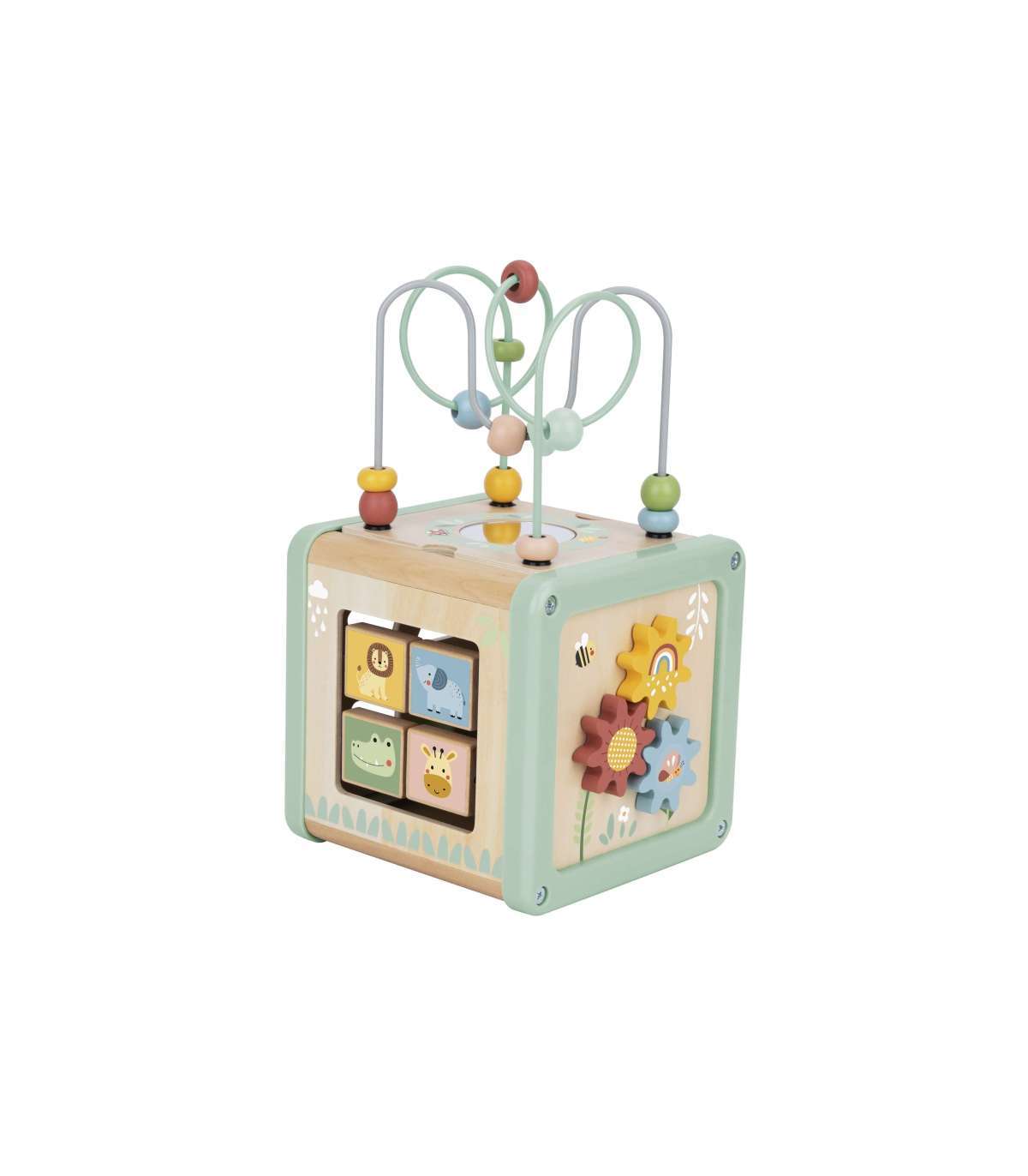 Деревянный кубик активности от бренда WOOPIE GREEN — это фантастический развивающий набор, который порадует малыша и поможет в освоении базовых навыков. Благодаря многогранным панелям, предлагающим разнообразные игры, ребёнок сможет исследовать шестерёнки, кубики, сортировщики, ползунки и лабиринт с бусинами. Всё это в мягких пастельных цветах, которые привлекают внимание и побуждают к игре.