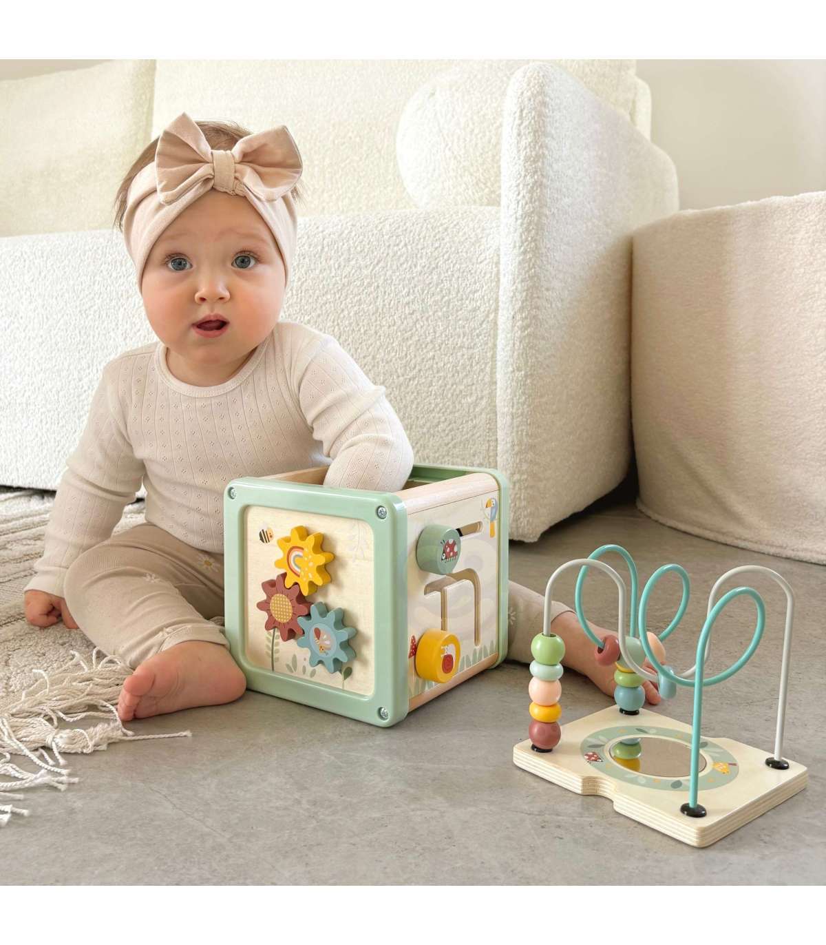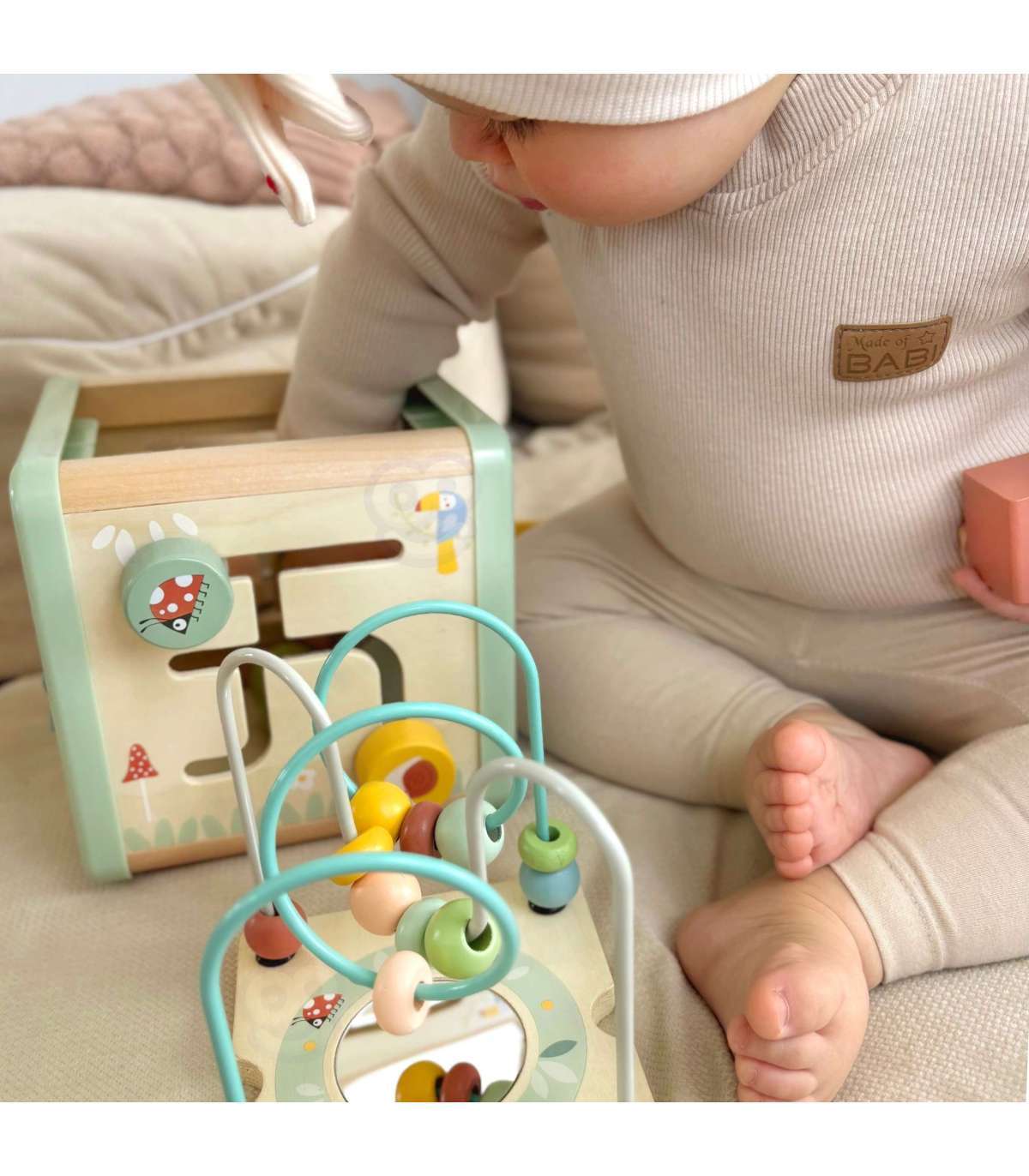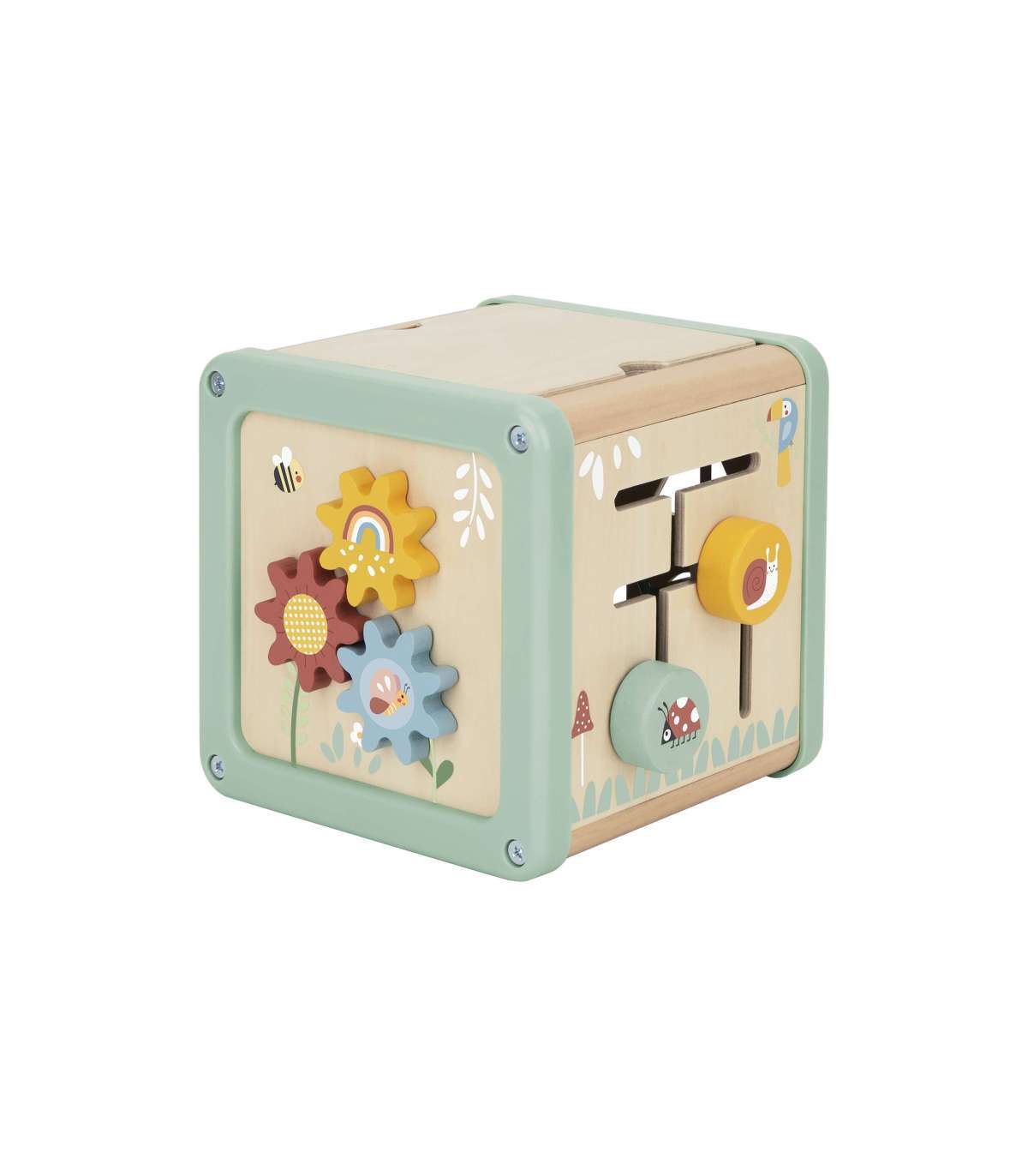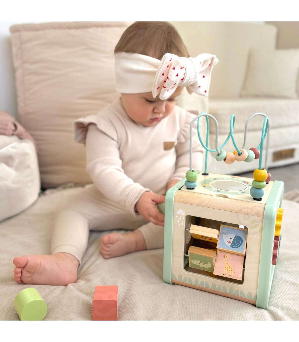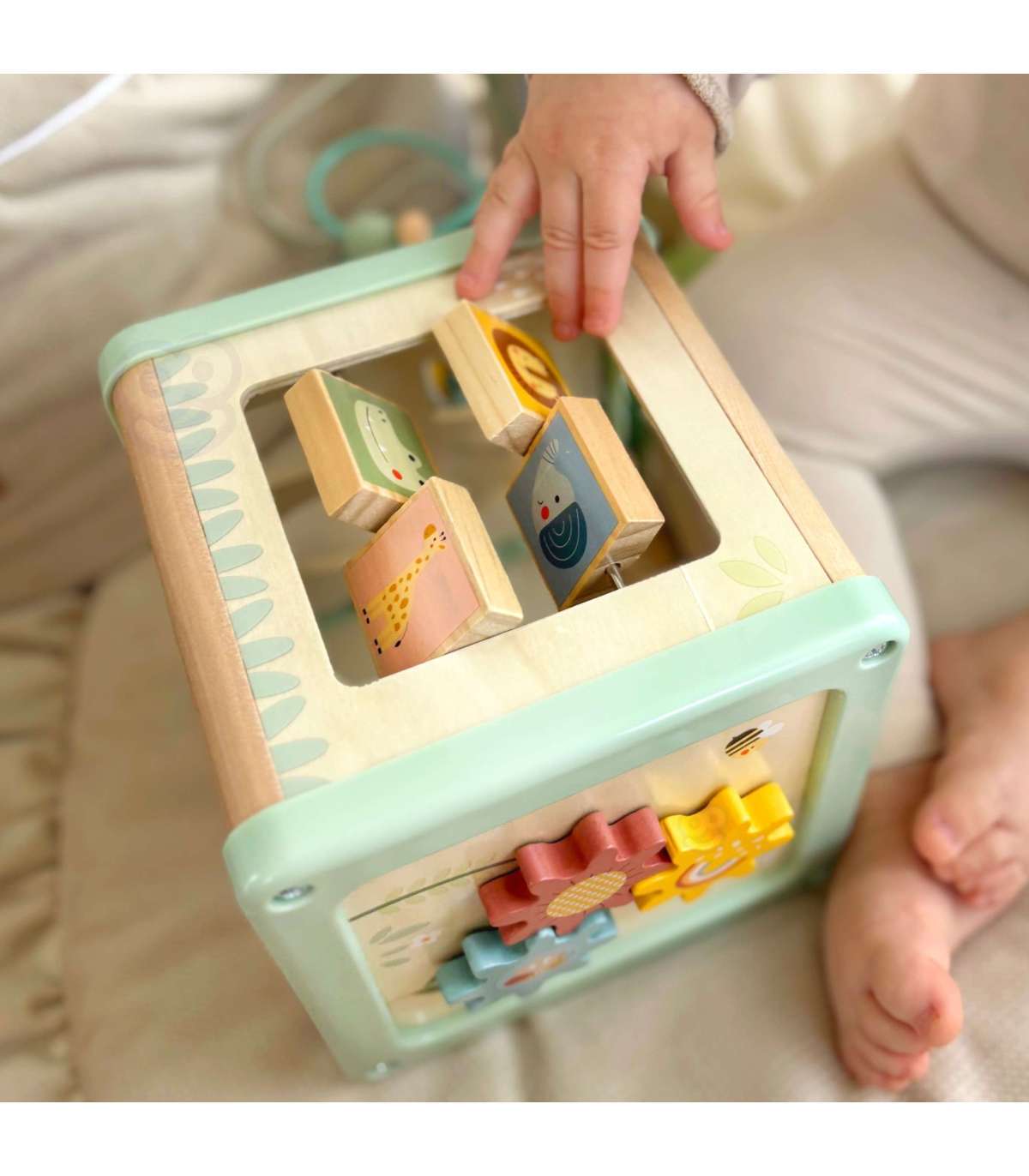Деревянный кубик активности от бренда WOOPIE GREEN — это фантастический развивающий набор, который порадует малыша и поможет в освоении базовых навыков. Благодаря многогранным панелям, предлагающим разнообразные игры, ребёнок сможет исследовать шестерёнки, кубики, сортировщики, ползунки и лабиринт с бусинами. Всё это в мягких пастельных цветах, которые привлекают внимание и побуждают к игре.