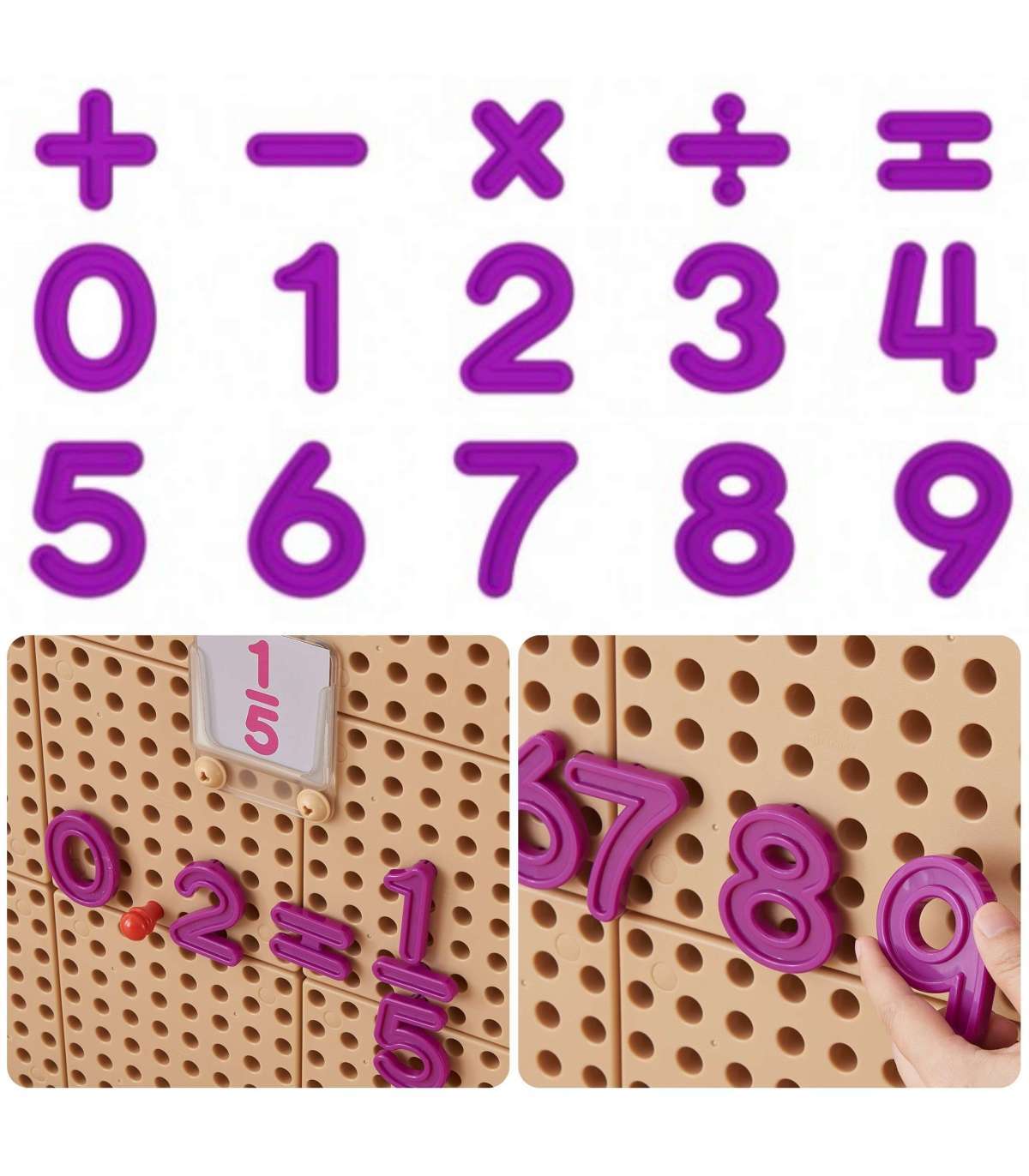 Zestaw Cyferek 82 Elementów Do Nauki Liczenia to komplet, który jest doskonałym narzędziem do nauki matematyki dla dzieci. Zawiera 40 cyfr oraz symbole działań matematycznych i równania, co umożliwia tworzenie prostych działań arytmetycznych. Elementy zestawu są odpowiednio duże, co sprawia, że łatwo je trzymać i dopasowywać, a ich fioletowy kolor przyciąga uwagę. Zestaw doskonale pasuje do ścianek STEM. Pomaga w nauce liczenia, rozumienia liczb i wykonywania podstawowych działań matematycznych, takich jak dodawanie, odejmowanie, mnożenie i dzielenie. To świetne narzędzie do wspierania rozwoju umiejętności matematycznych u młodych uczniów.